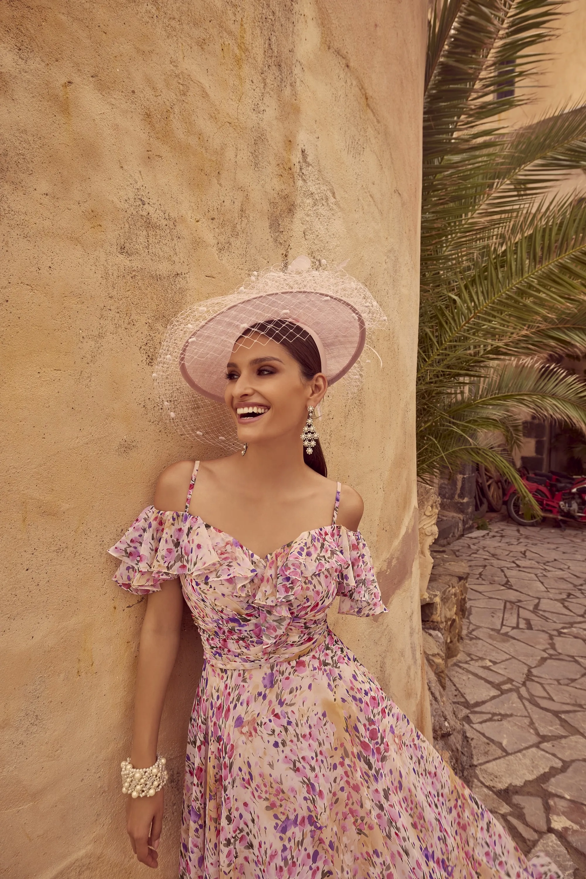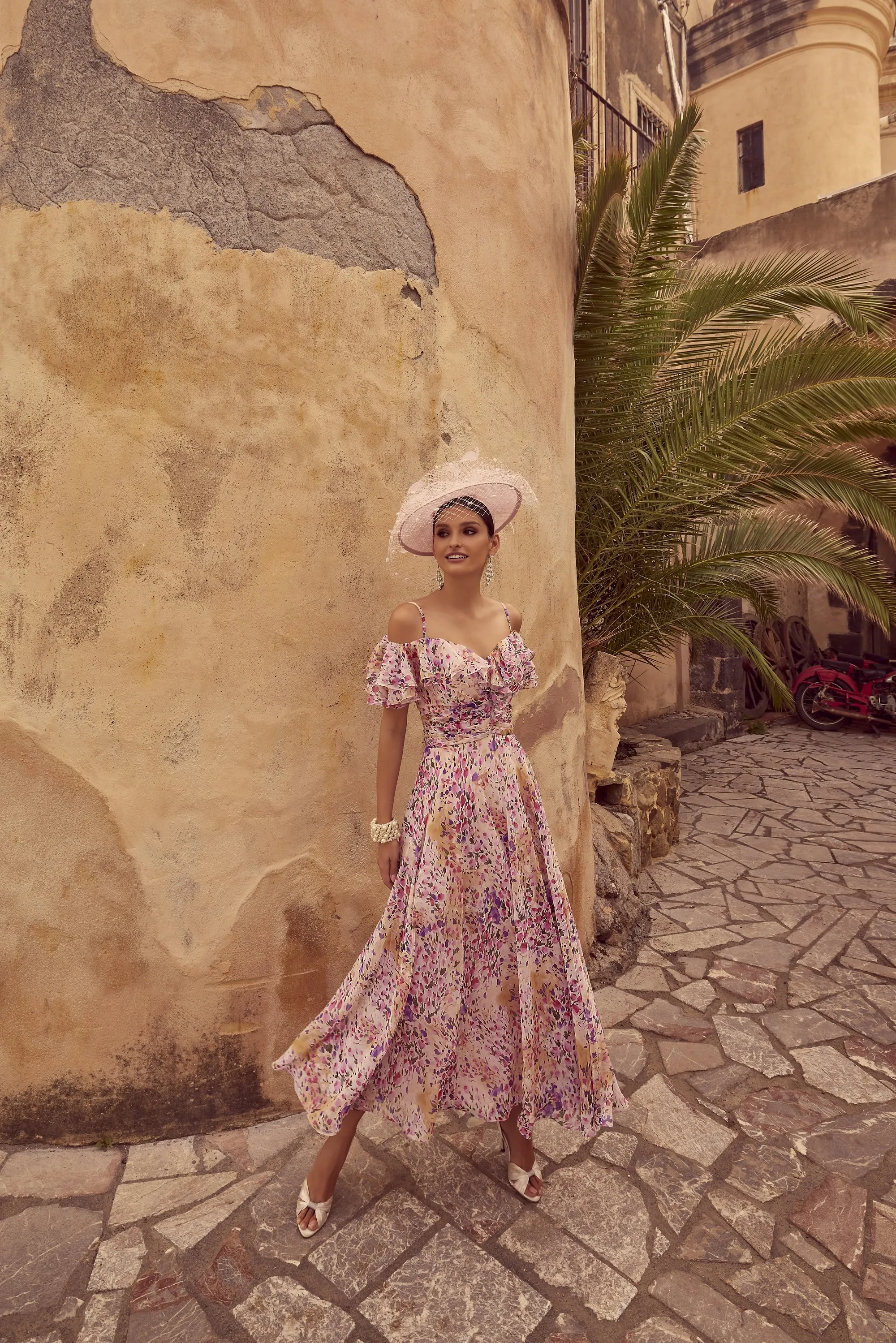 An ankle length A-line chiffon dress with a cold shoulder and ruffle bodice detailing.