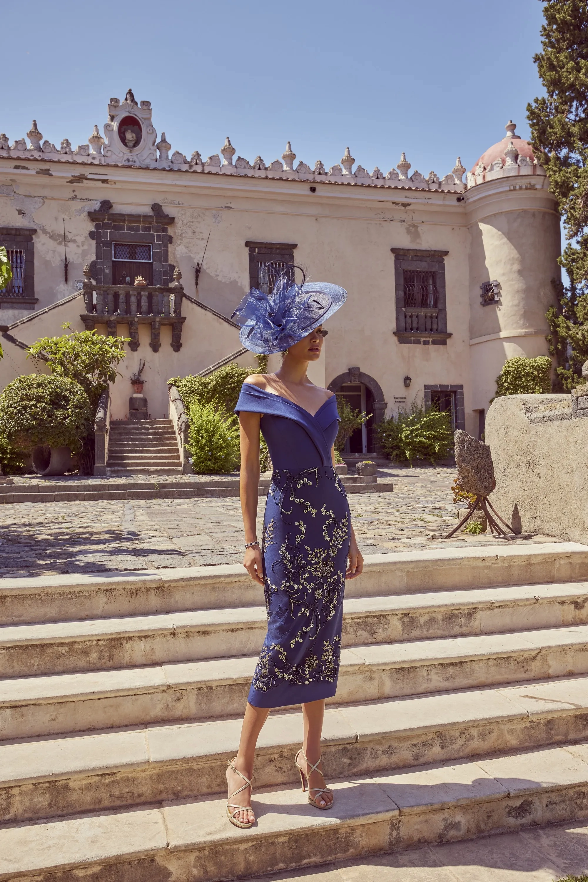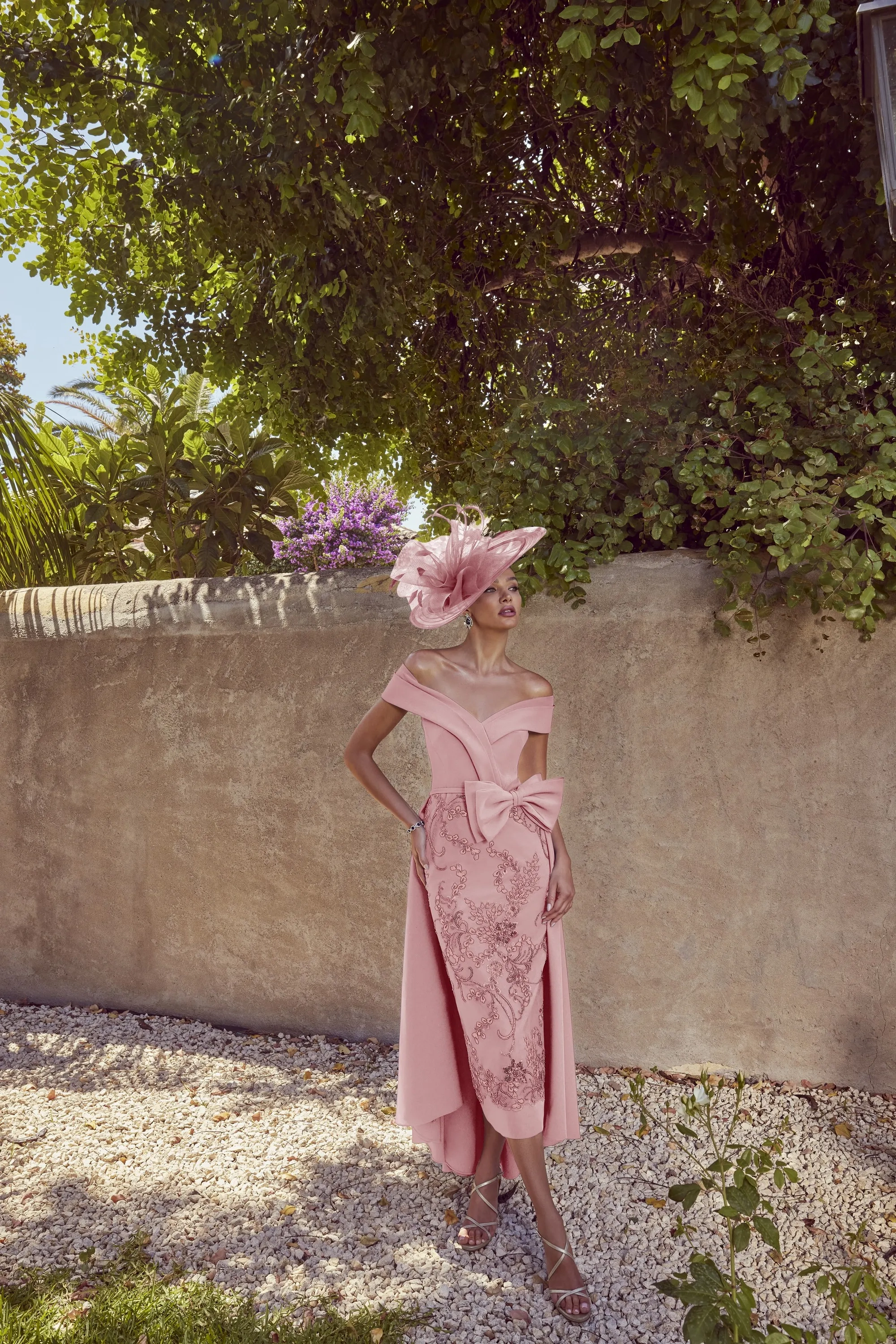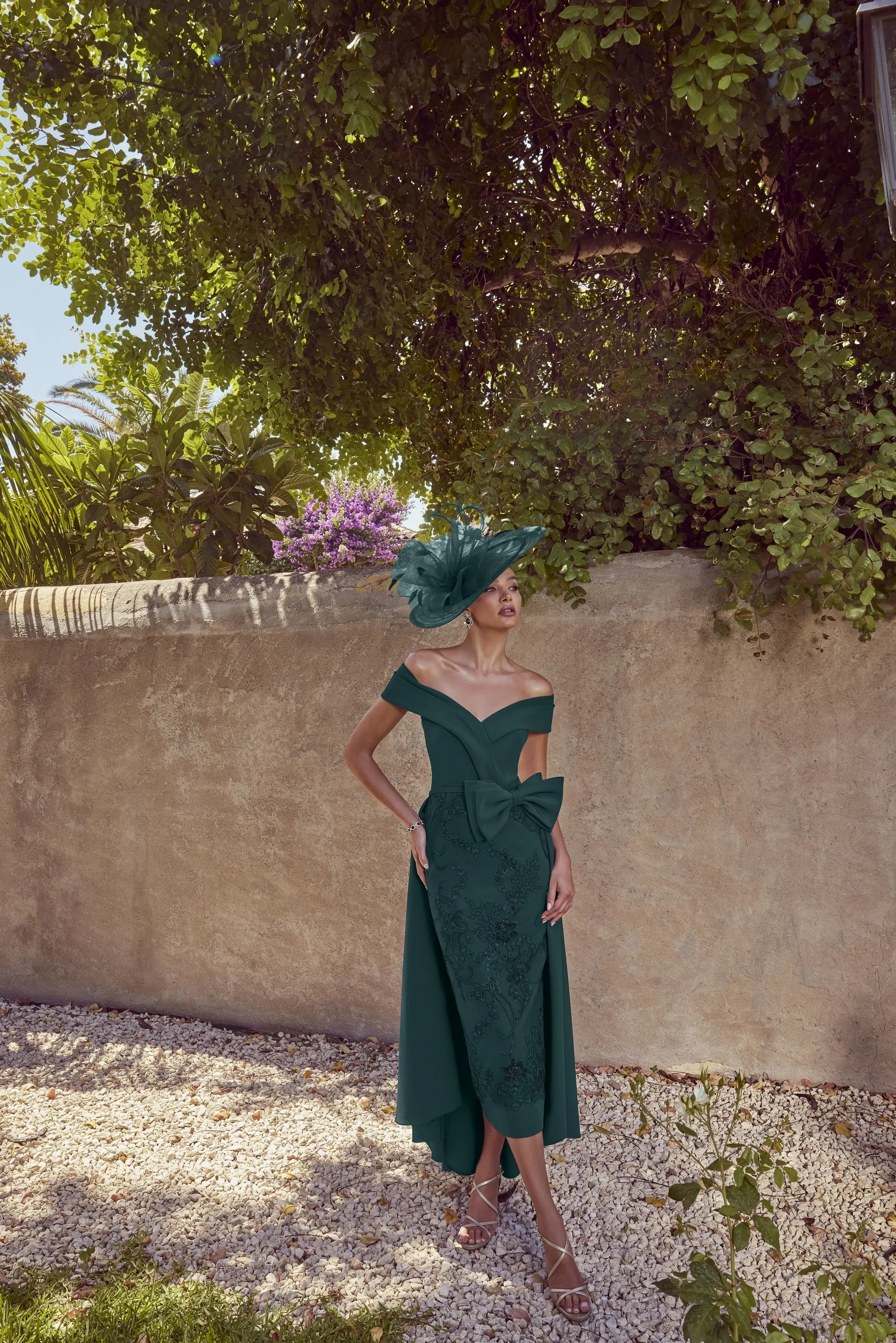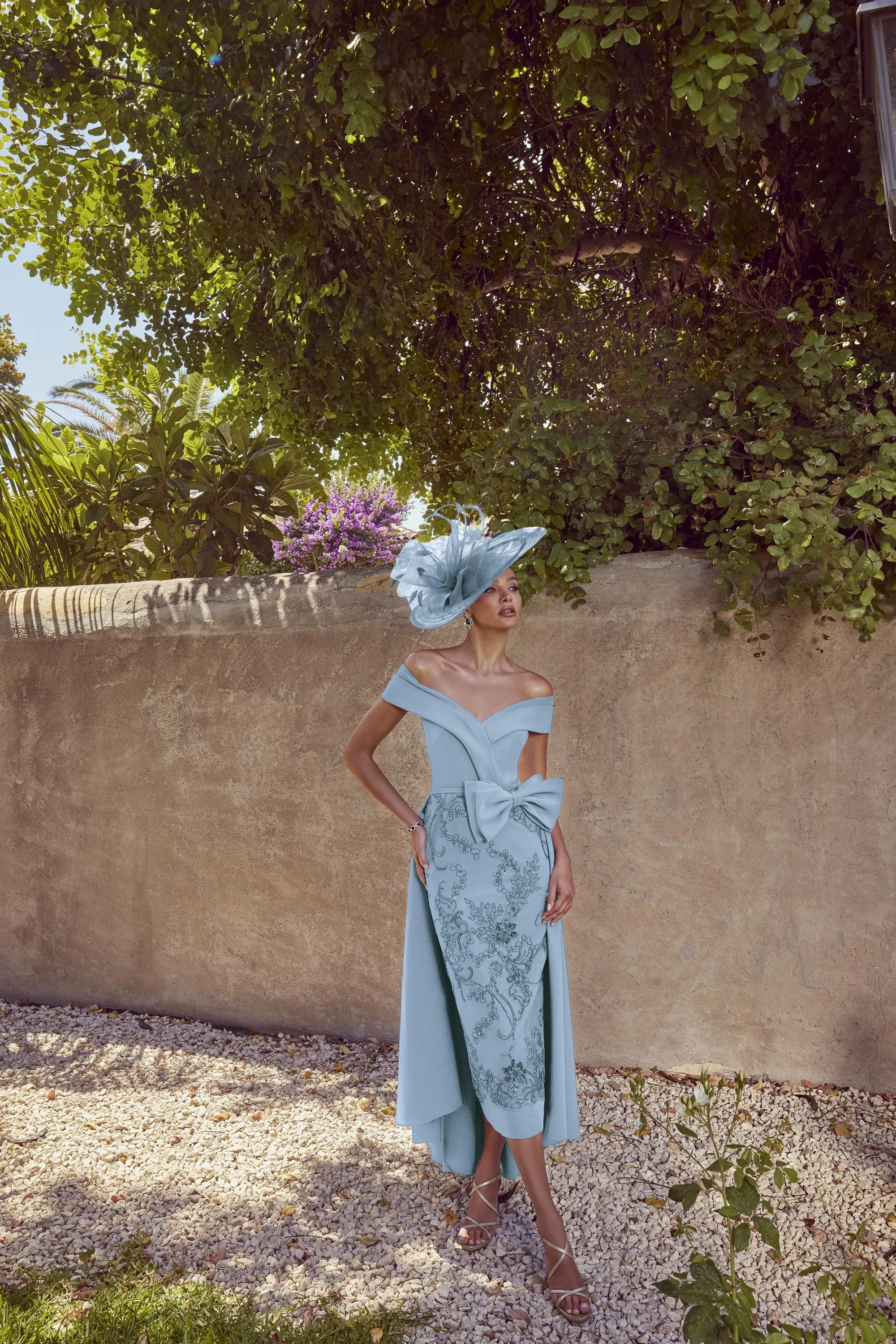 A unique fit and flare full-length dress with floral lace appliques. Featuring a detachable half overskirt for movement and bow motif