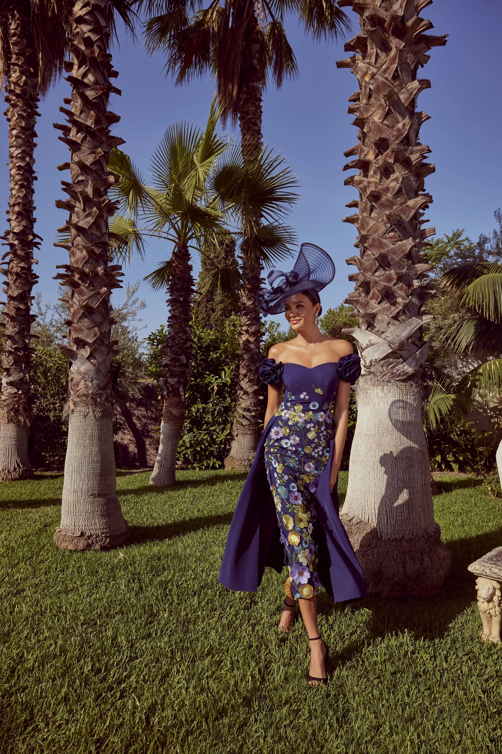 A unique fit and flare full-length dress with floral lace appliques. Featuring a half overskirt for movement and ruffle flower cap sleeve motifs.