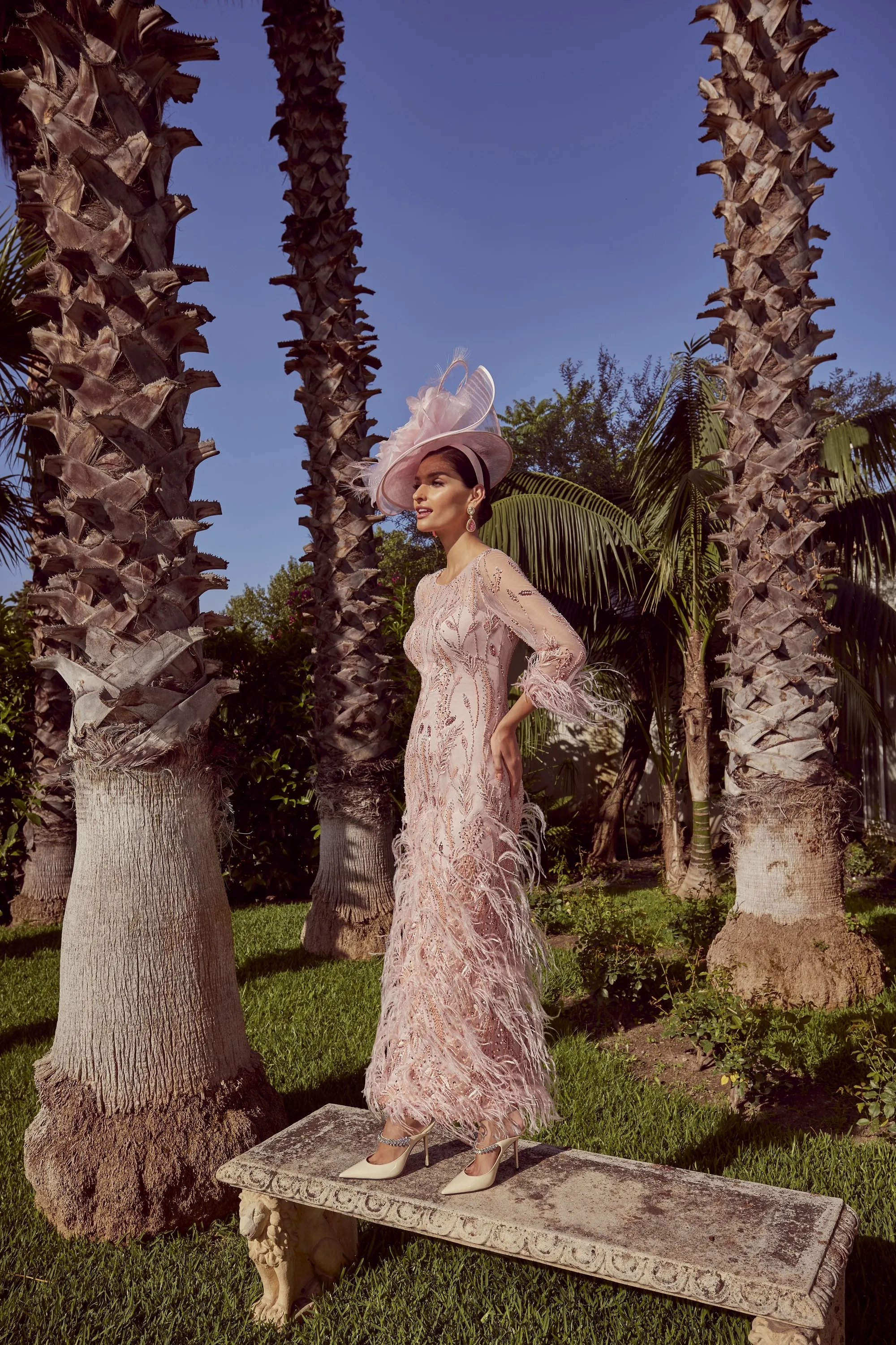 A full-length beaded tulle dress, decorated in lace and feather motifs on the sleeves and skirt. 992406AL is the long version
