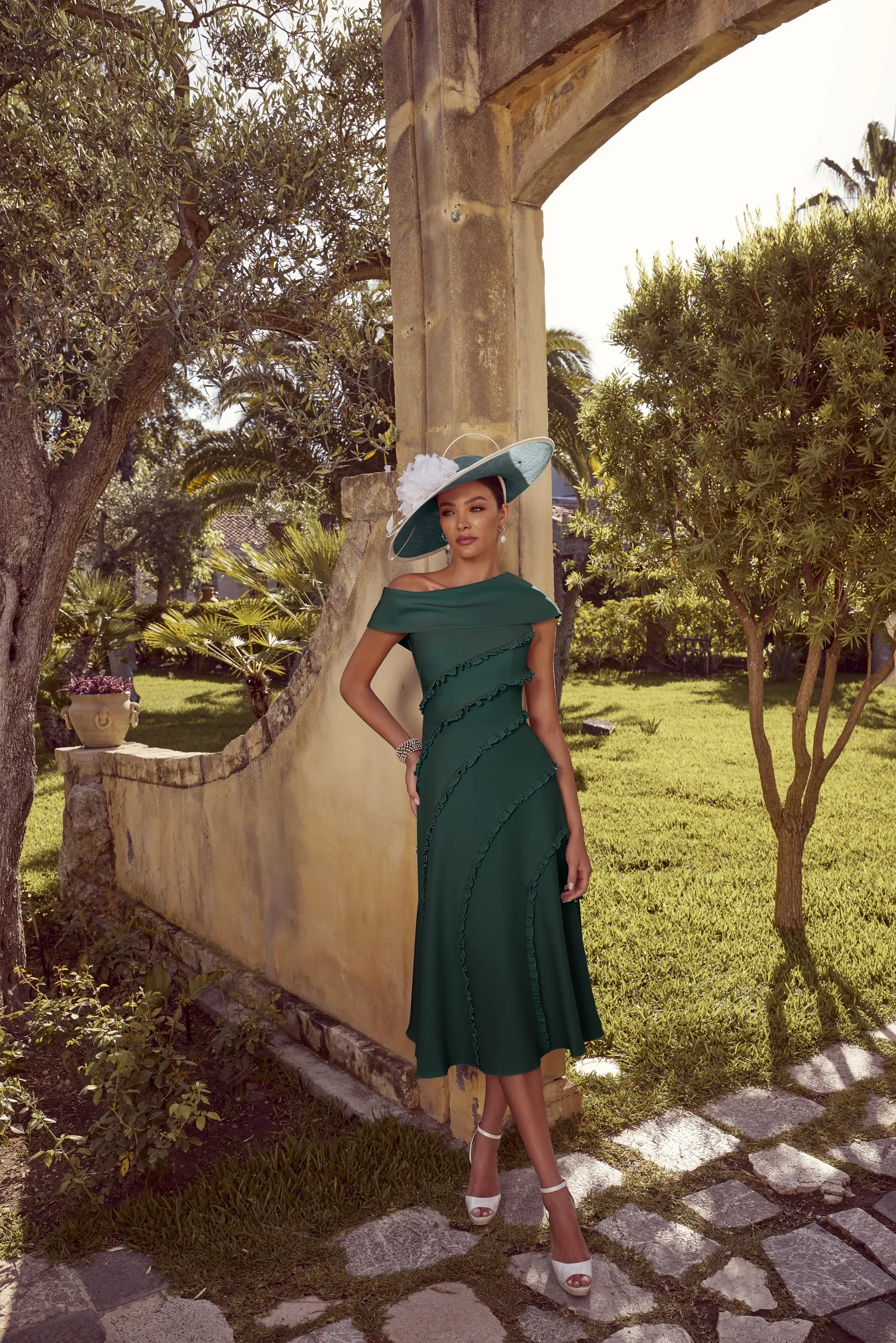 A modern crepe A-line dress with unique ruffle detail. Complete with a asymmetrical one shoulder neckline.