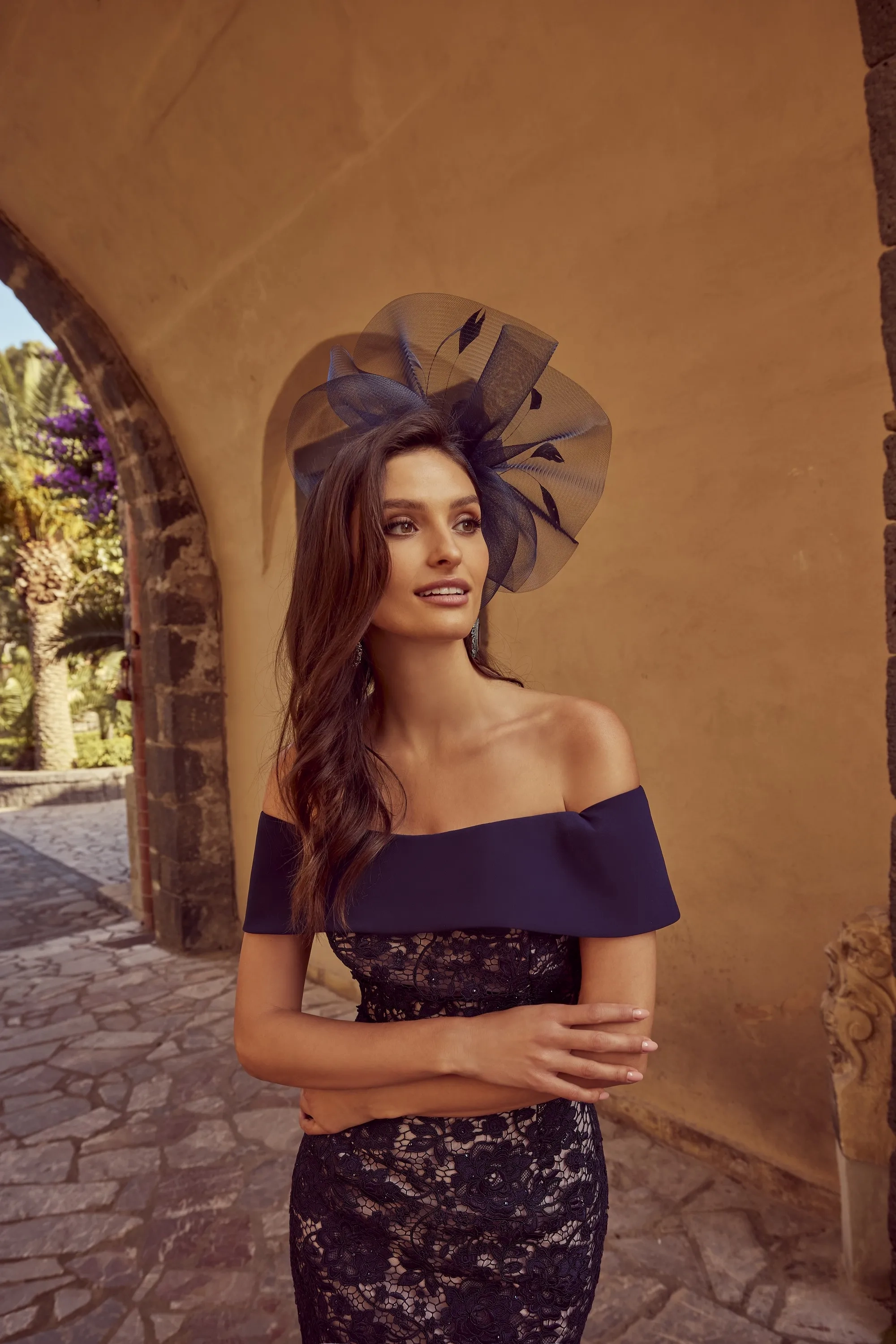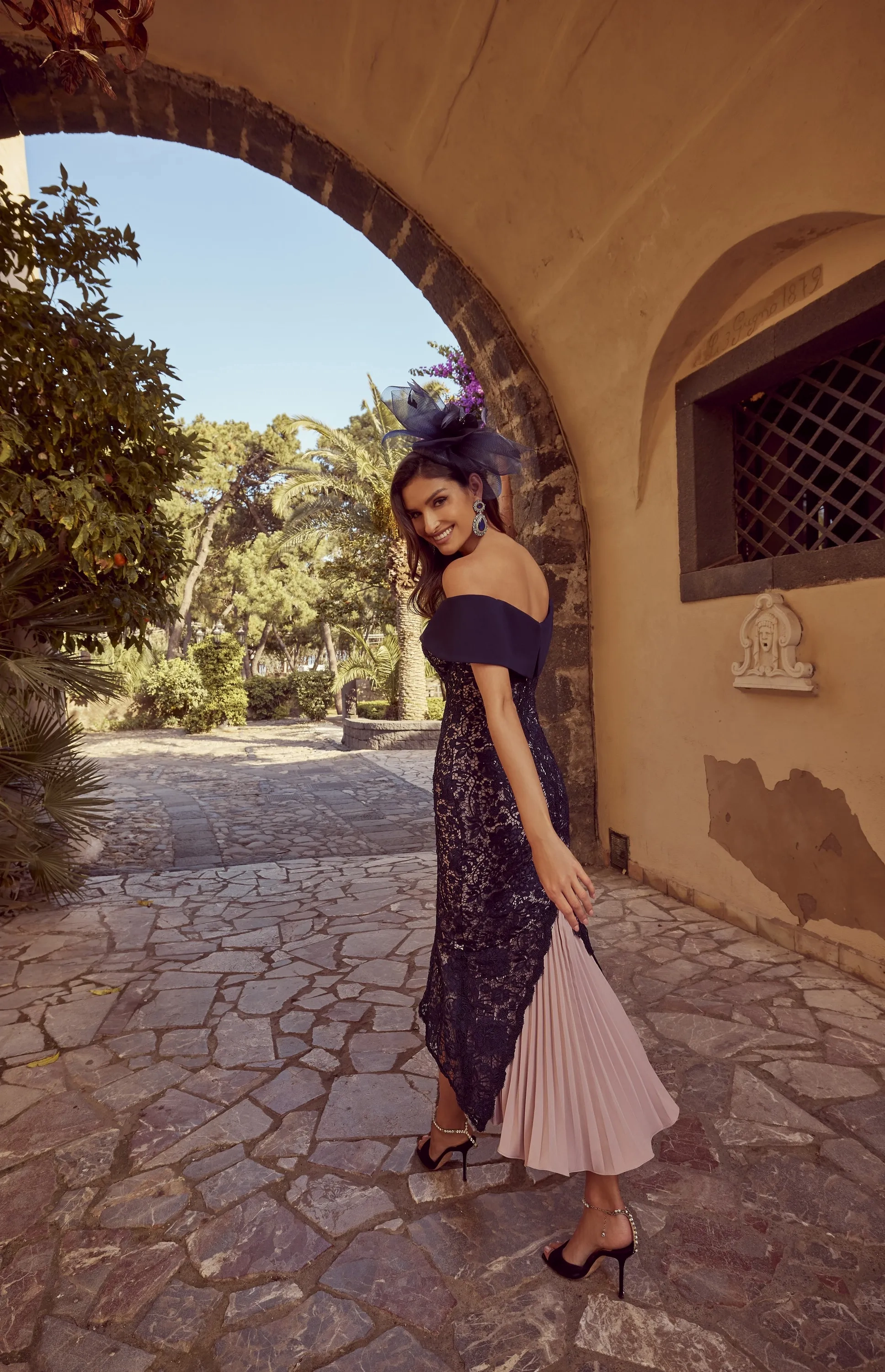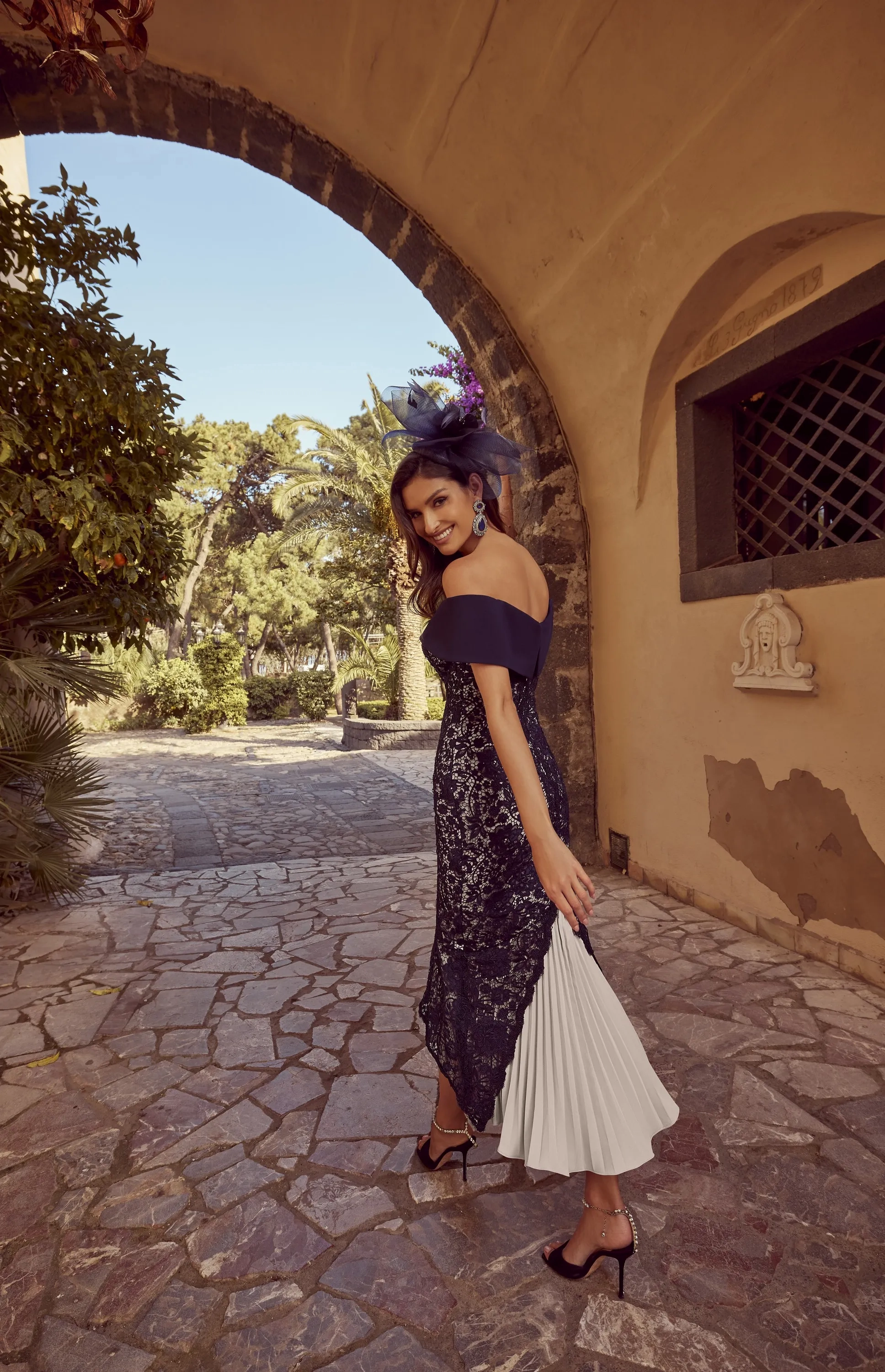 A fitted fishtail lace dress, featuring a high-low hemline and contrasting off the shoulder neckline with cap sleeves.