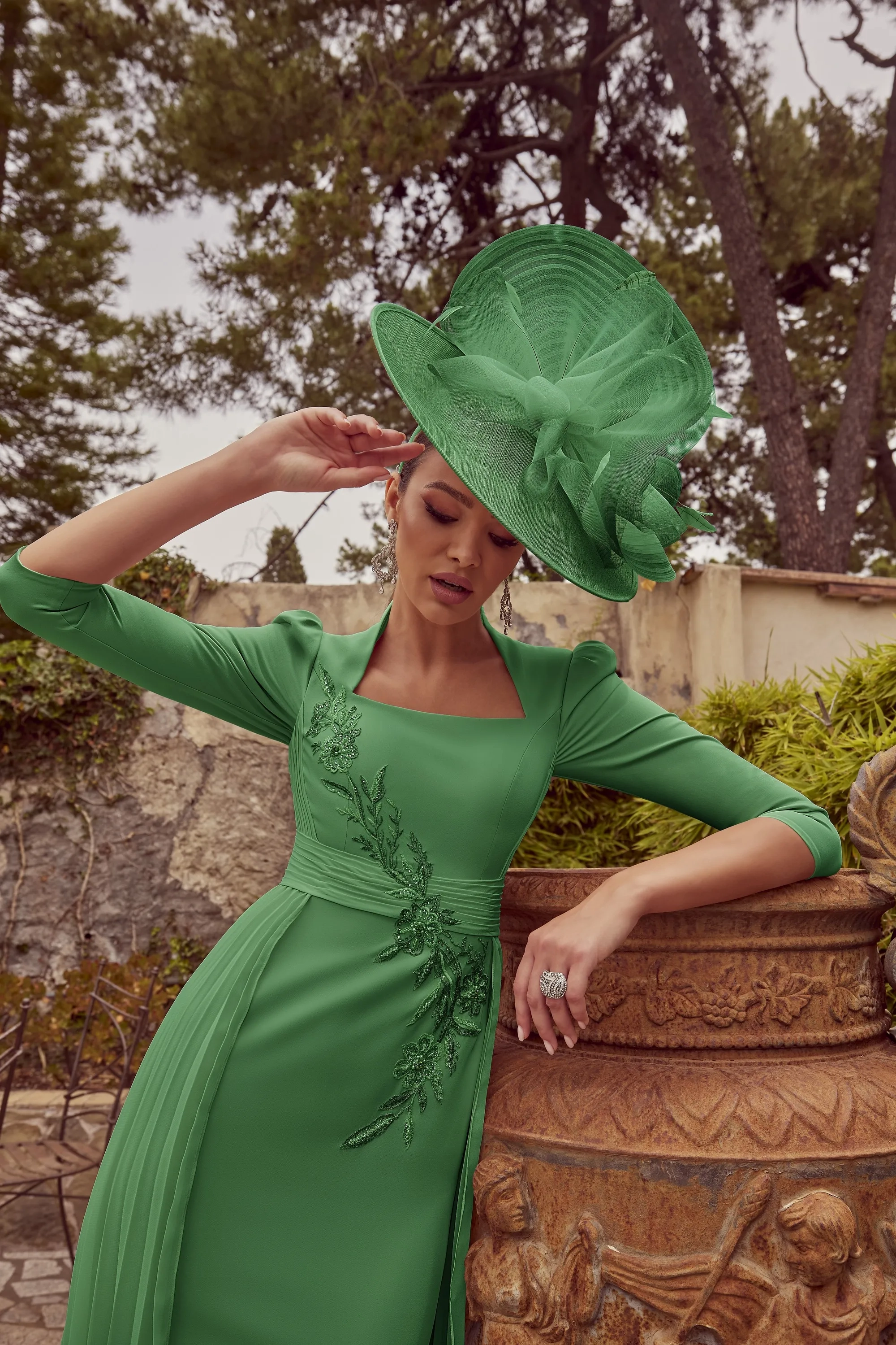 A unique fit and flare full-length dress with floral lace appliques. Featuring a sheer half overskirt and pleated cinched waist.