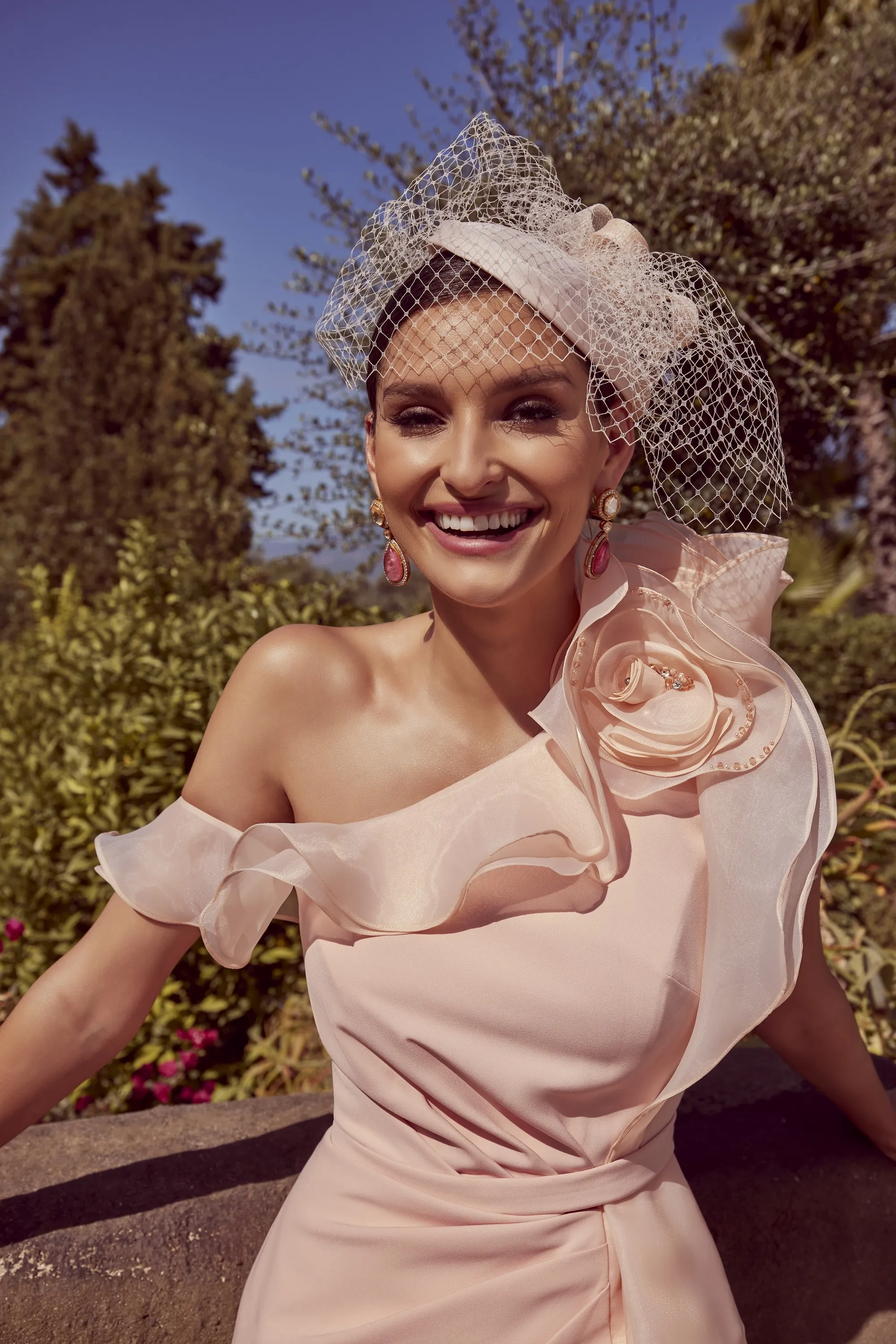 An asymmetrical modern fitted crepe and organza dress, featuring a one-shoulder floral ruffle motif.
