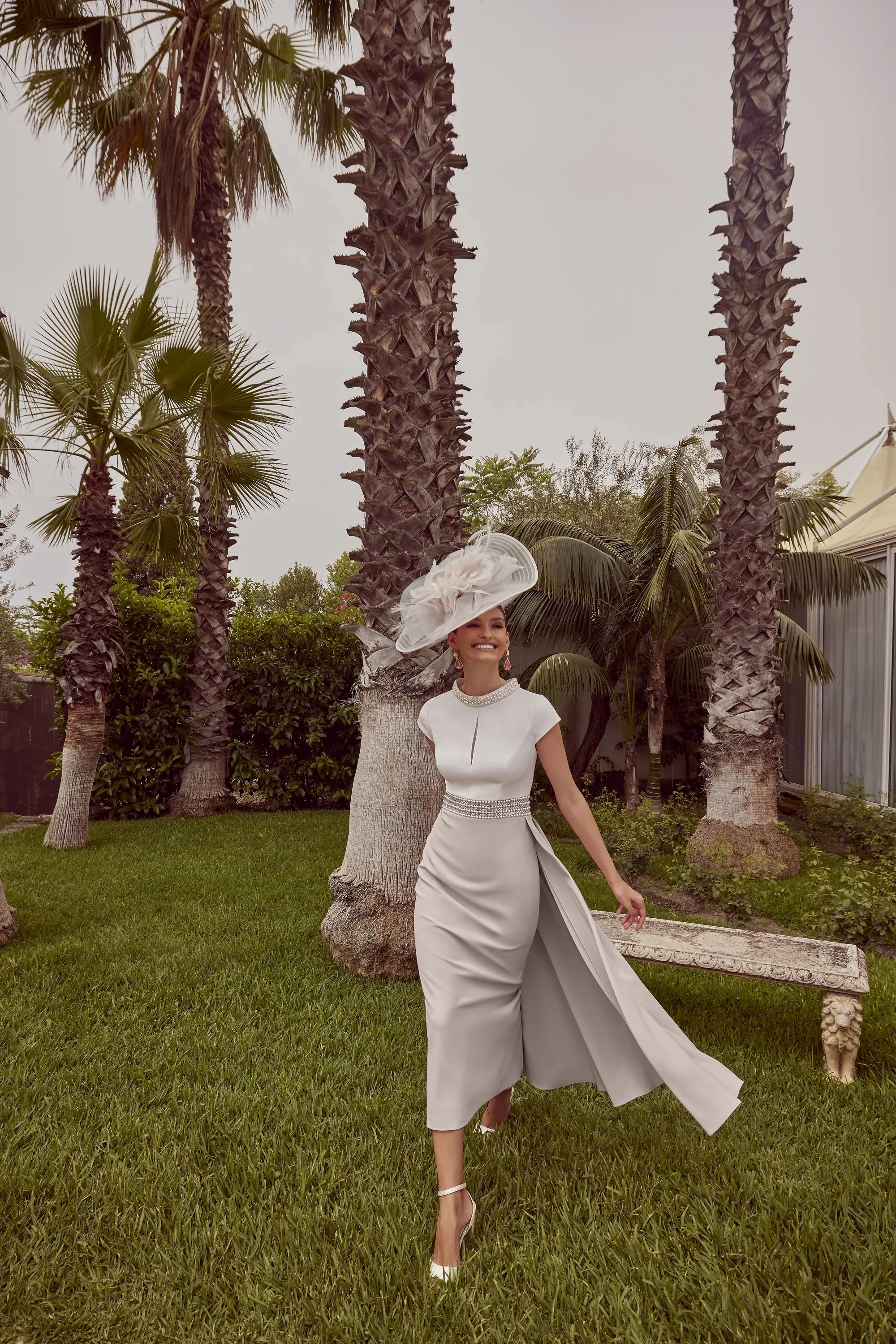 A classic midi-length fitted mother of the bride dress, featuring a high beaded neck and waistline. Complete with a unique half overskirt.