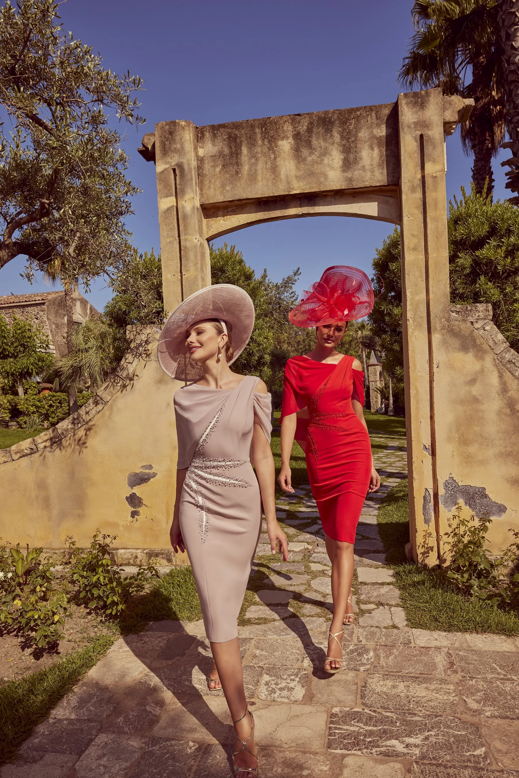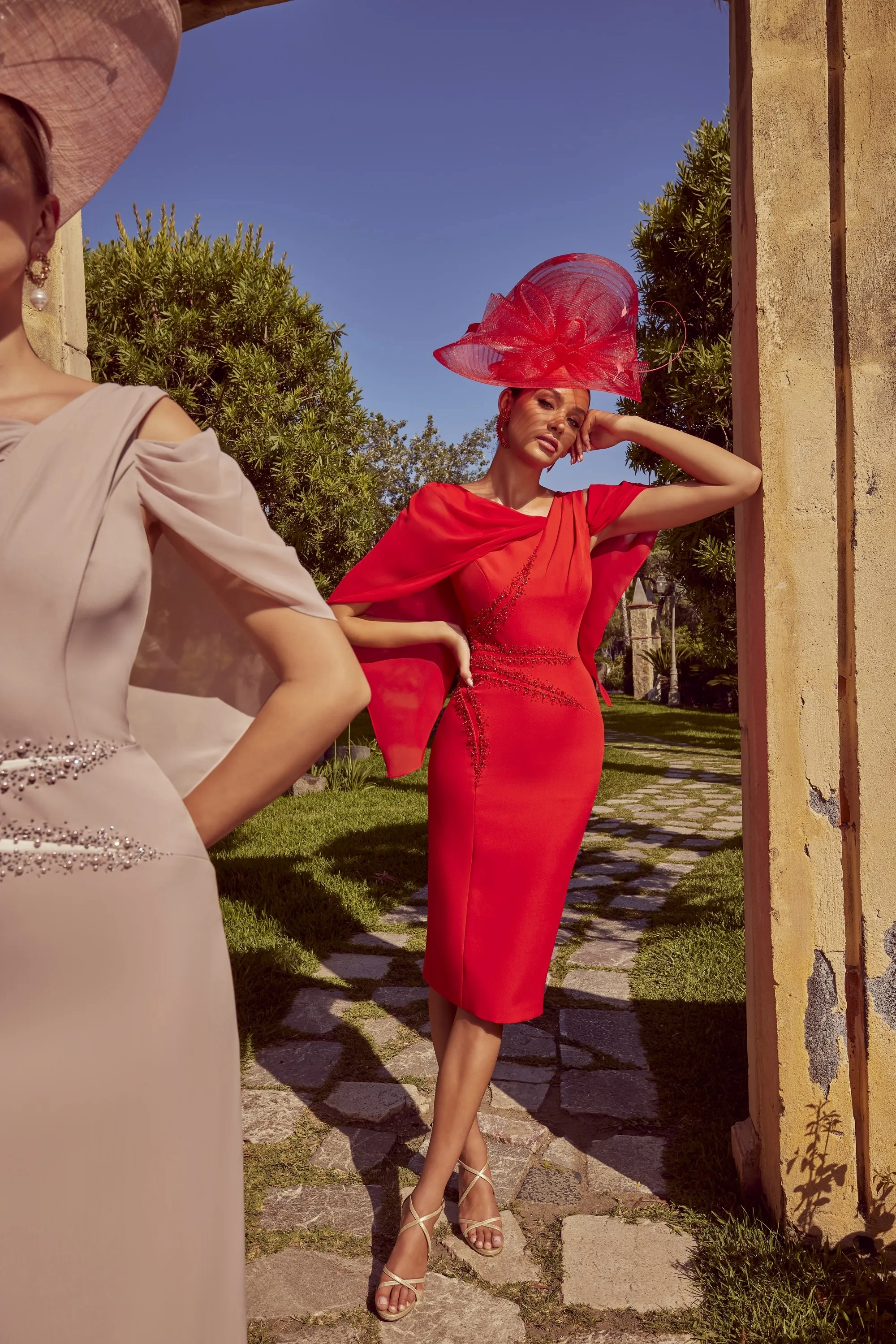 A fitted crepe dress, featuring beaded detail on the waist. This dress is complete with a one shoulder sheer cape and cold shoulder.