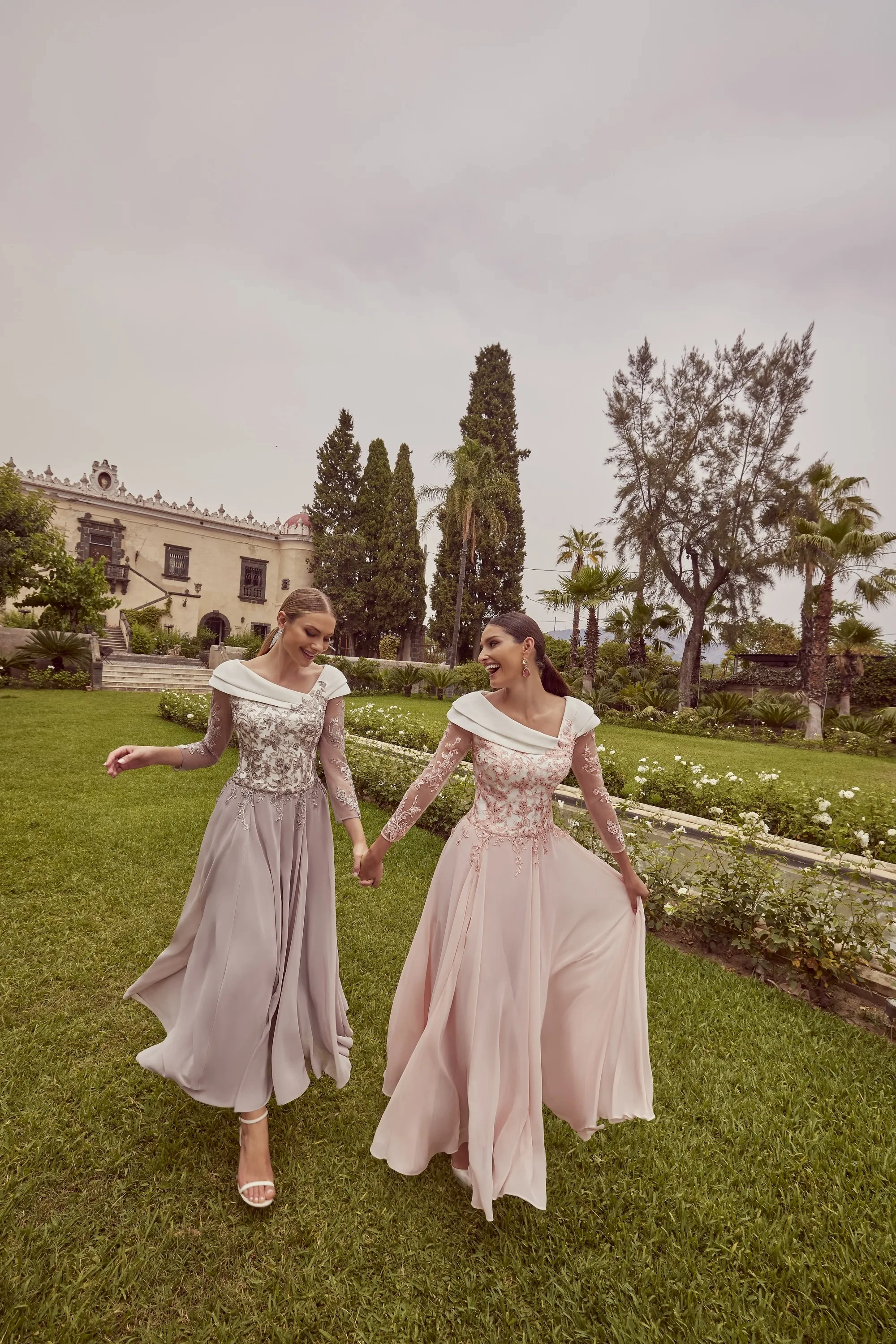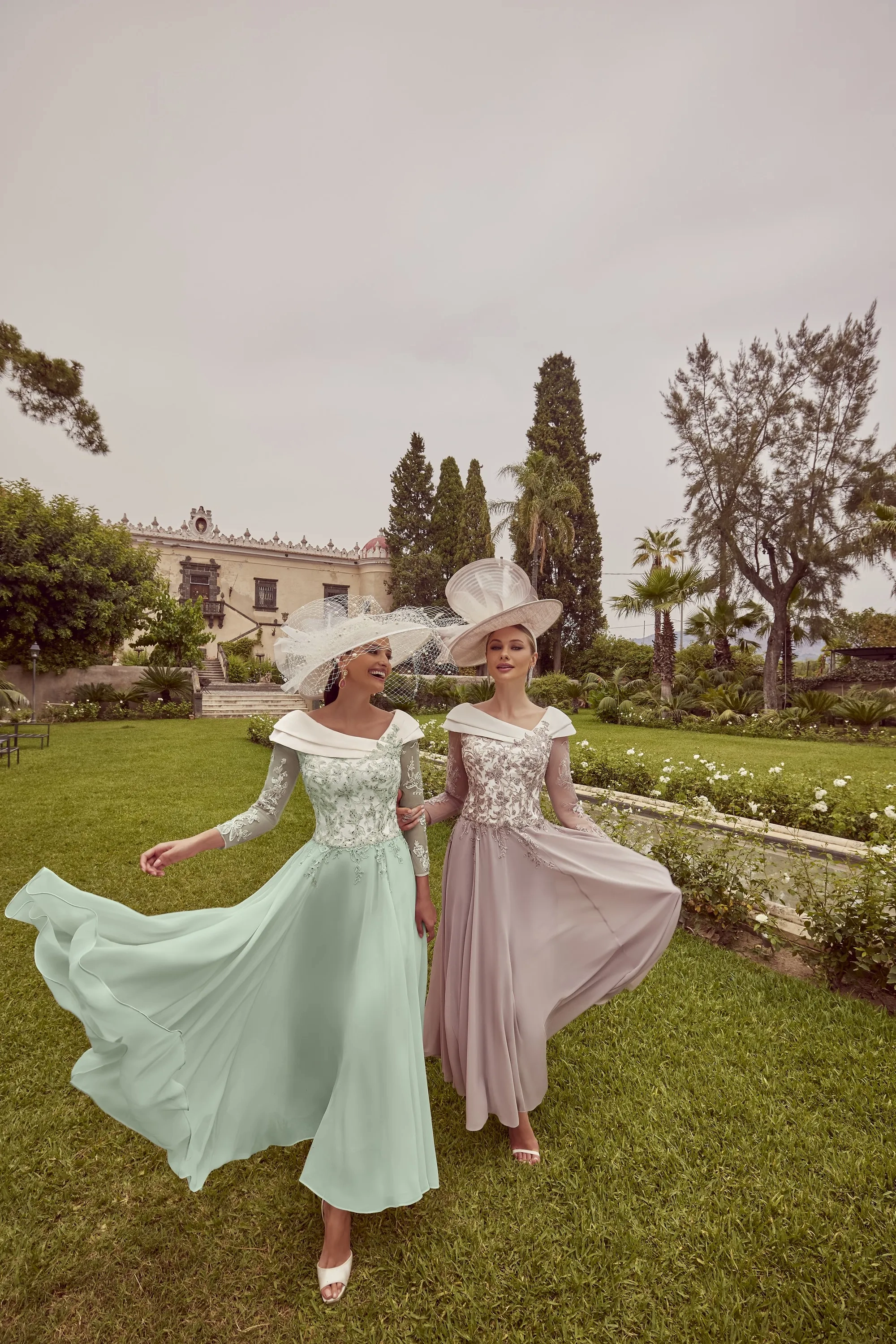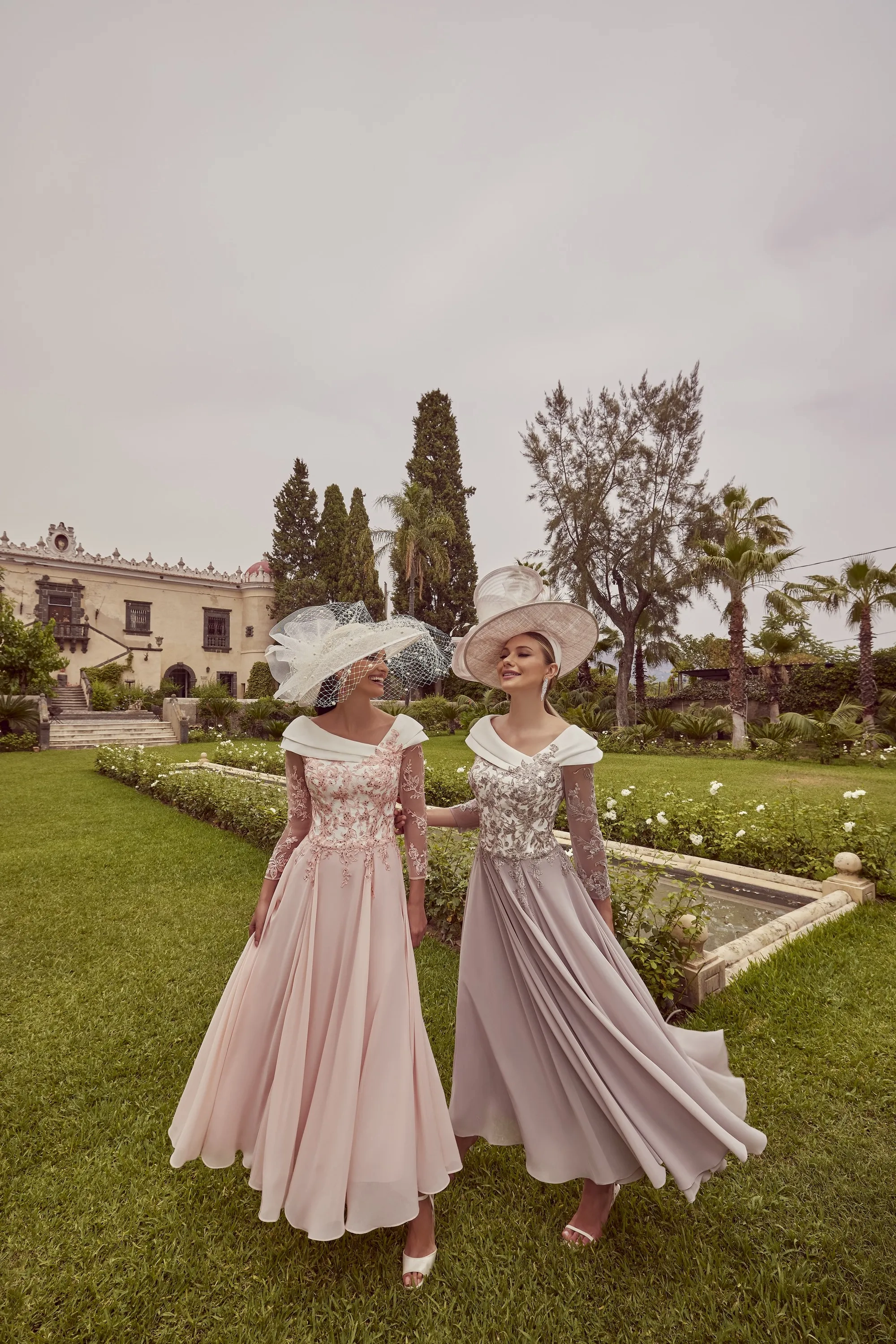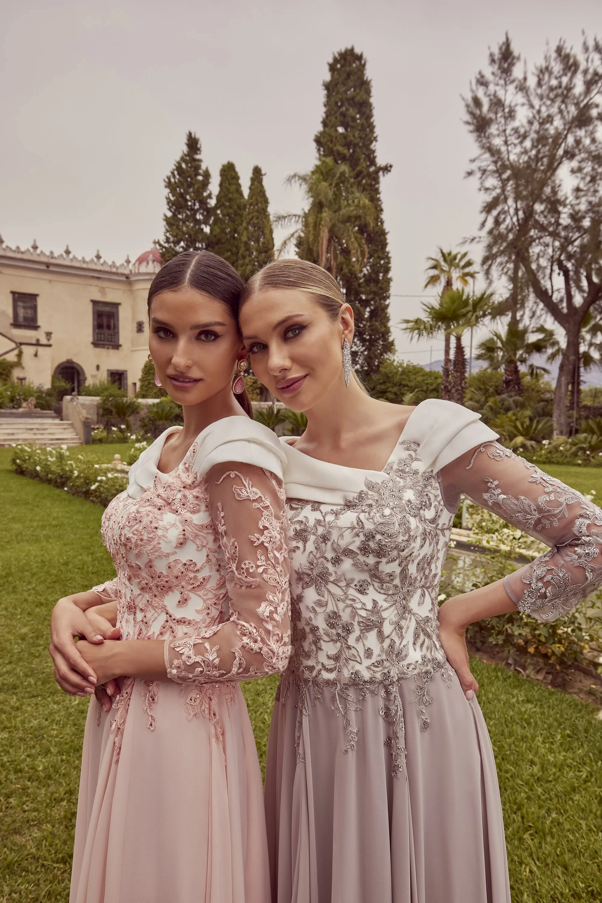 A relaxed Chiffon A-line dress with an asymmetrical neckline and 3/4 sleeve detail. This wedding guest dress features beaded lace appliques on the bodice