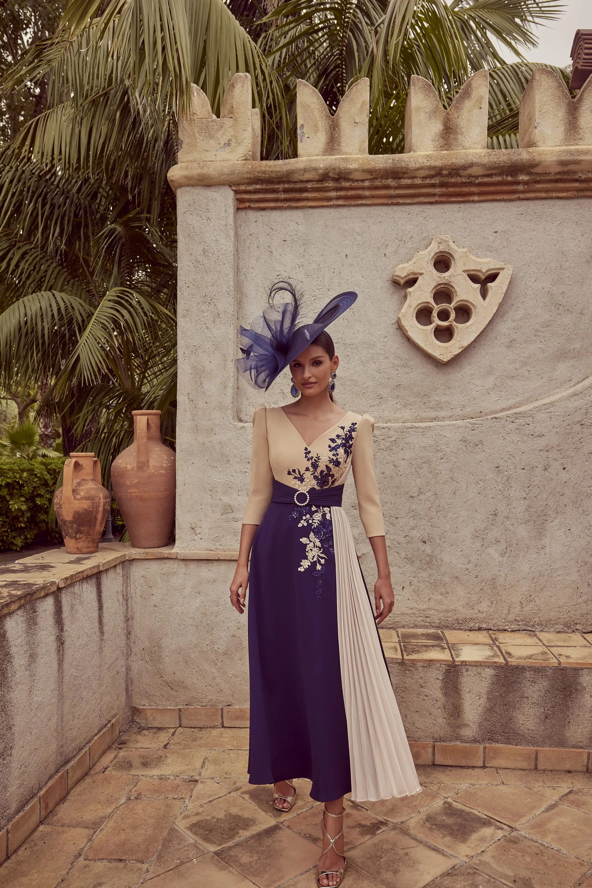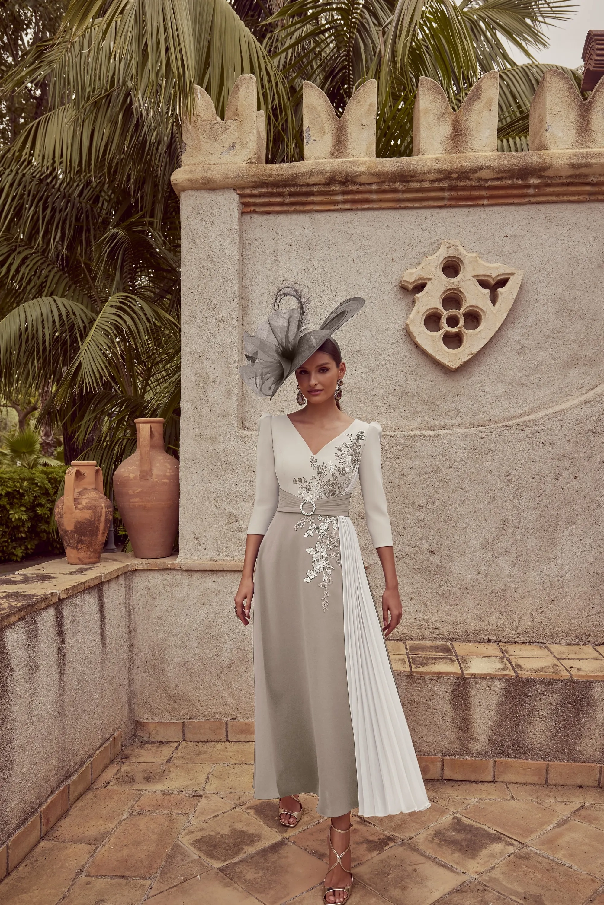 A relaxed crepe and chiffon A-line dress with an v-neckline and 3/4 sleeve detail. This wedding guest dress features beaded lace appliques on the bodice and a two tone bodice to skirt.
