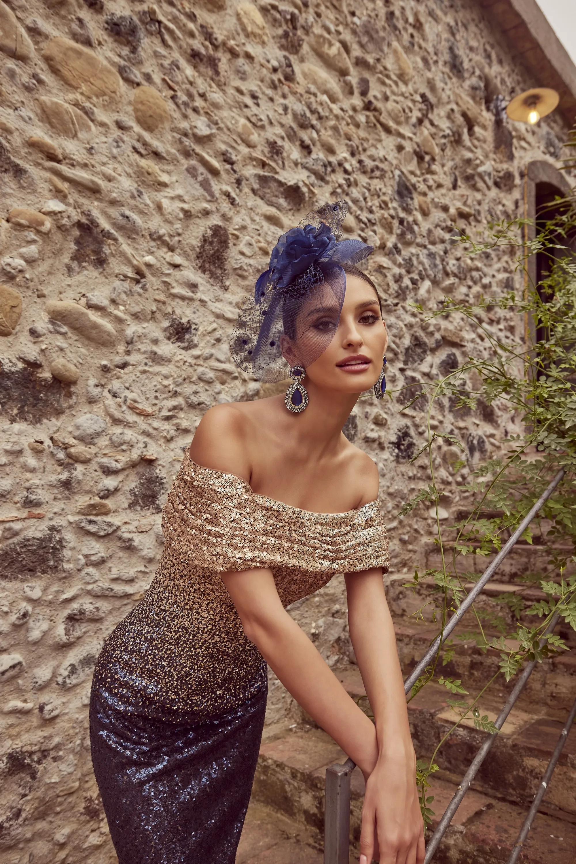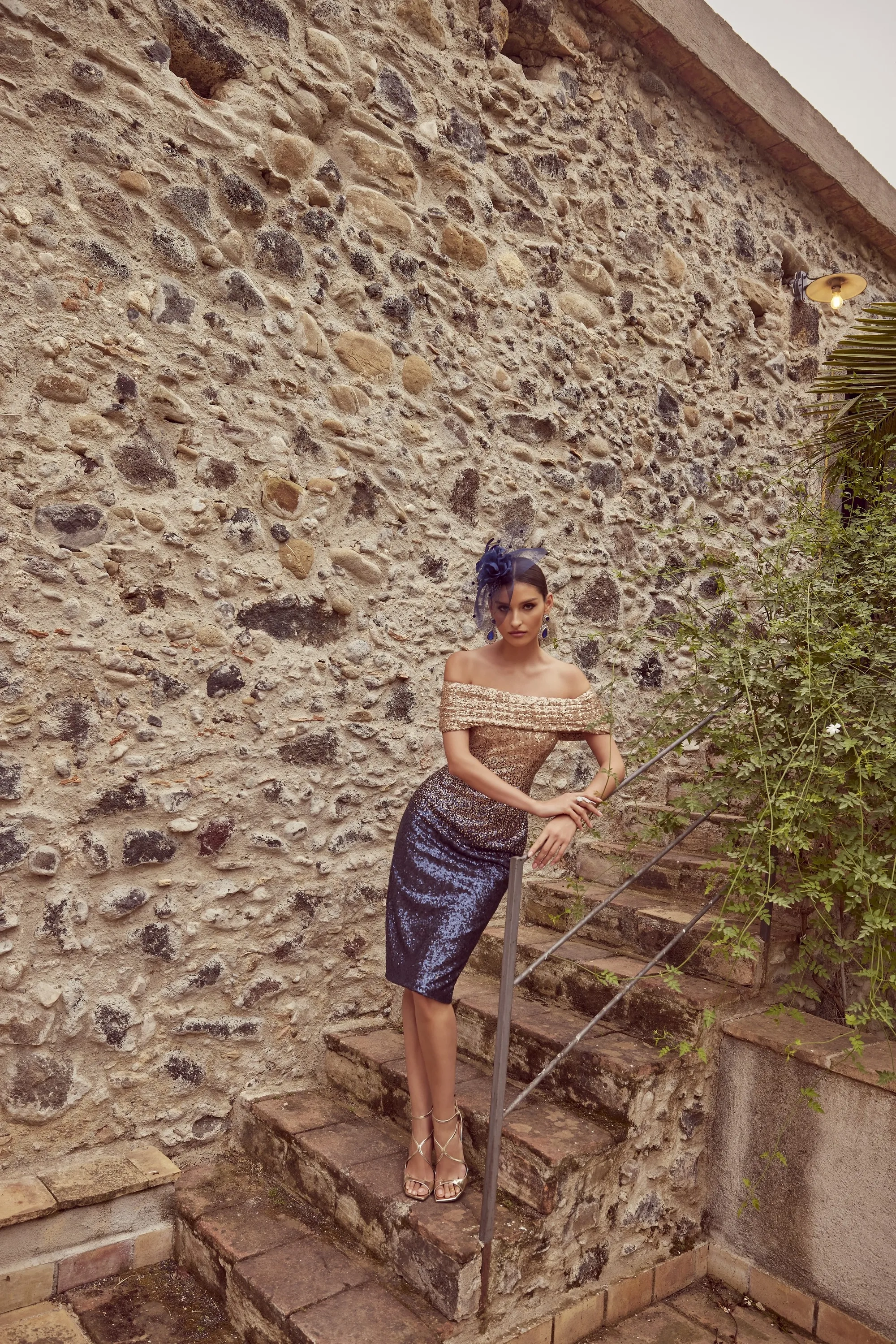 A modern ombre sequin off the shoulder fitted knee-length dress.
