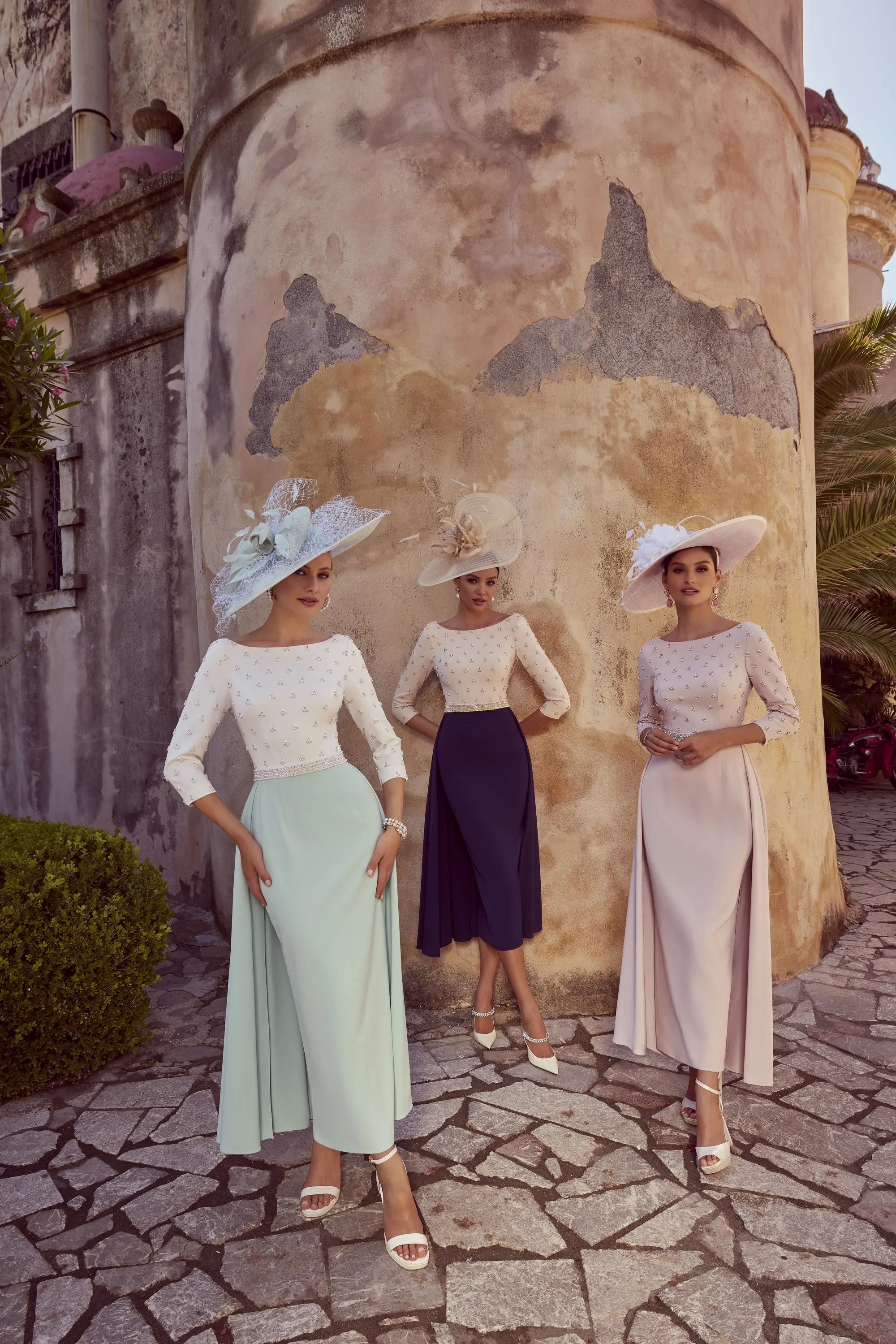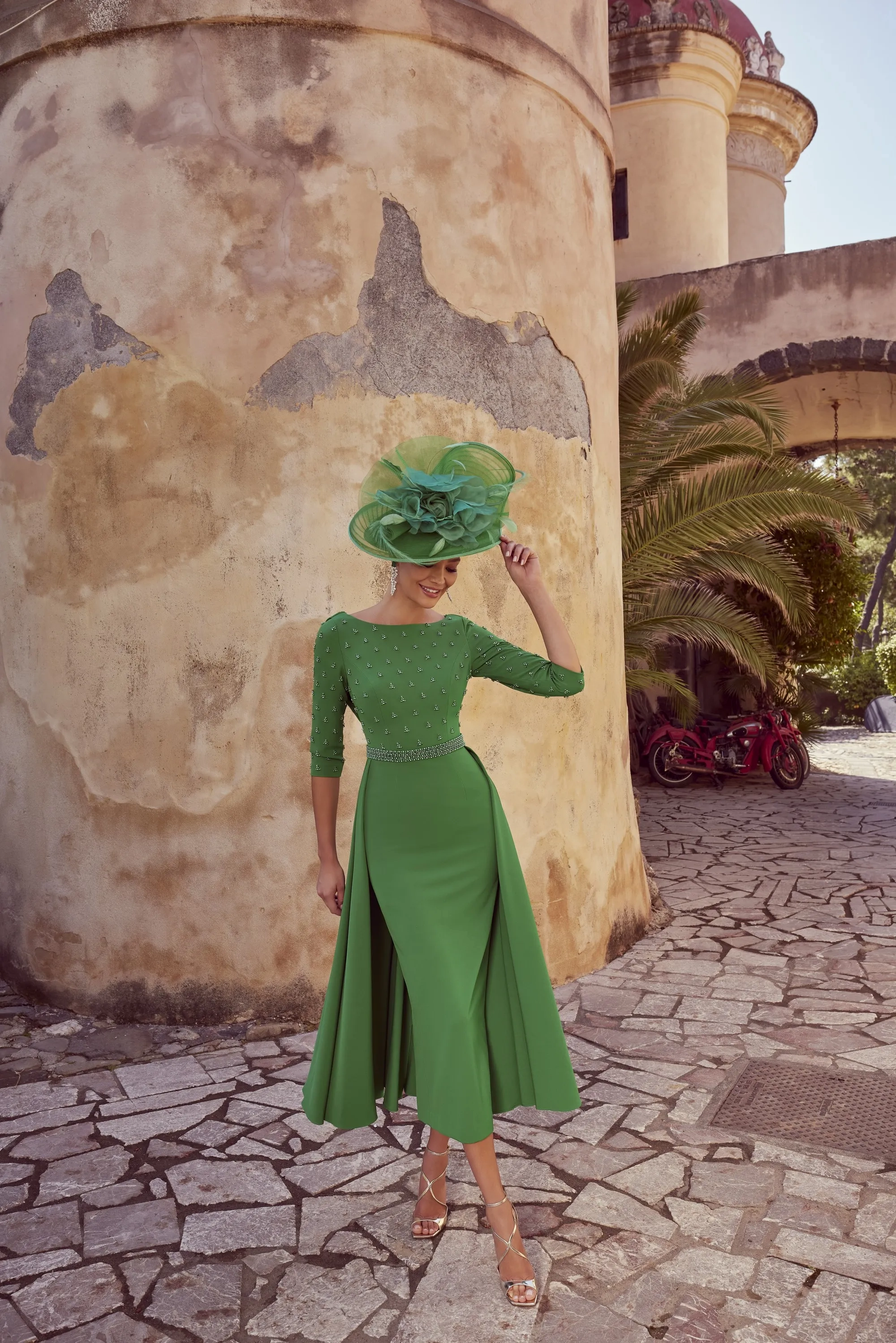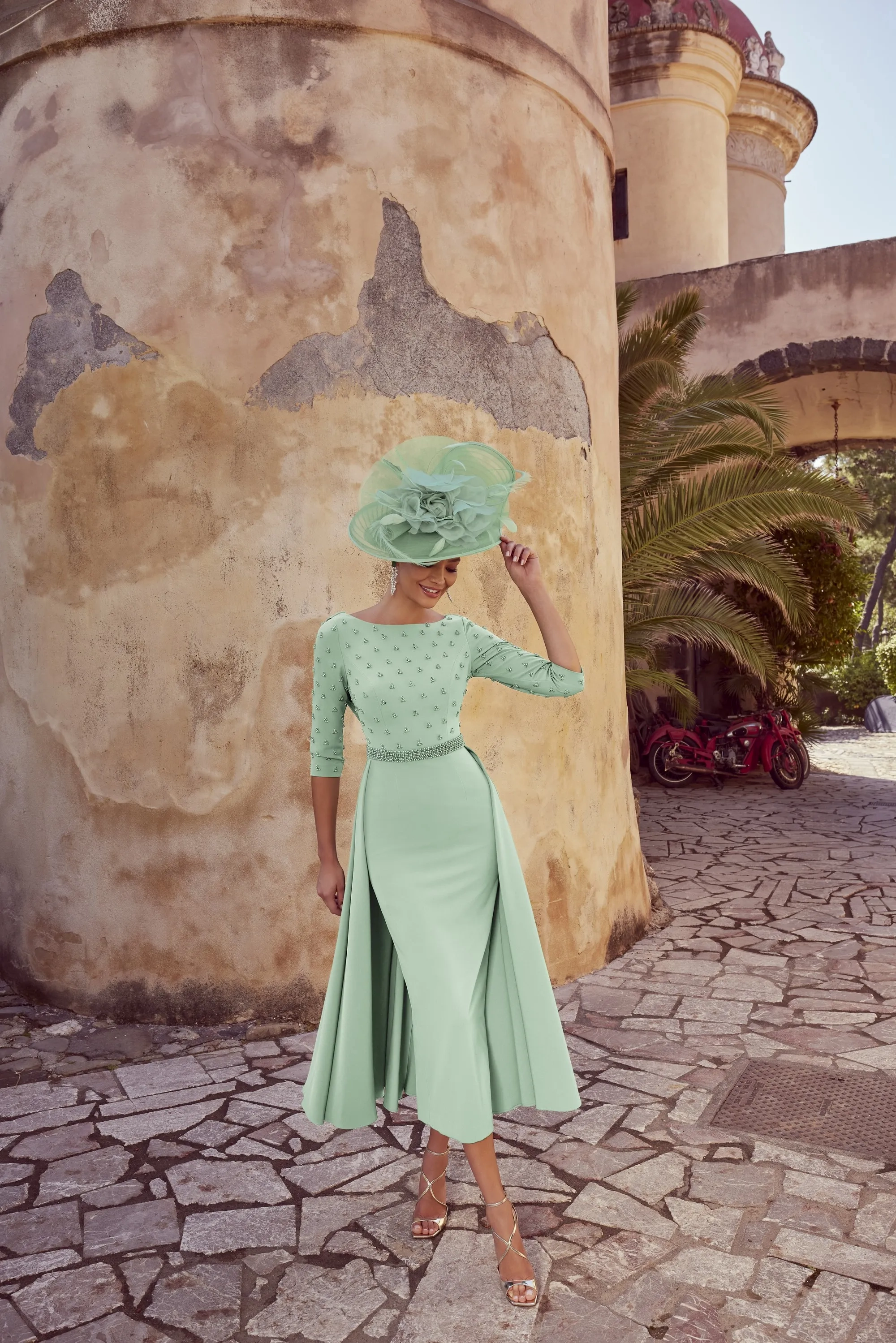 A unique fit and flare full-length dress with a beaded bodice and waistband. Featuring a half overskirt for movement.