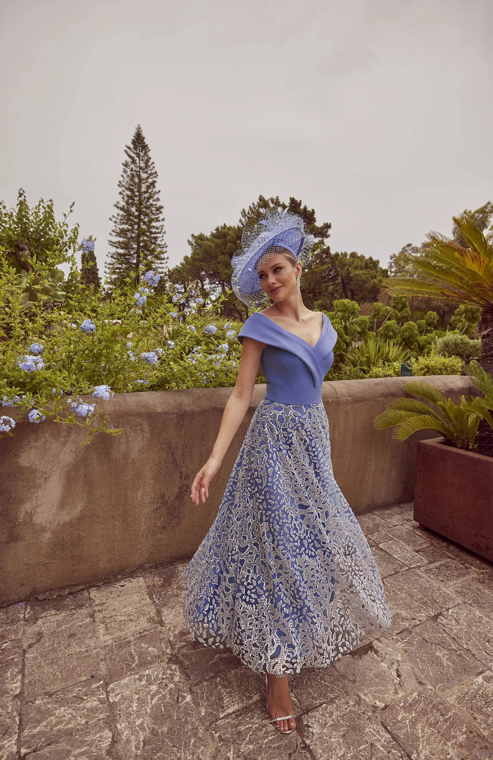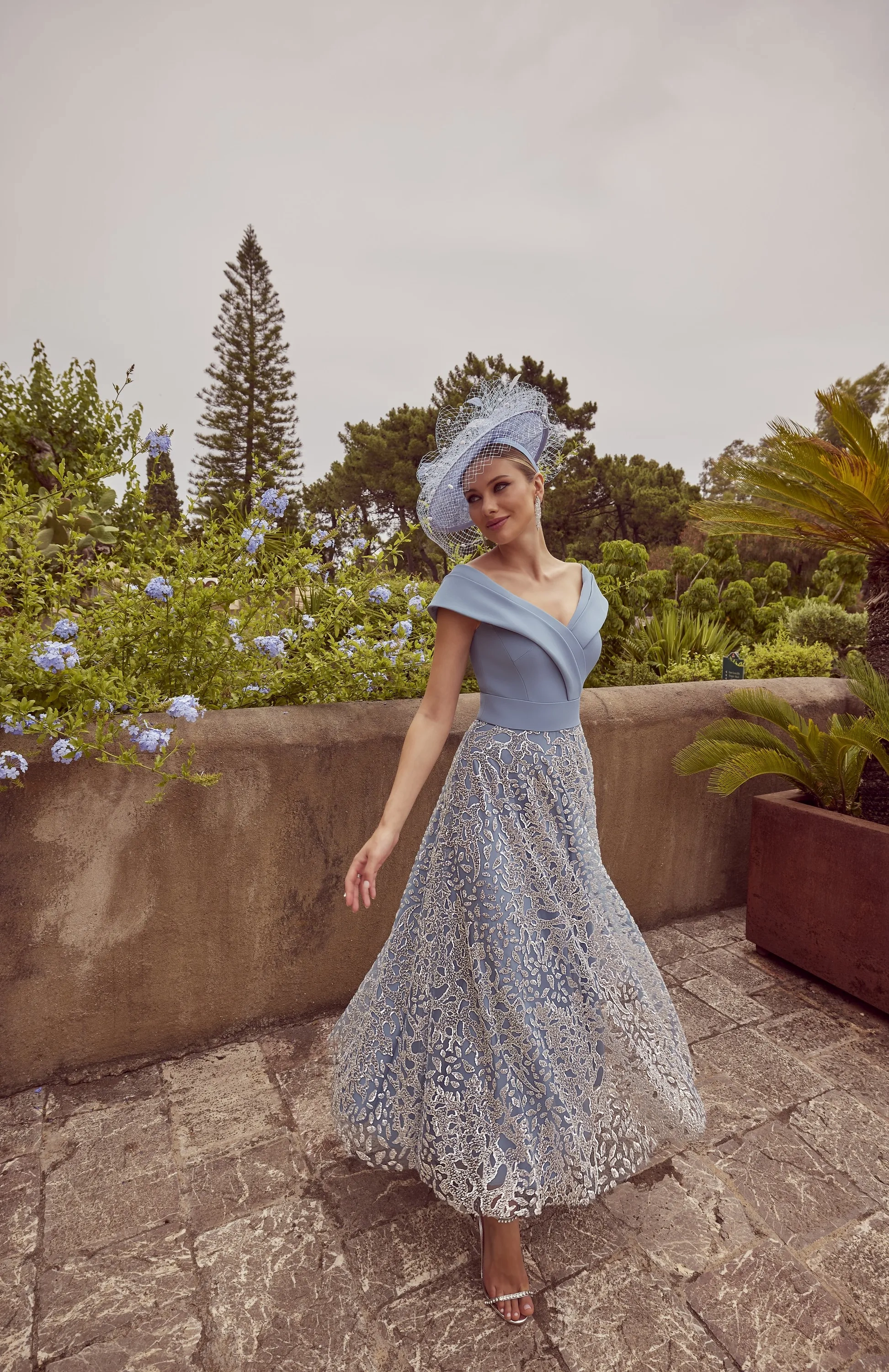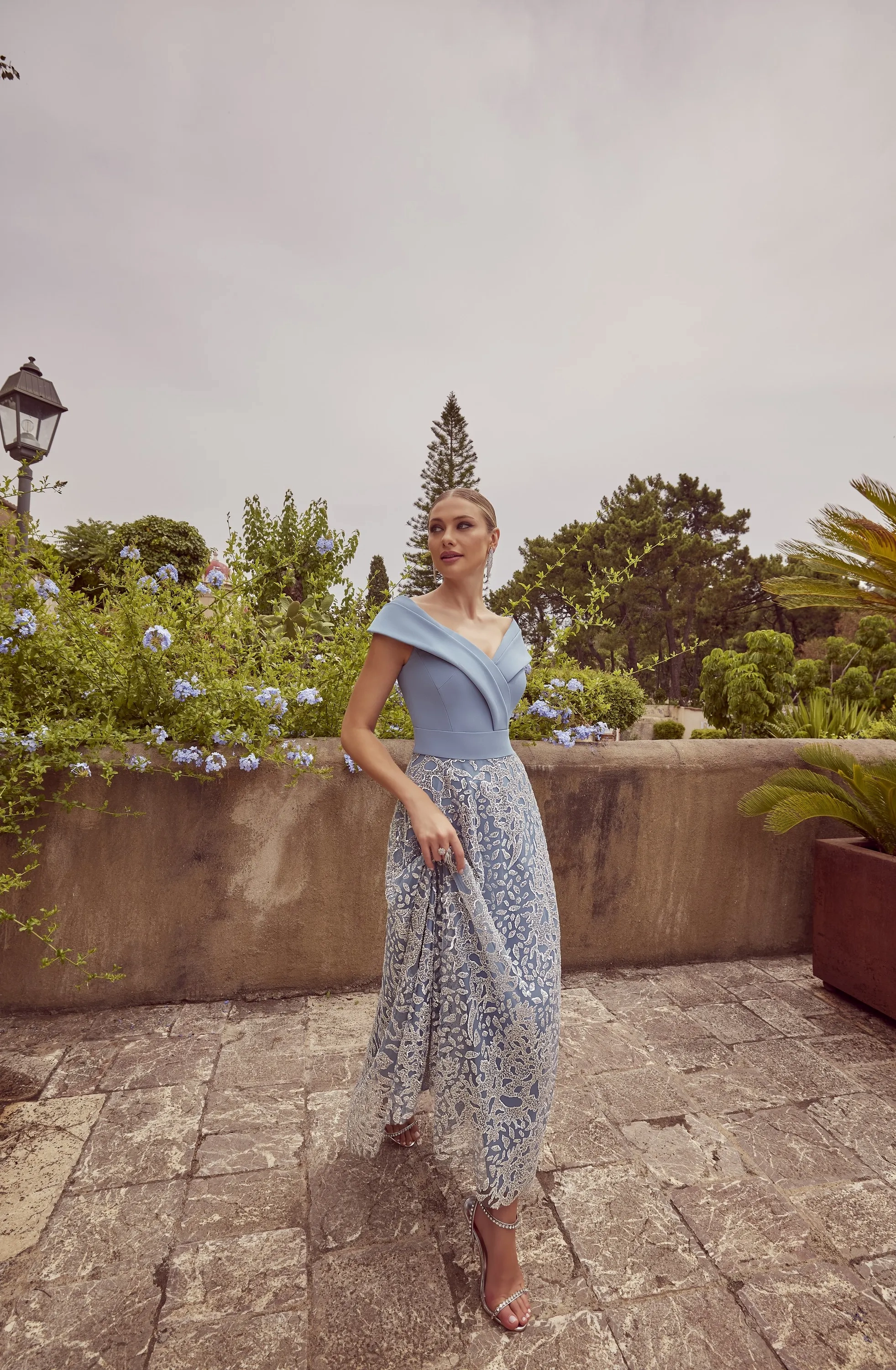 A classic A-line crepe dress, featuring an wide v-neckline, cinched waist and beaded skirt
