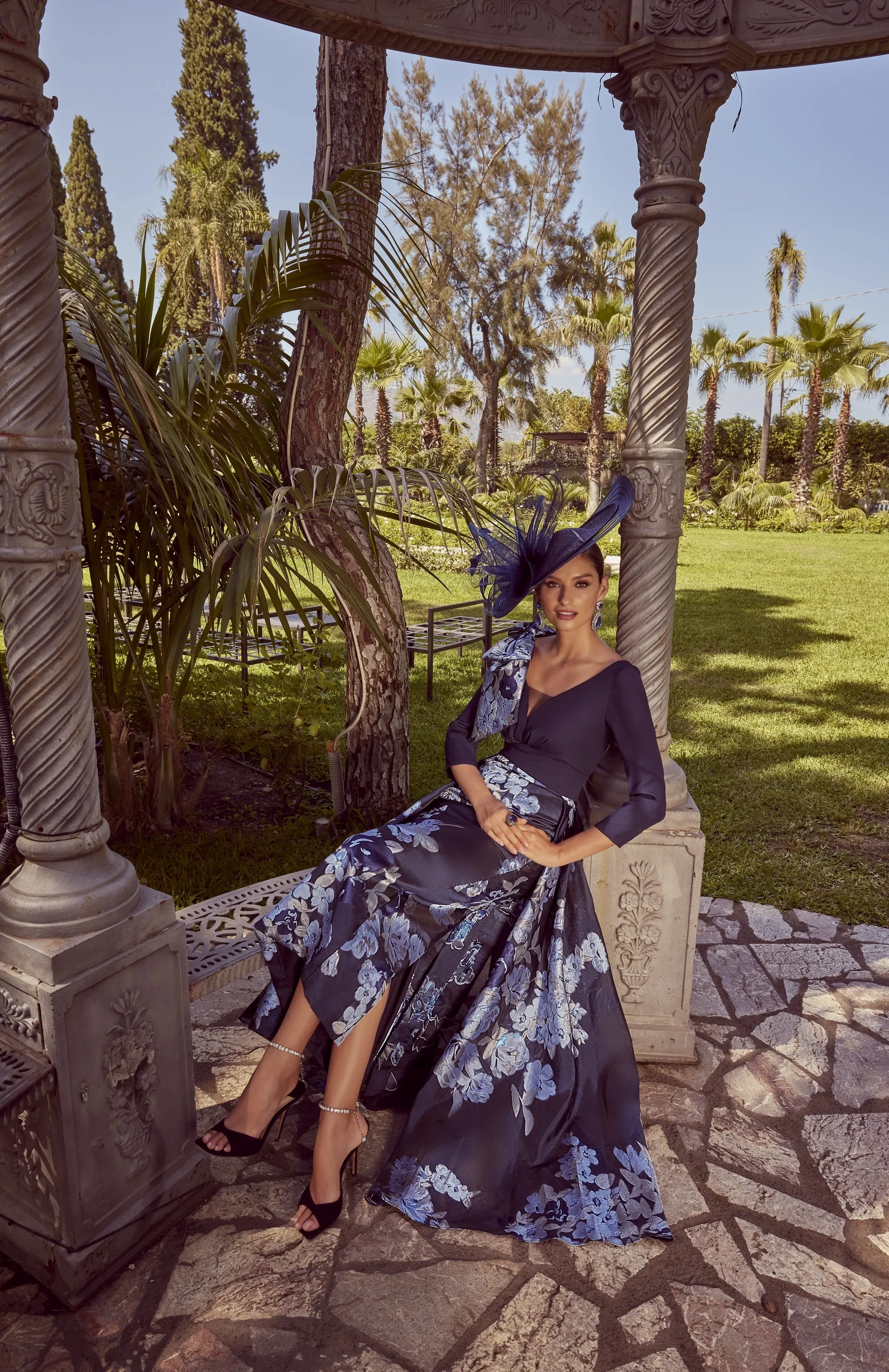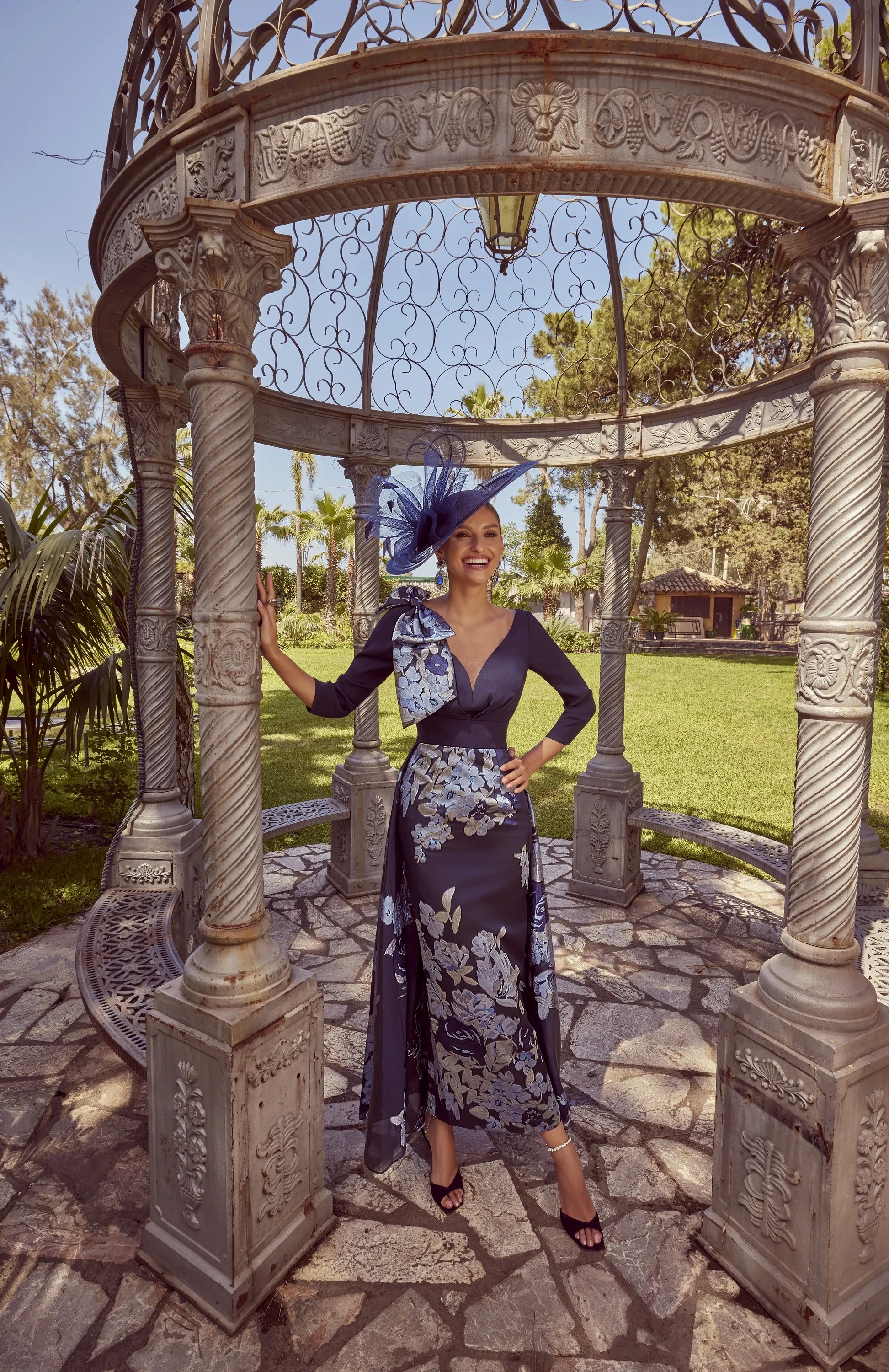 A unique fitted crepe and organza dress, featuring a deep v-neckline, a half crepe overskirt and large bow motif on one shoulder.