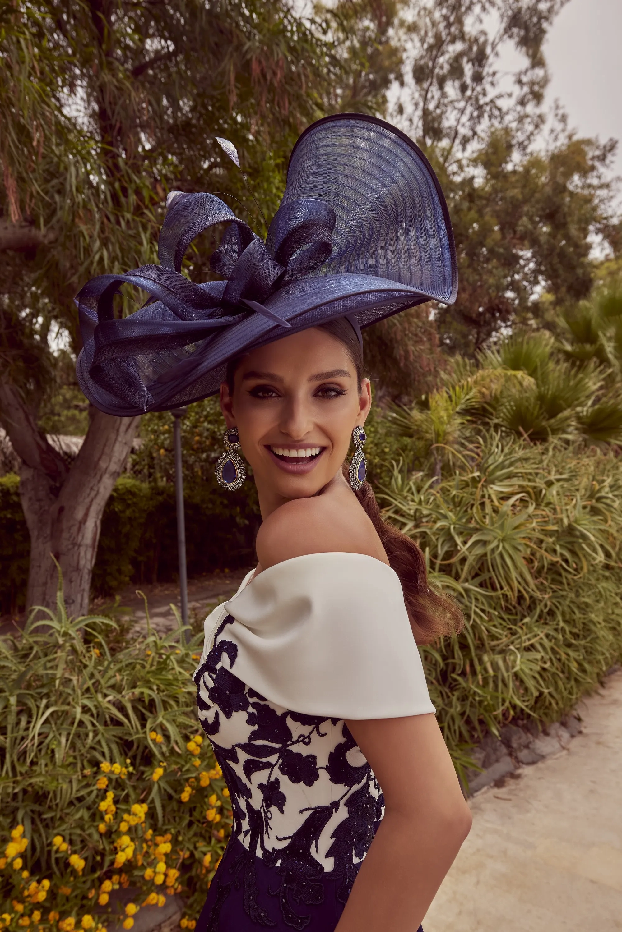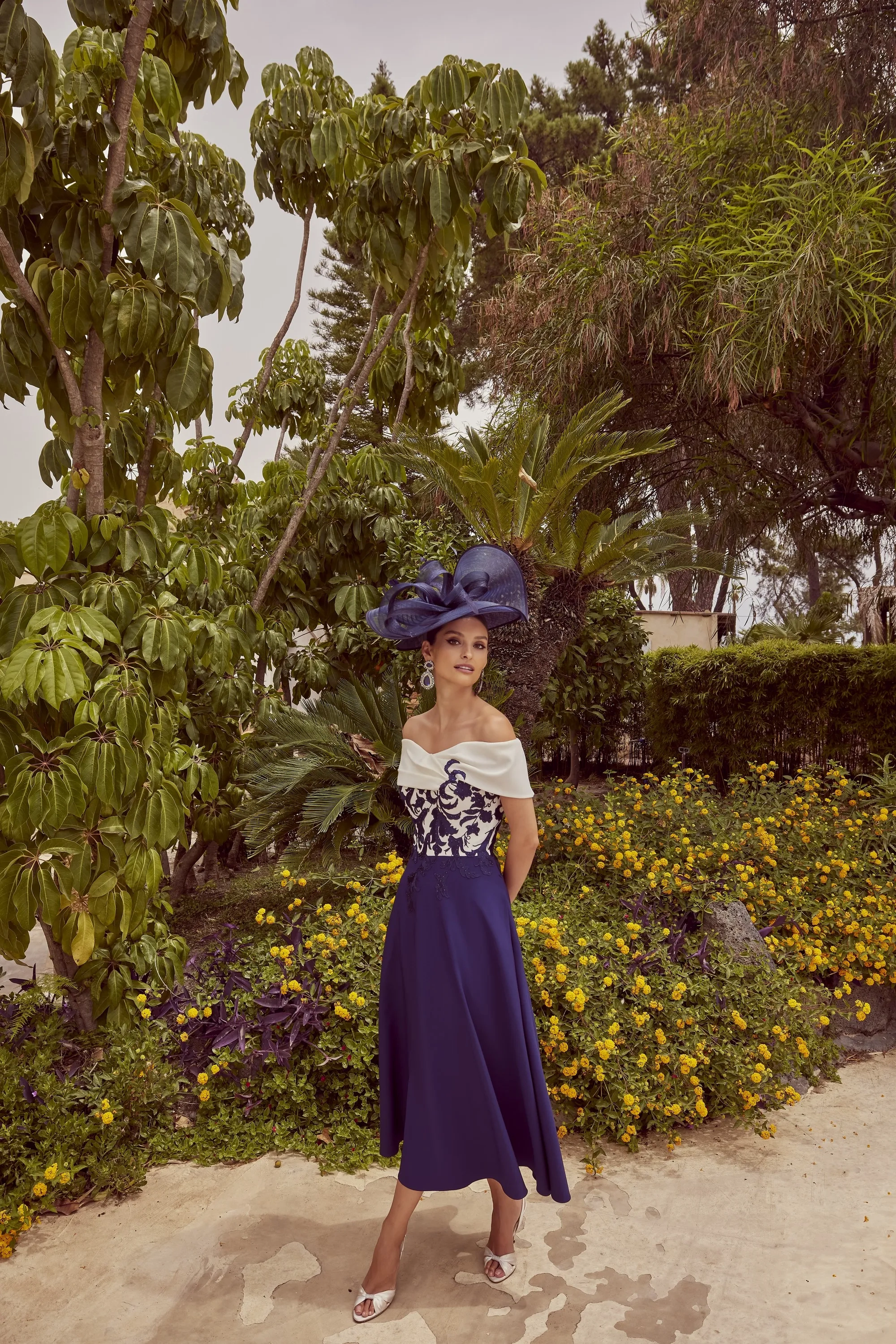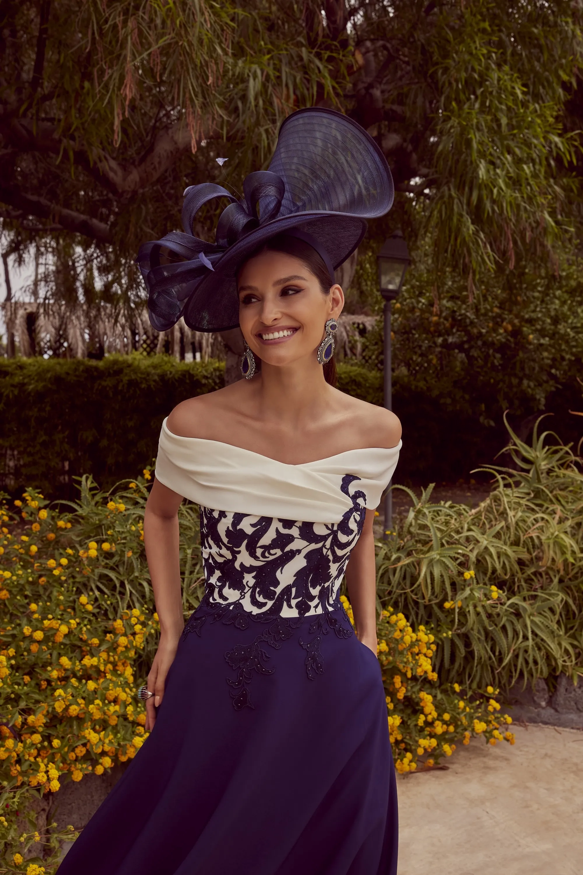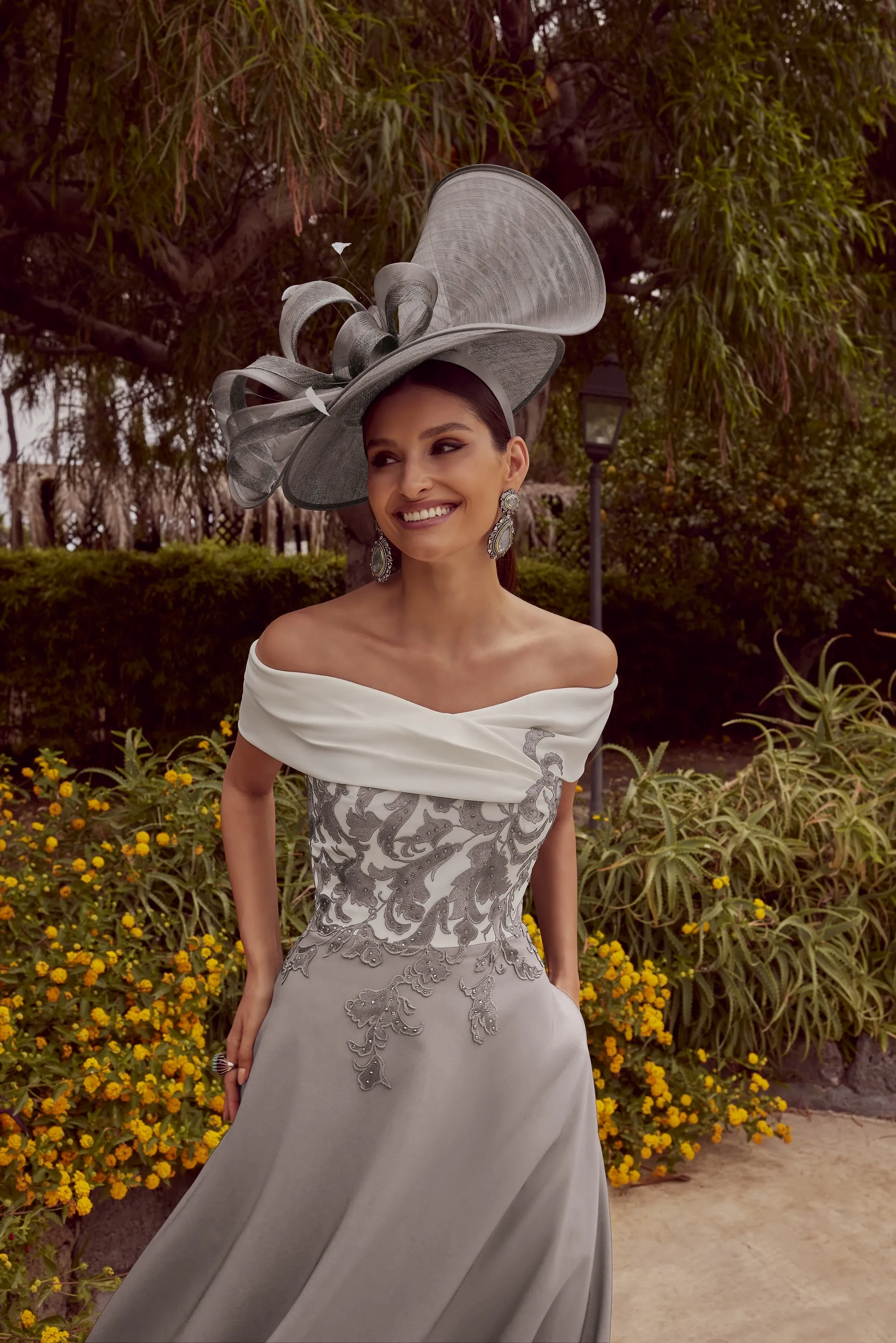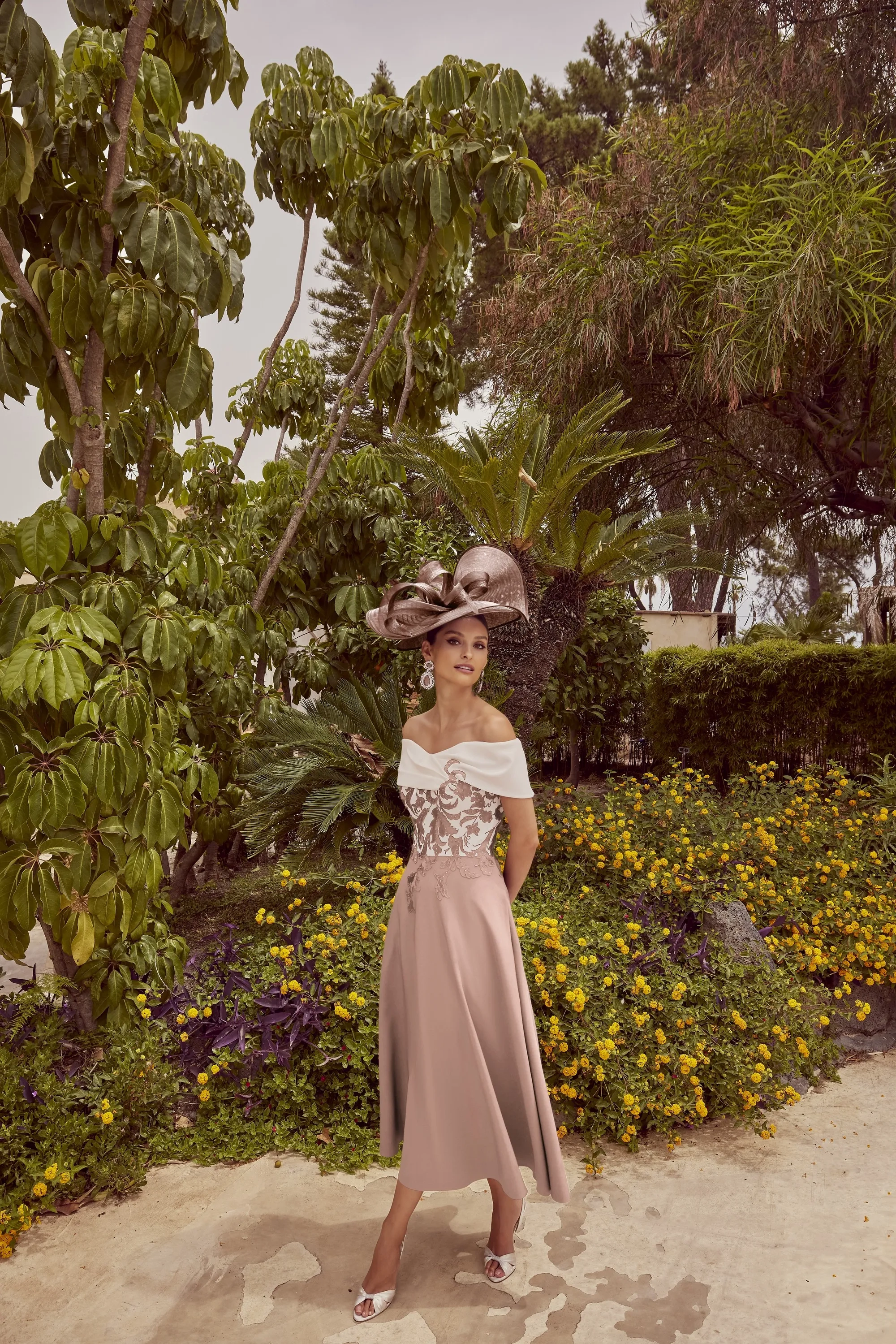 A mid-length relaxed off the should dress, featuring a contrasting bodice with lace appliques to plain skirt.