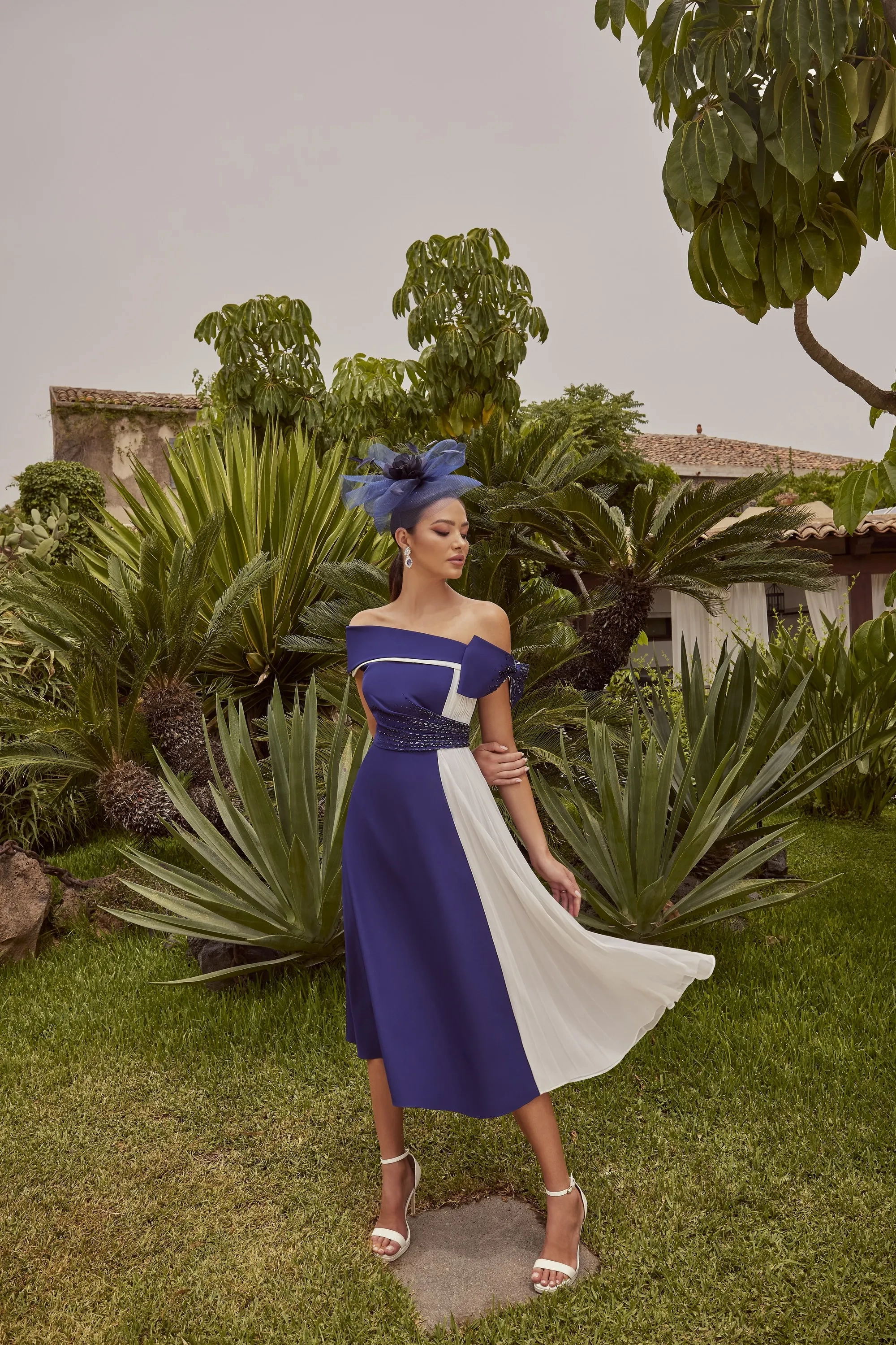 An asymmetrical mid-length, crepe dress, featuring a one shoulder bow motif and chiffon pleated skirt.