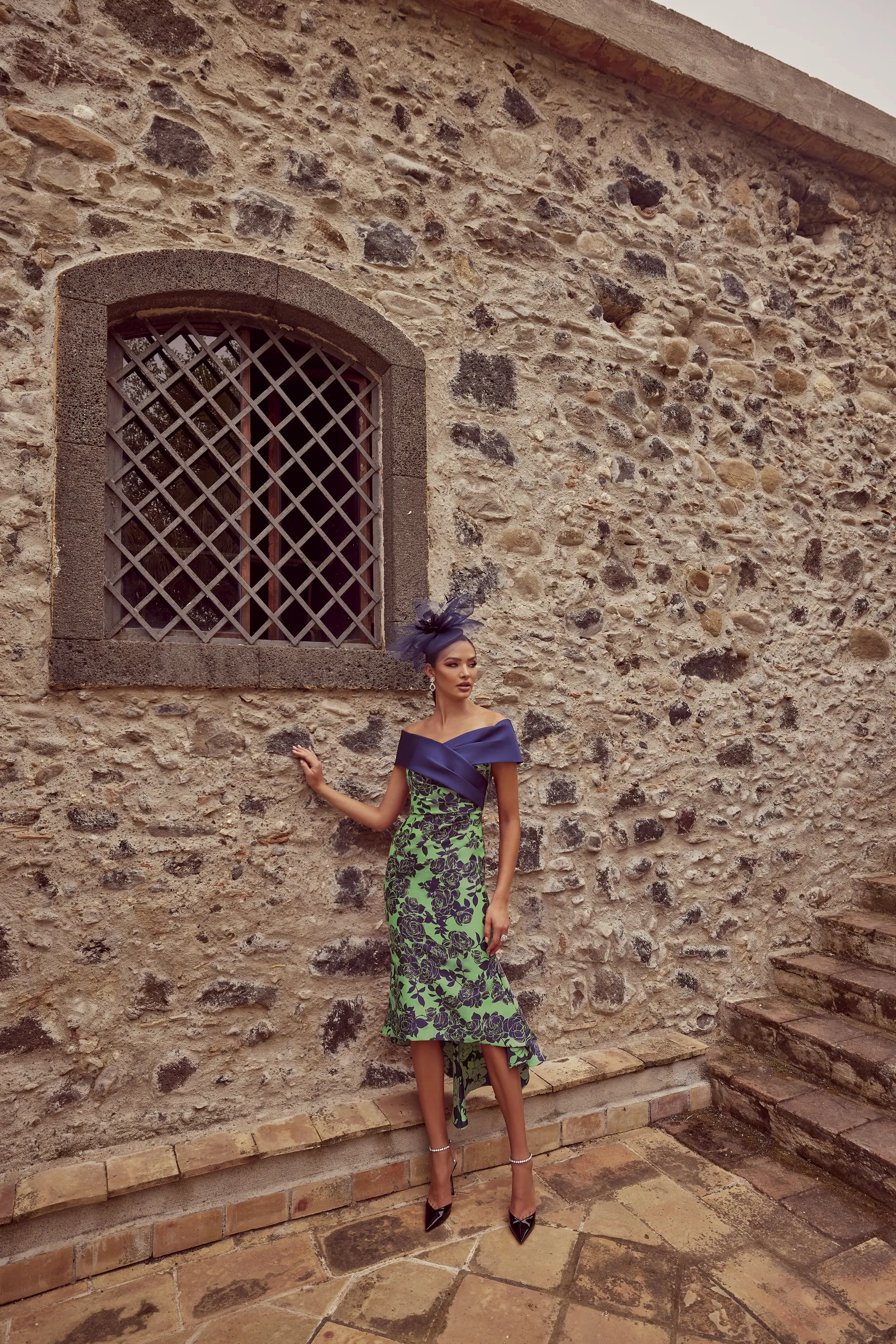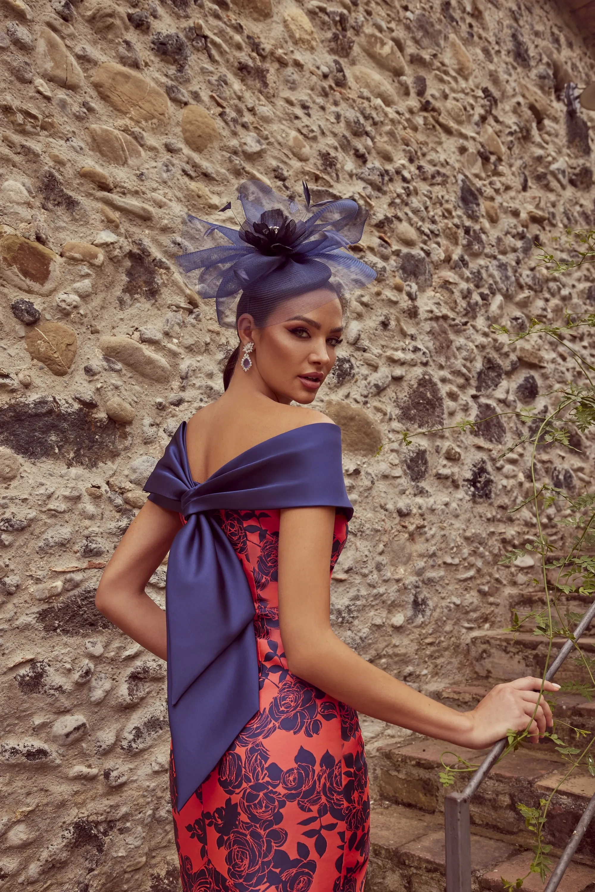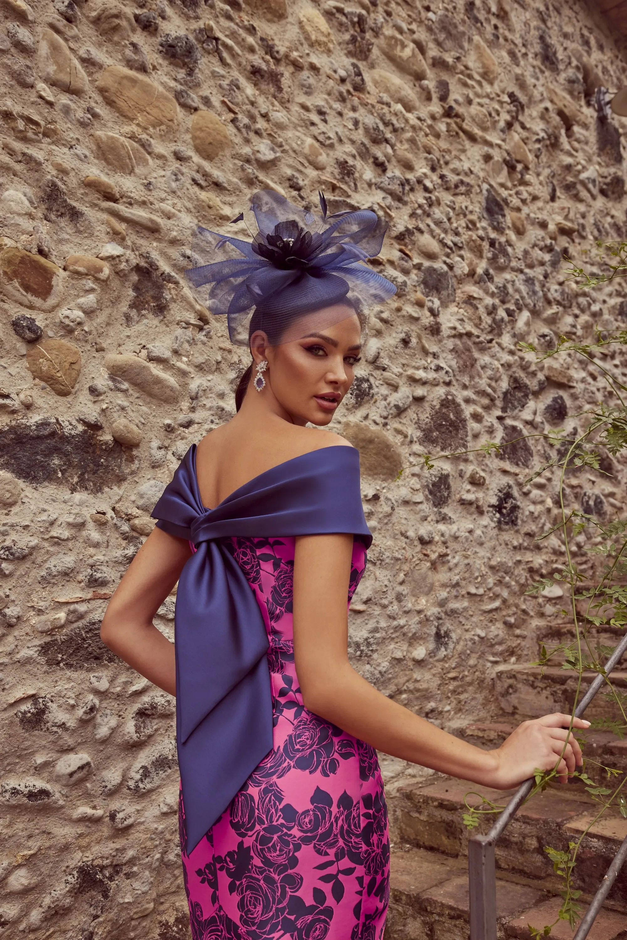 A modern fit and flare, high-low off the shoulder Mikado dress, complete with a bow back detail