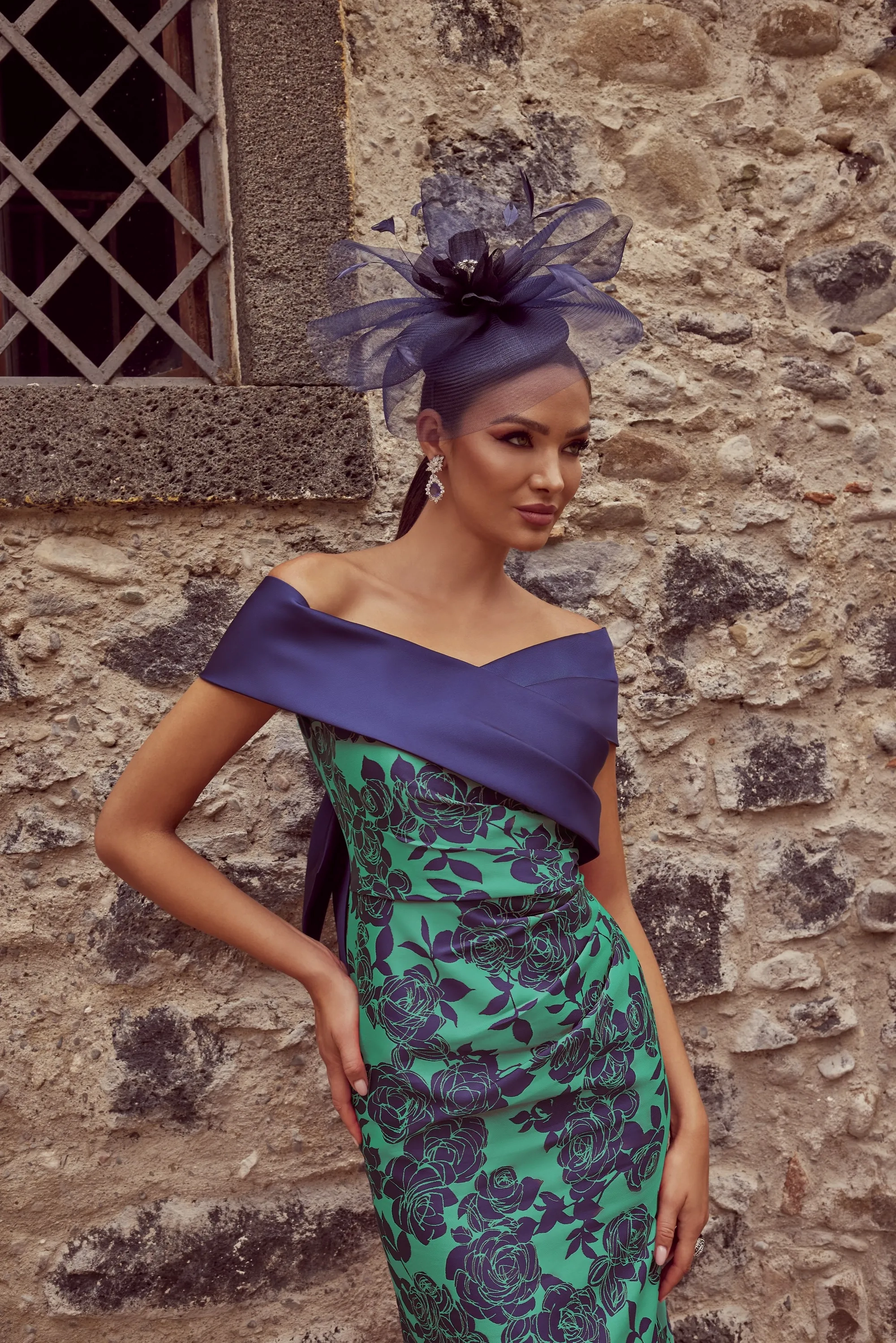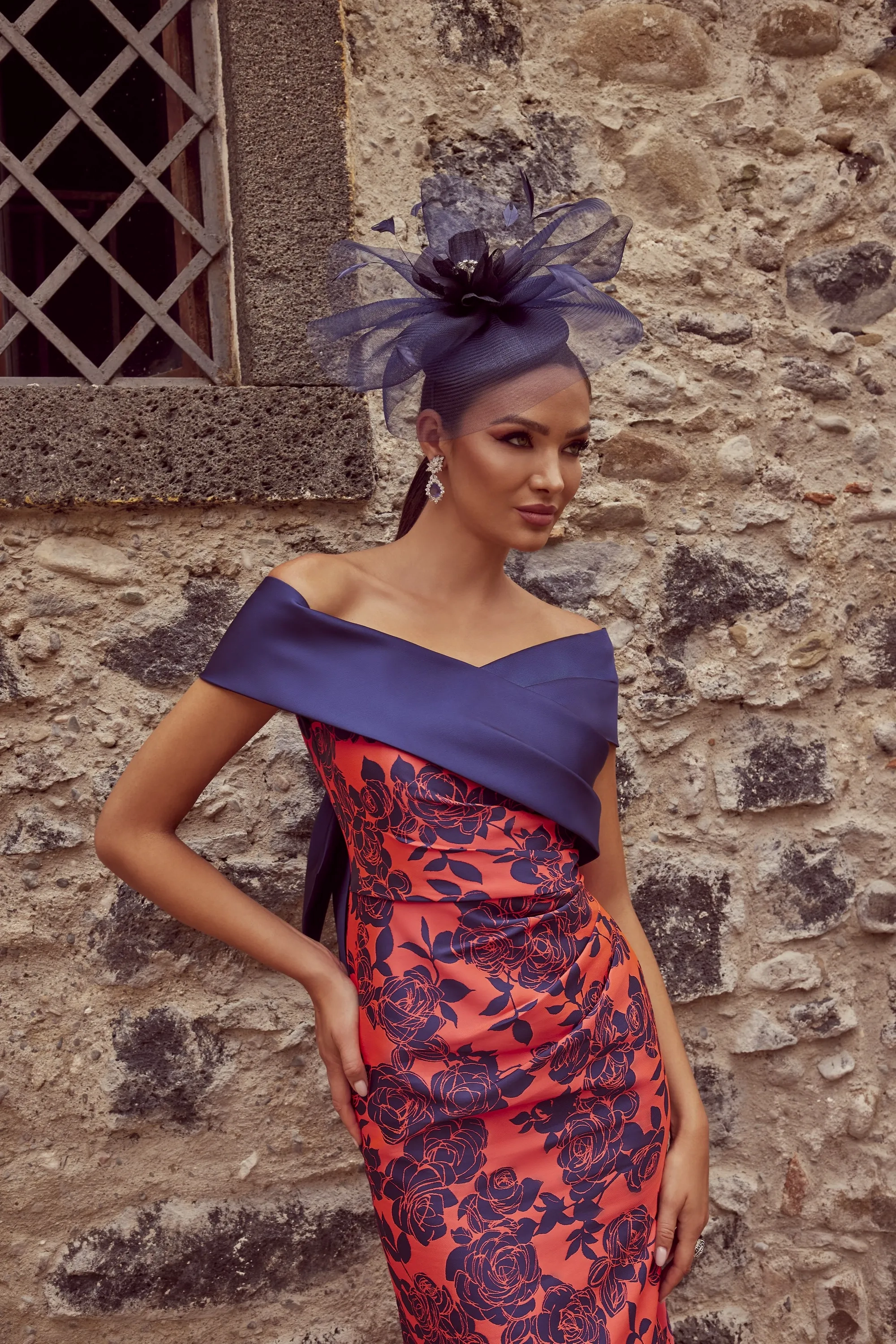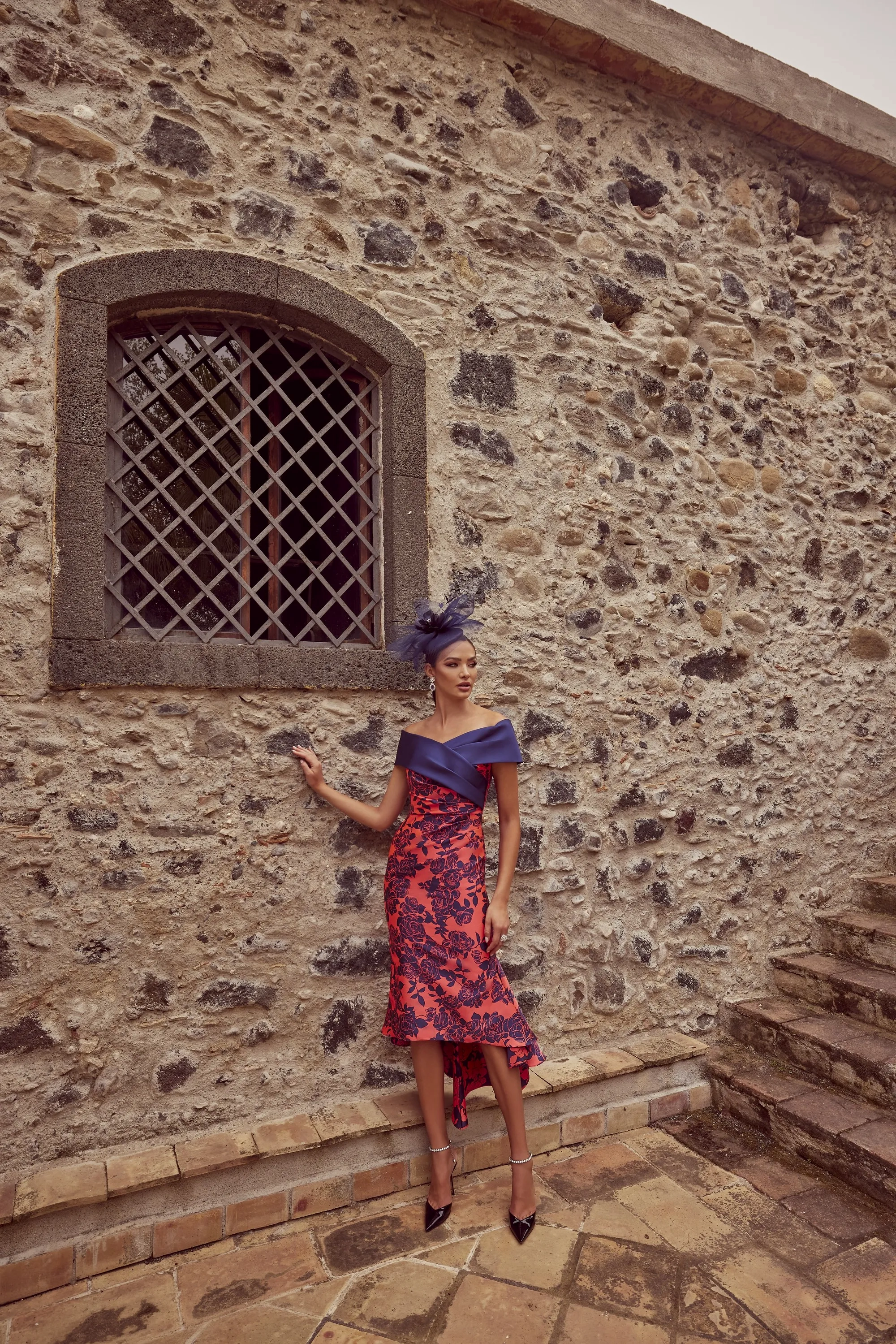 A modern fit and flare, high-low off the shoulder Mikado dress, complete with a bow back detail