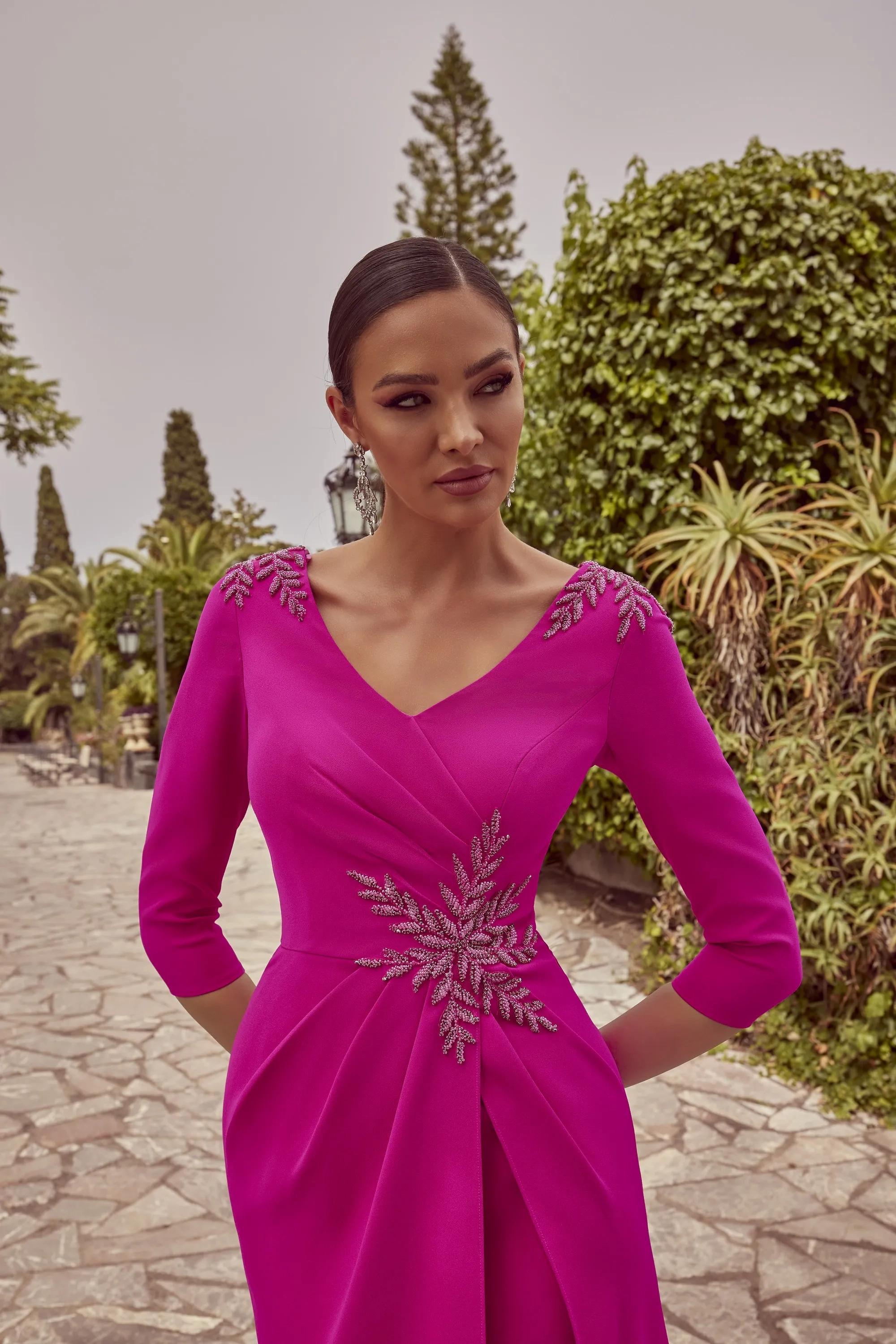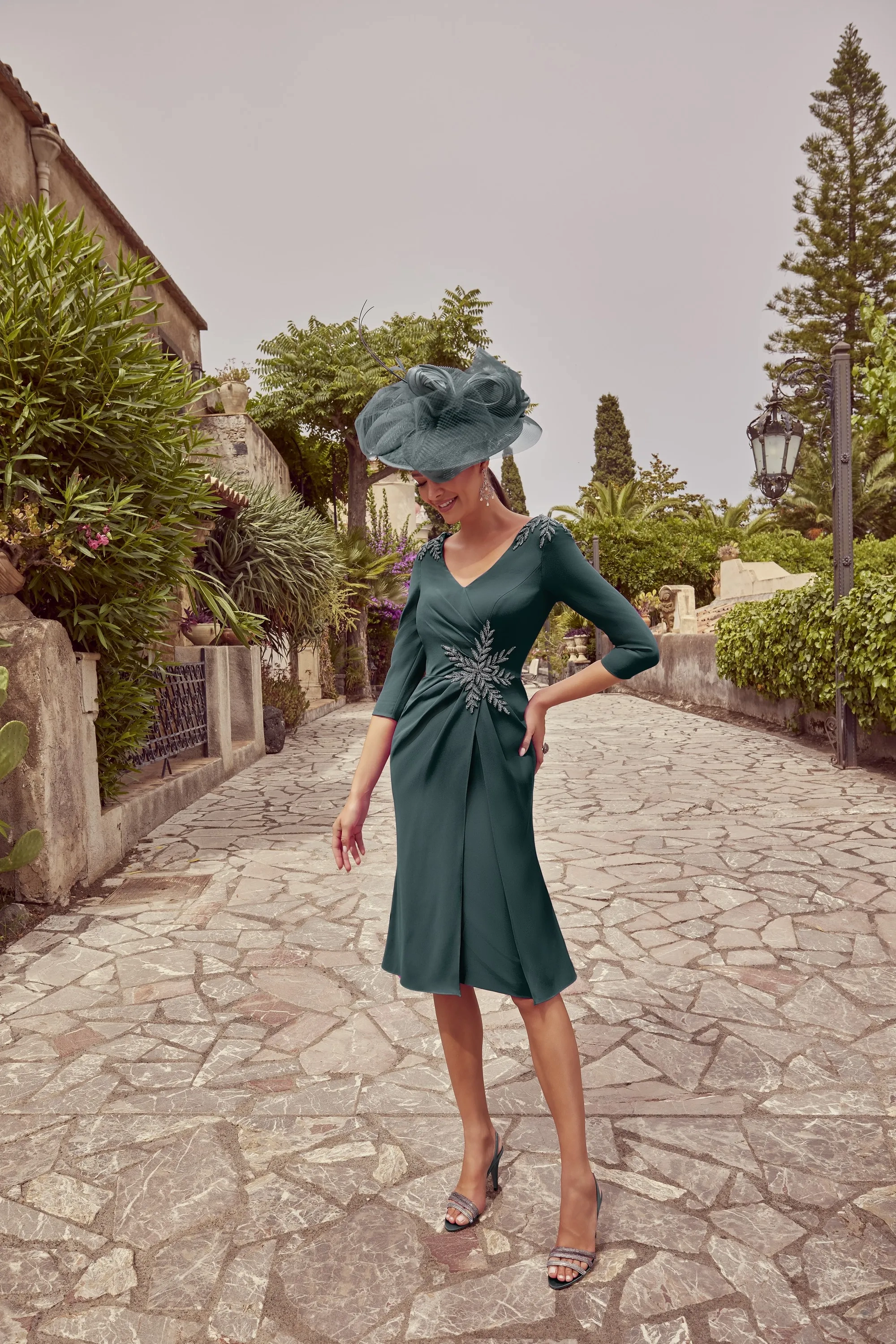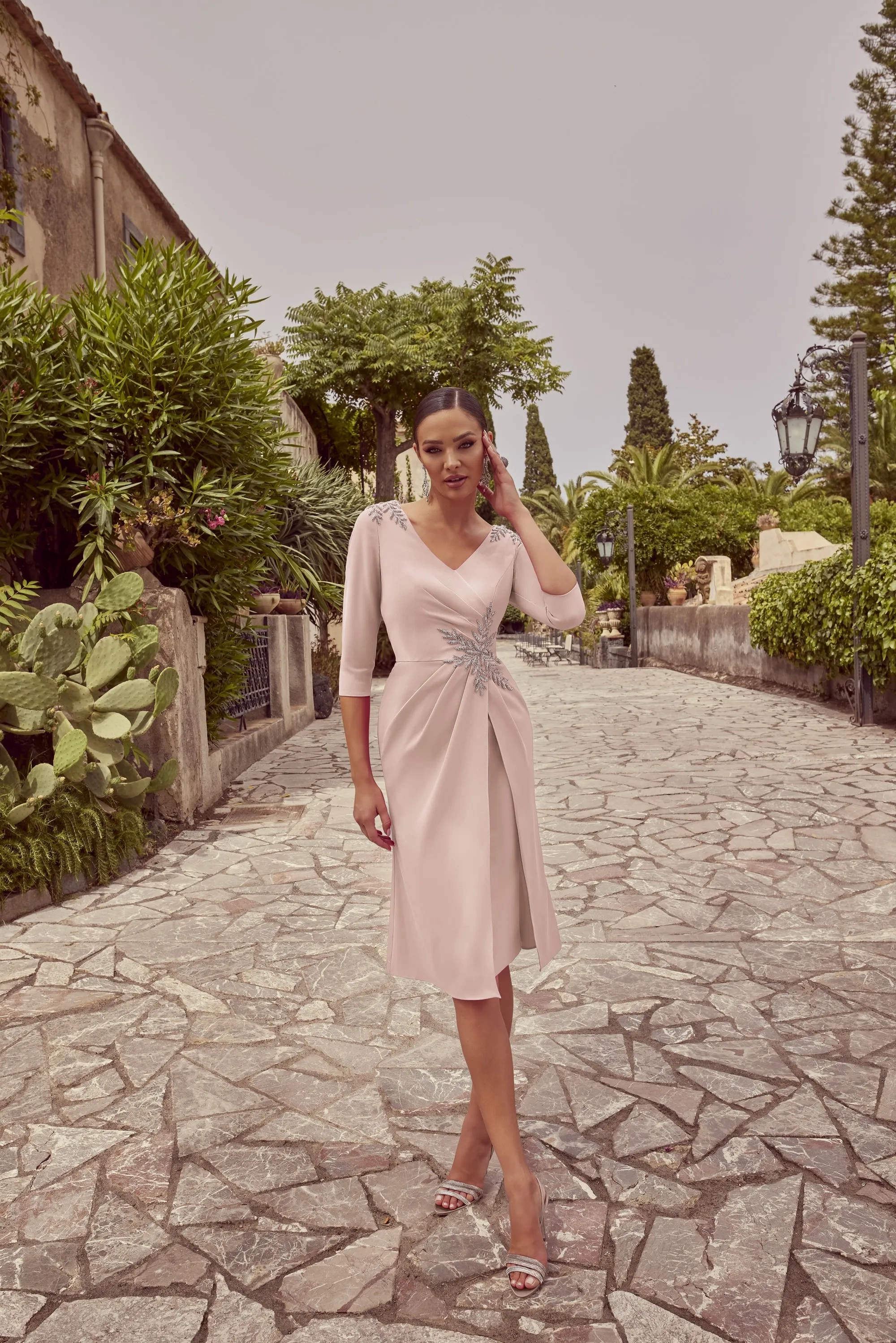 A classic knee length, fit and flare dress, with beaded lace appliques on the shoulder and waist. This dress is complete with 3/4 sleeves and wide v-neckline.