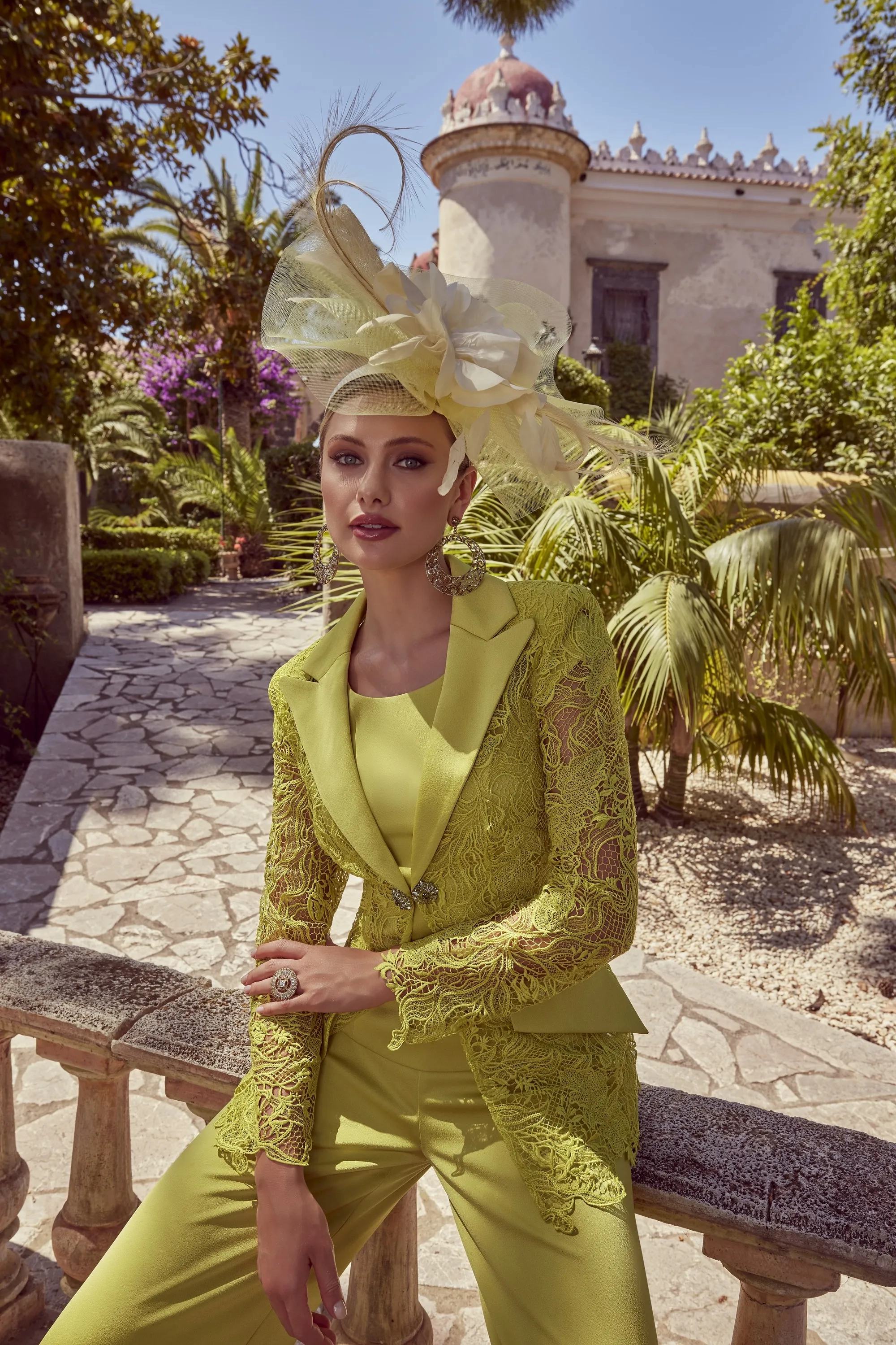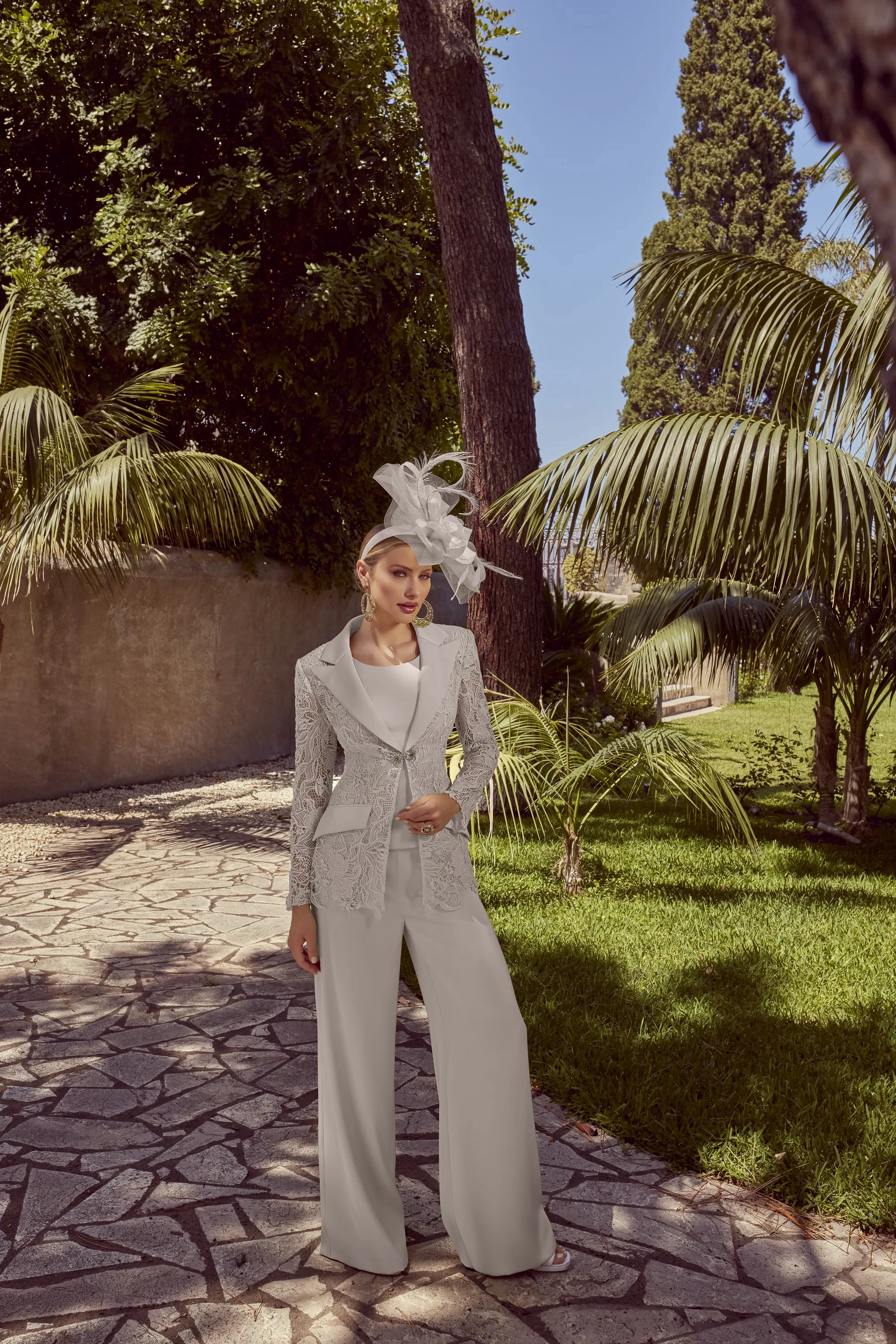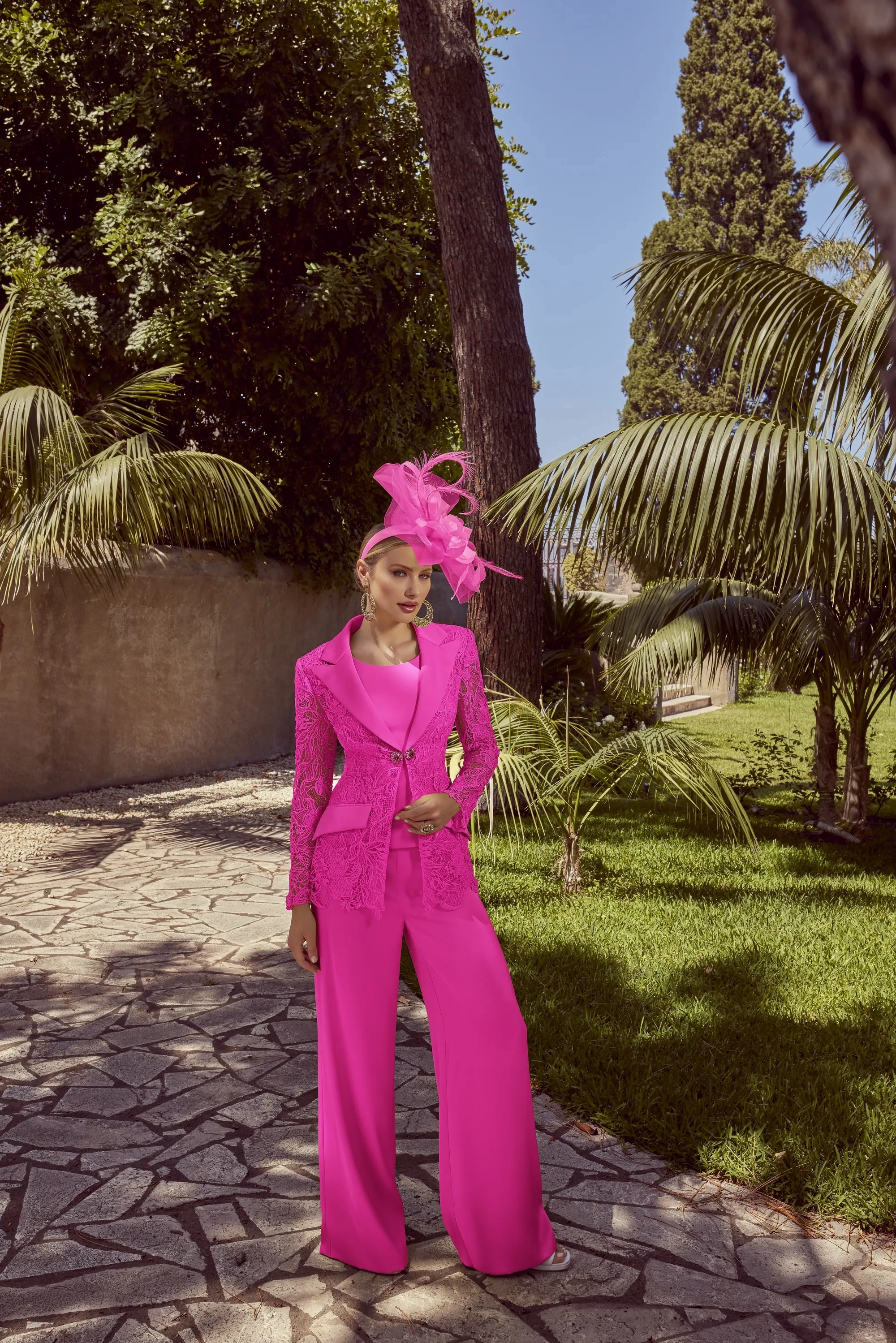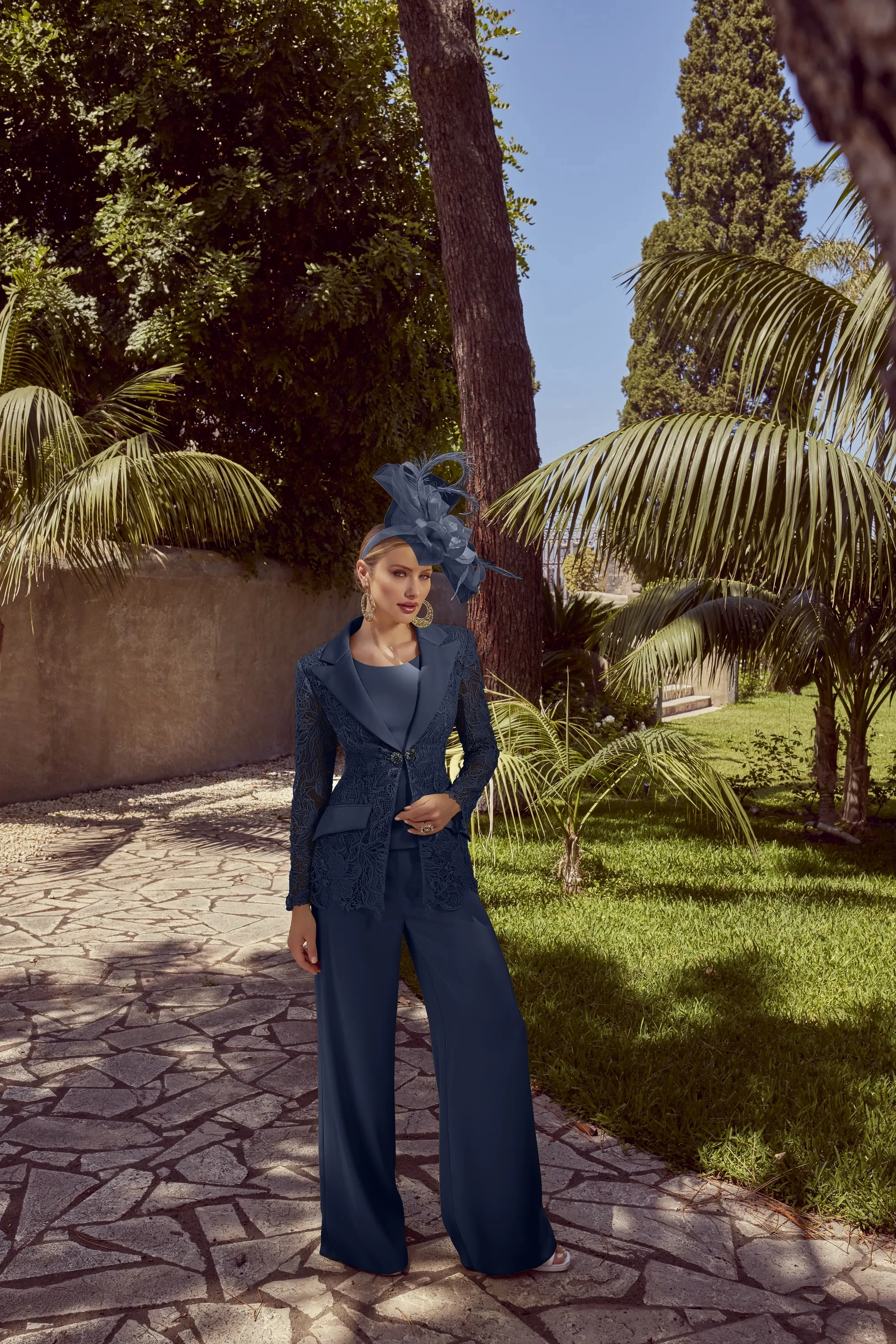 A classic three piece trouser suit, featuring straight leg trousers, a cap sleeve top and lace jacket