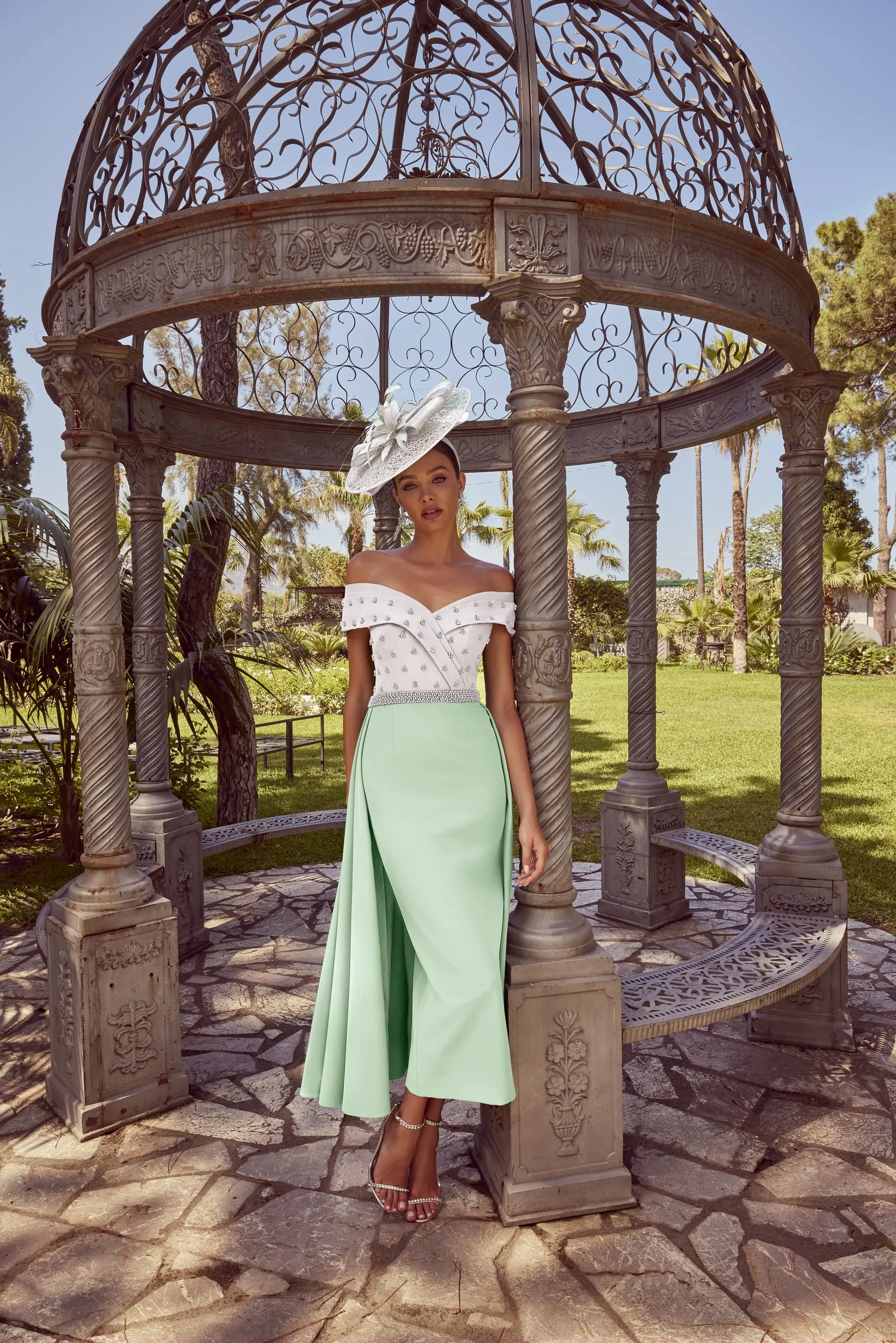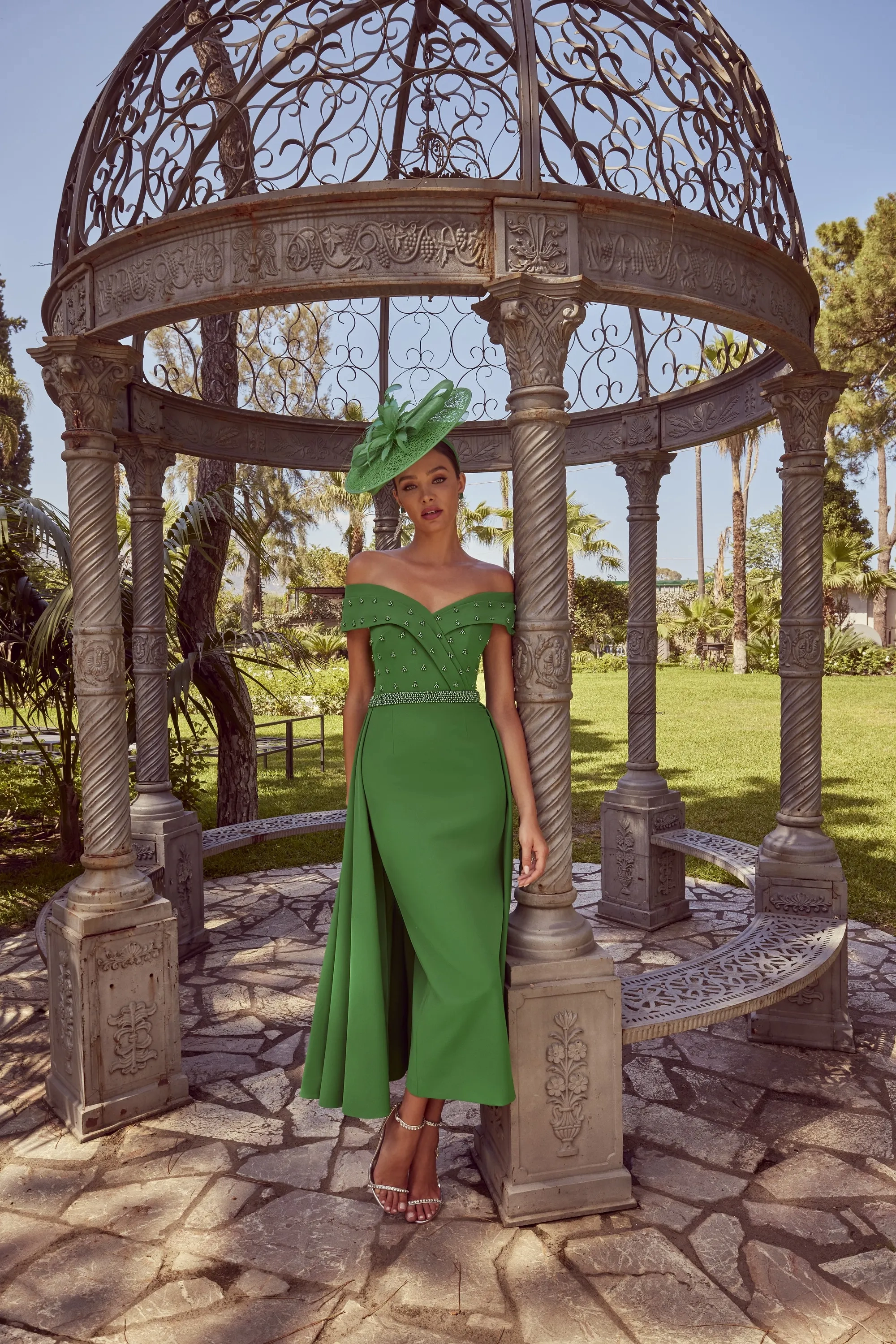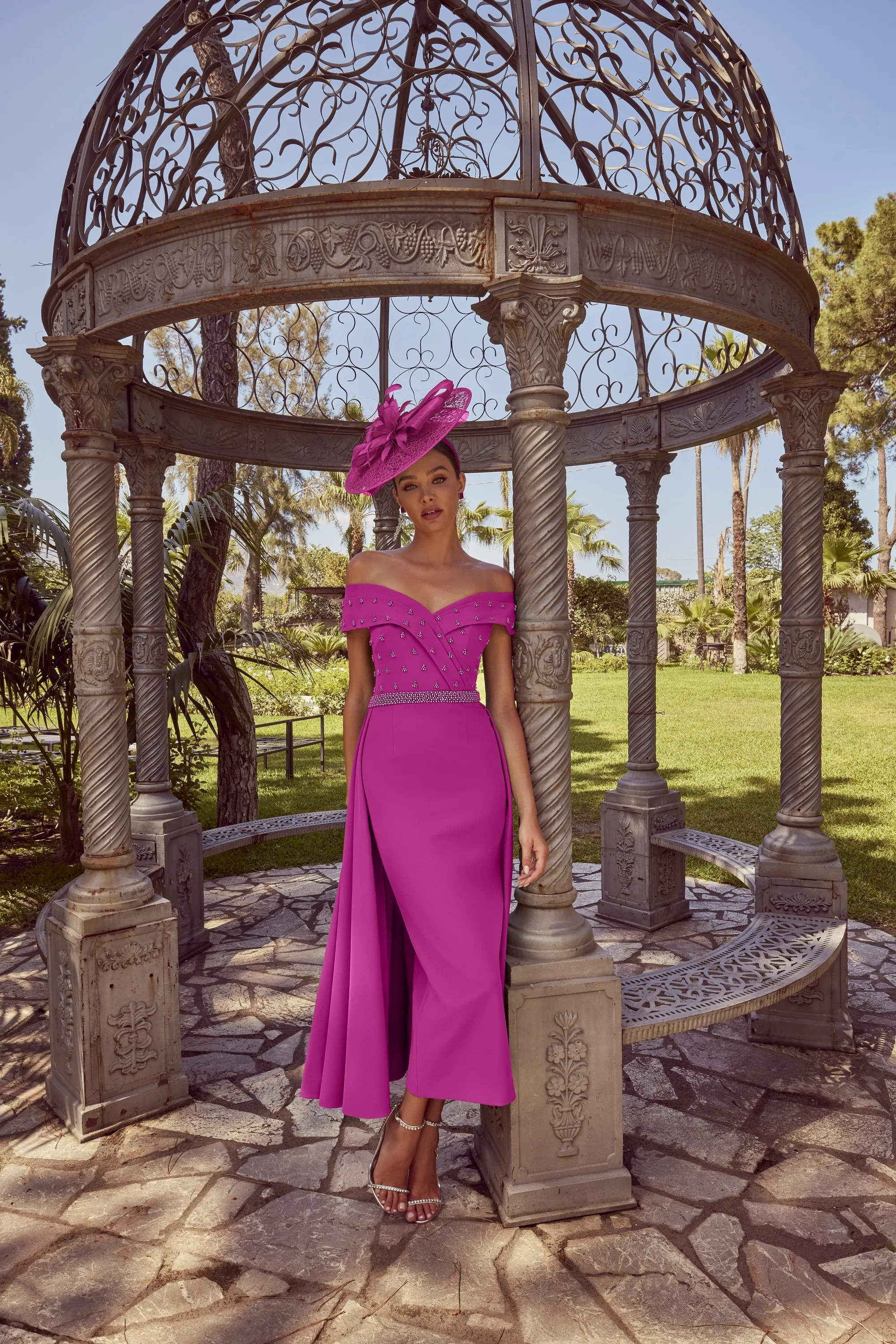 A classic mother of the bride and groom fit and flare crepe dress, featuring a off the shoulder wide v-neckline, with beaded bodice and cap sleeves
