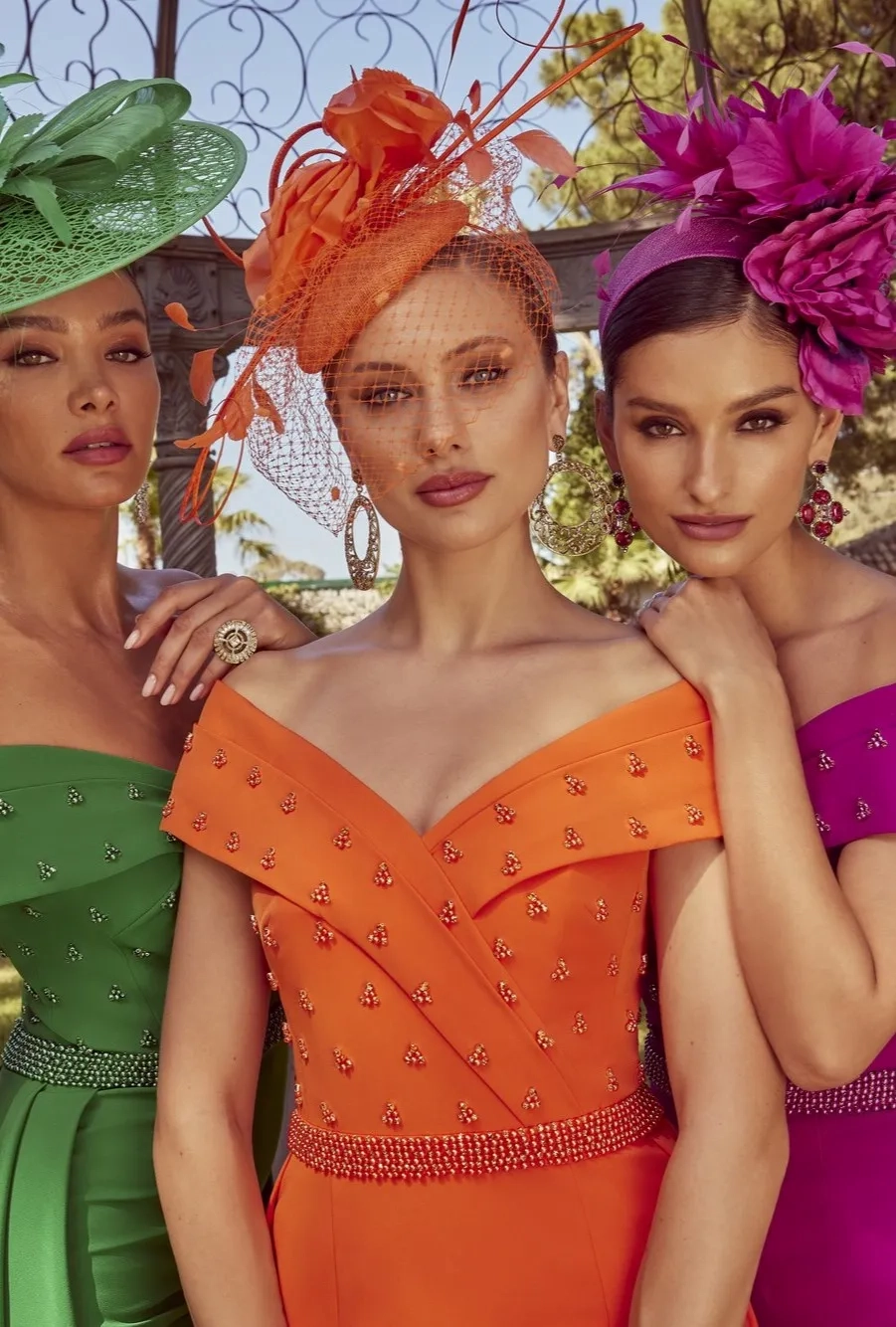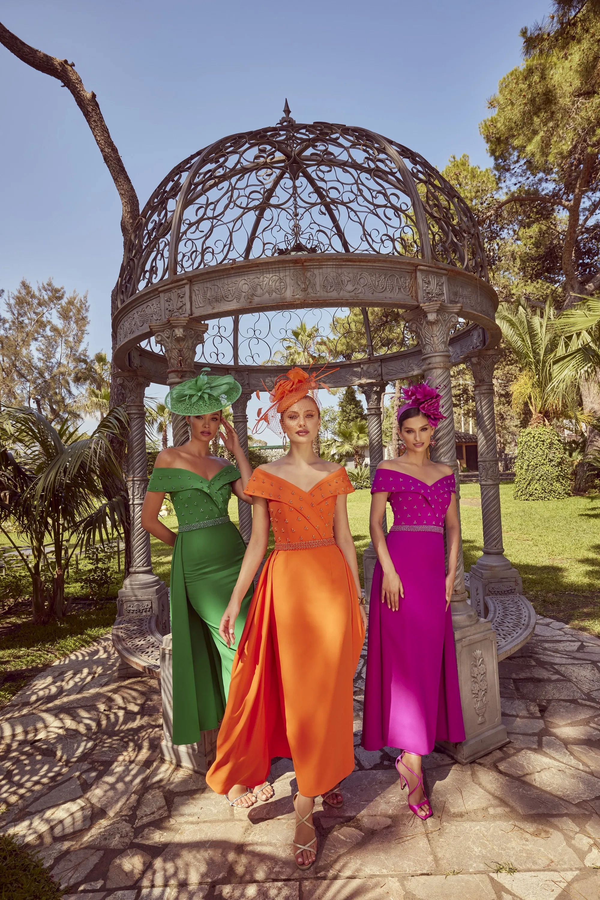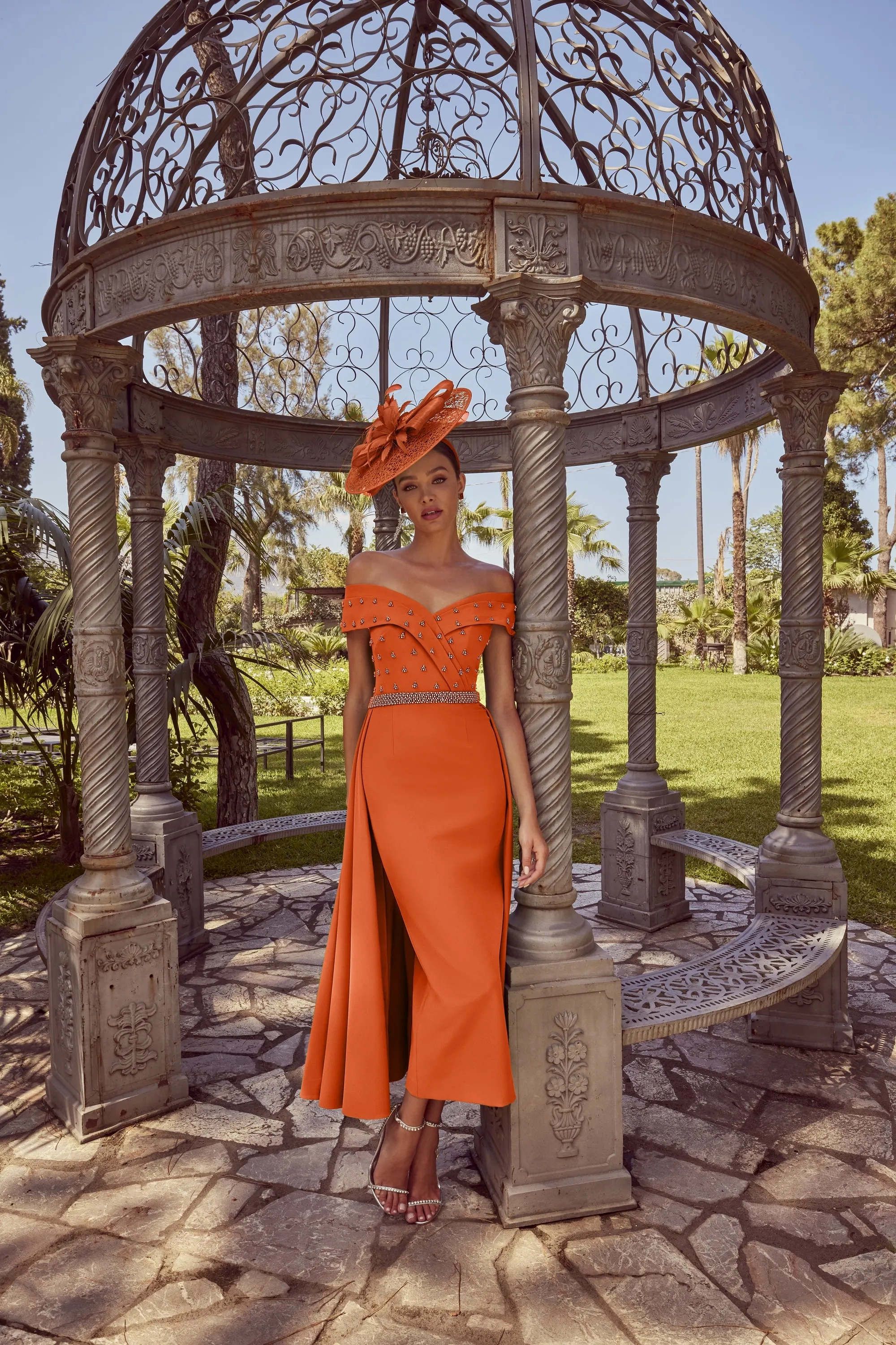 A classic mother of the bride and groom fit and flare crepe dress, featuring a off the shoulder wide v-neckline, with beaded bodice and cap sleeves