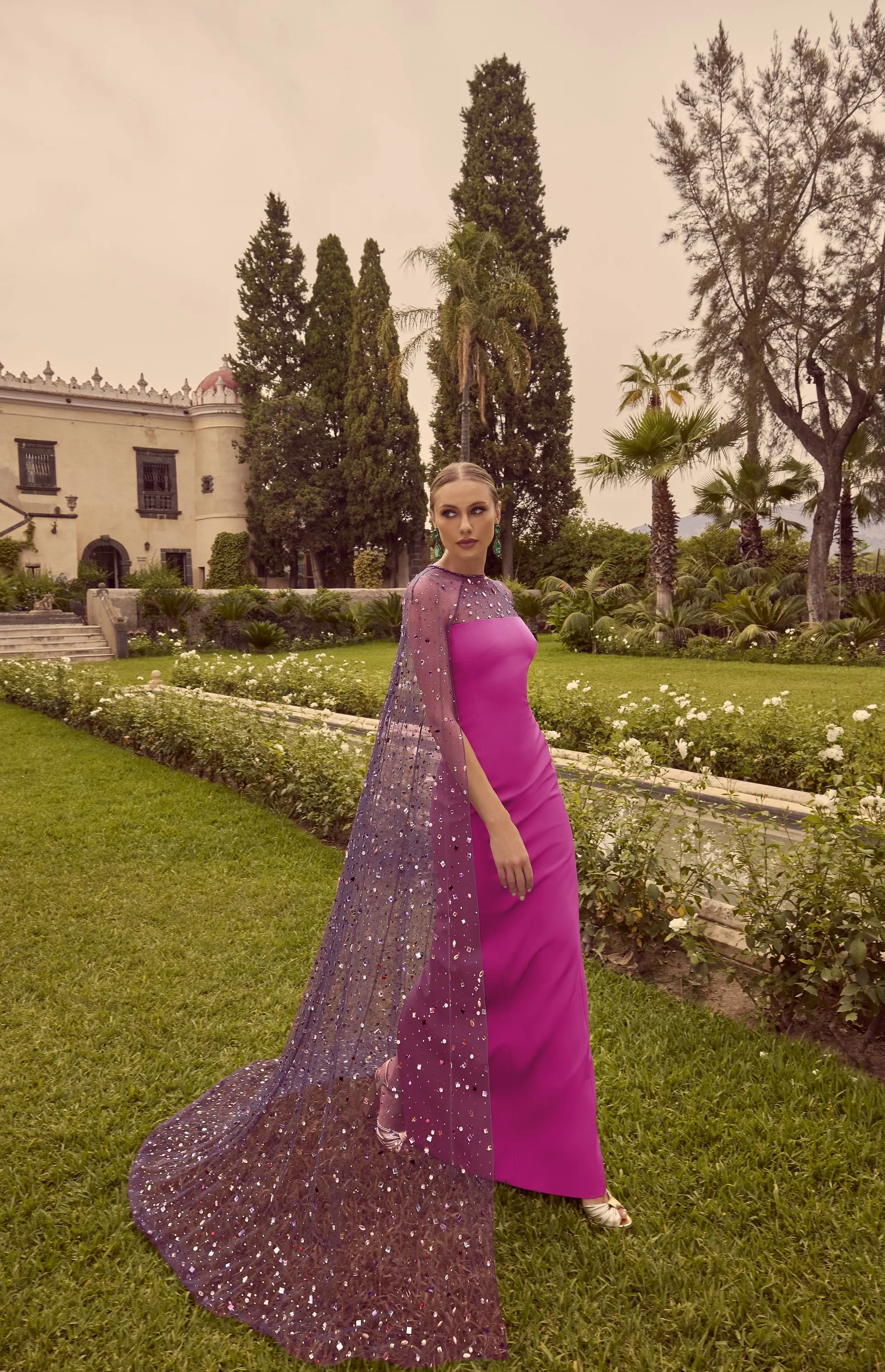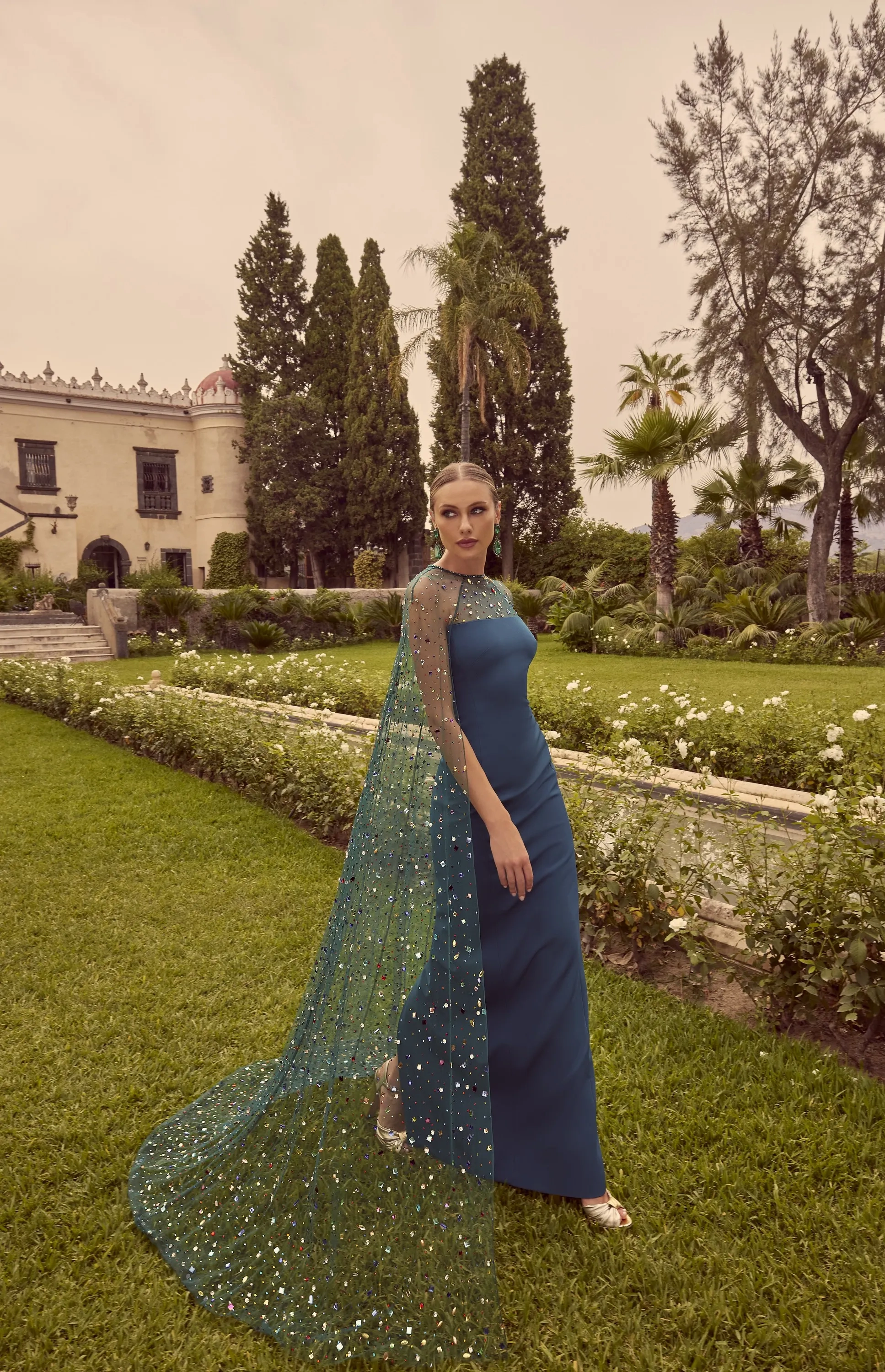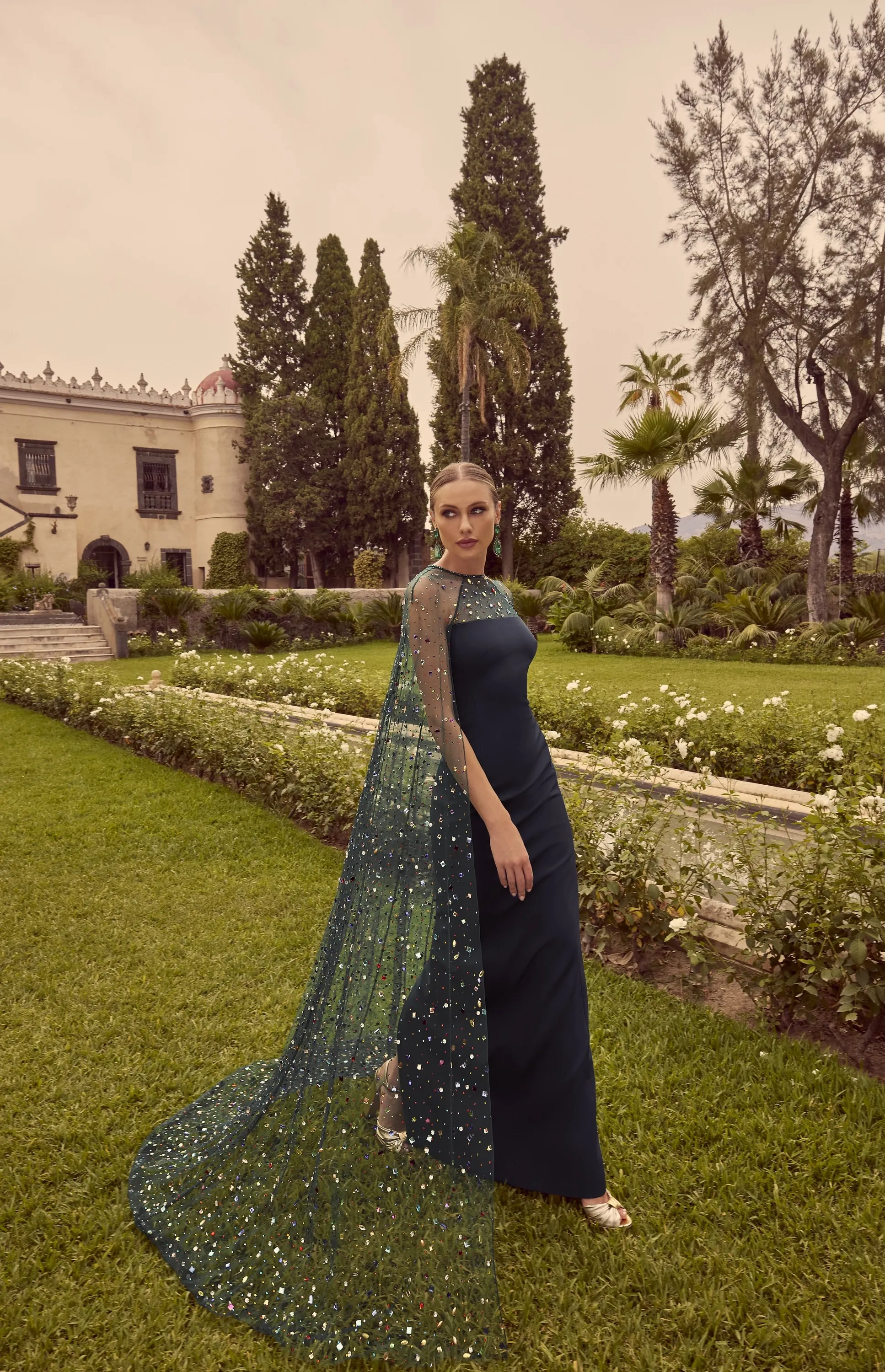 An elegant illusion neckline beaded crepe dress, with a beaded tulle cape. 992464S is a mid-legnth dress. 992464L is a full-legnth dress