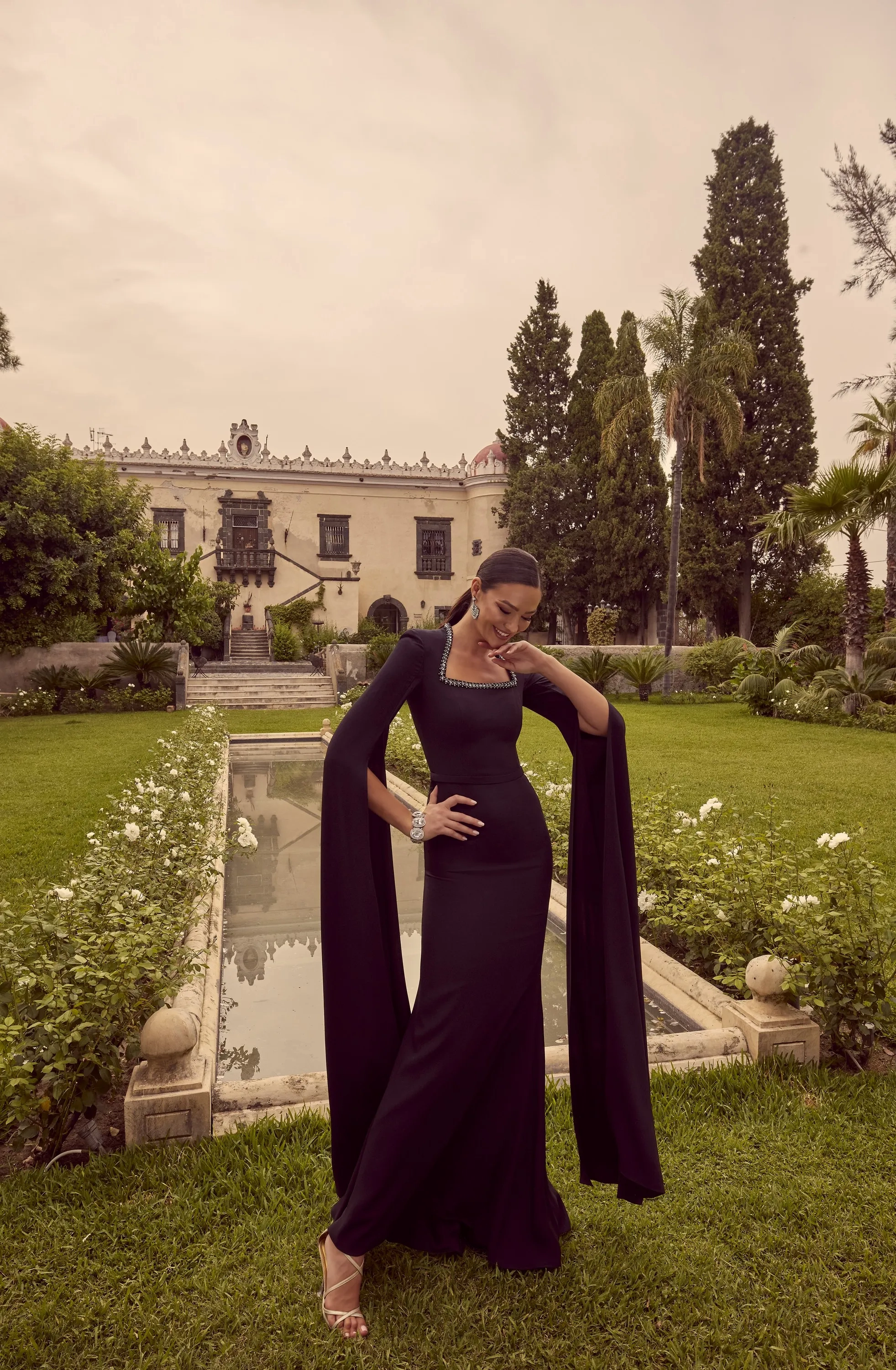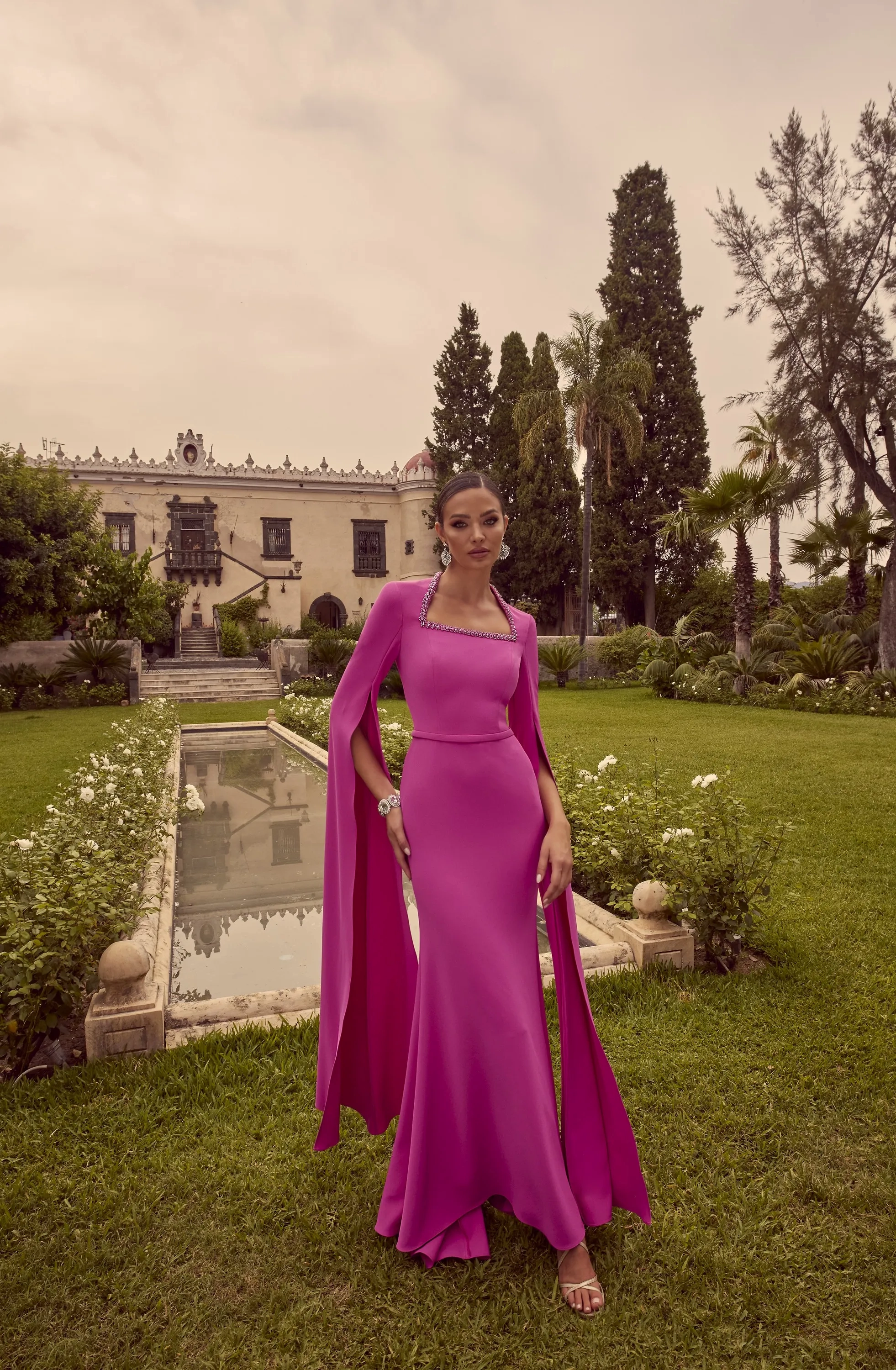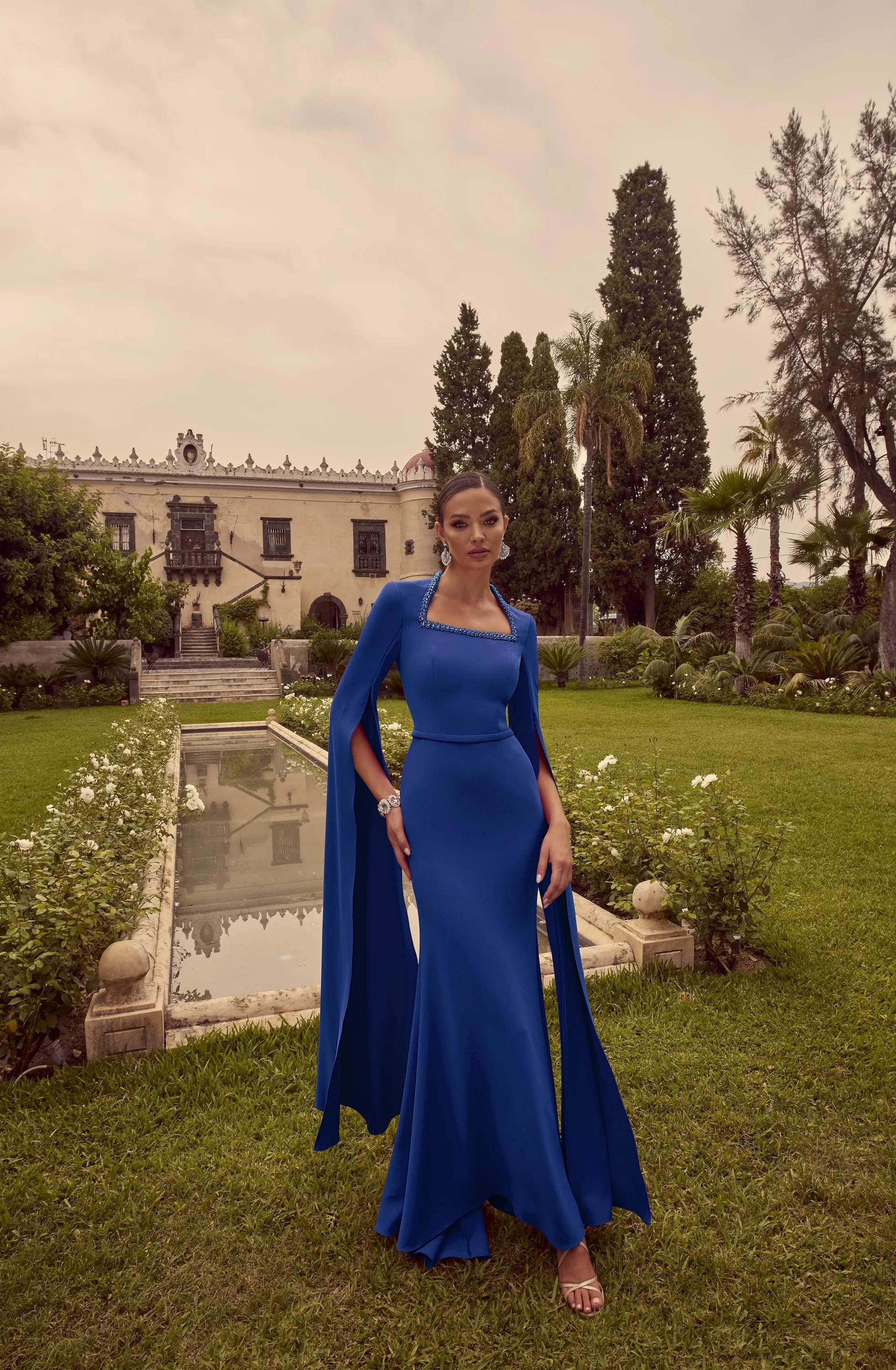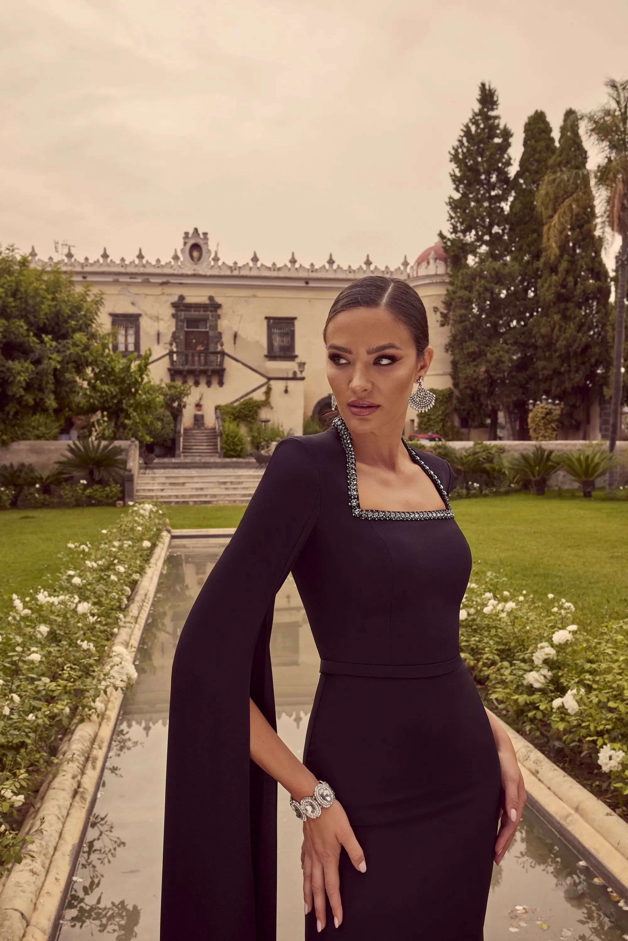 A square mid-lengthneck crepe dress, complete with long cape sleeve and beading on the neckline.