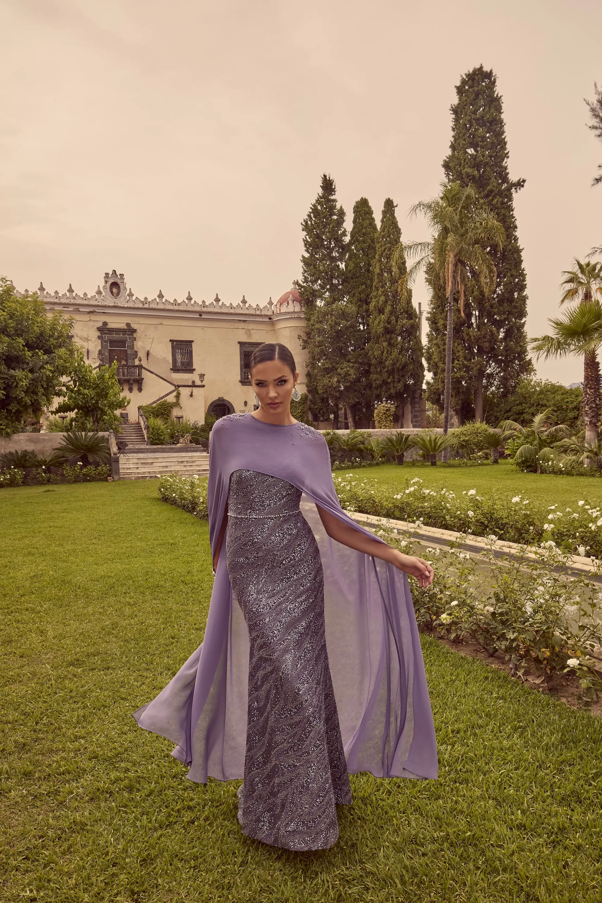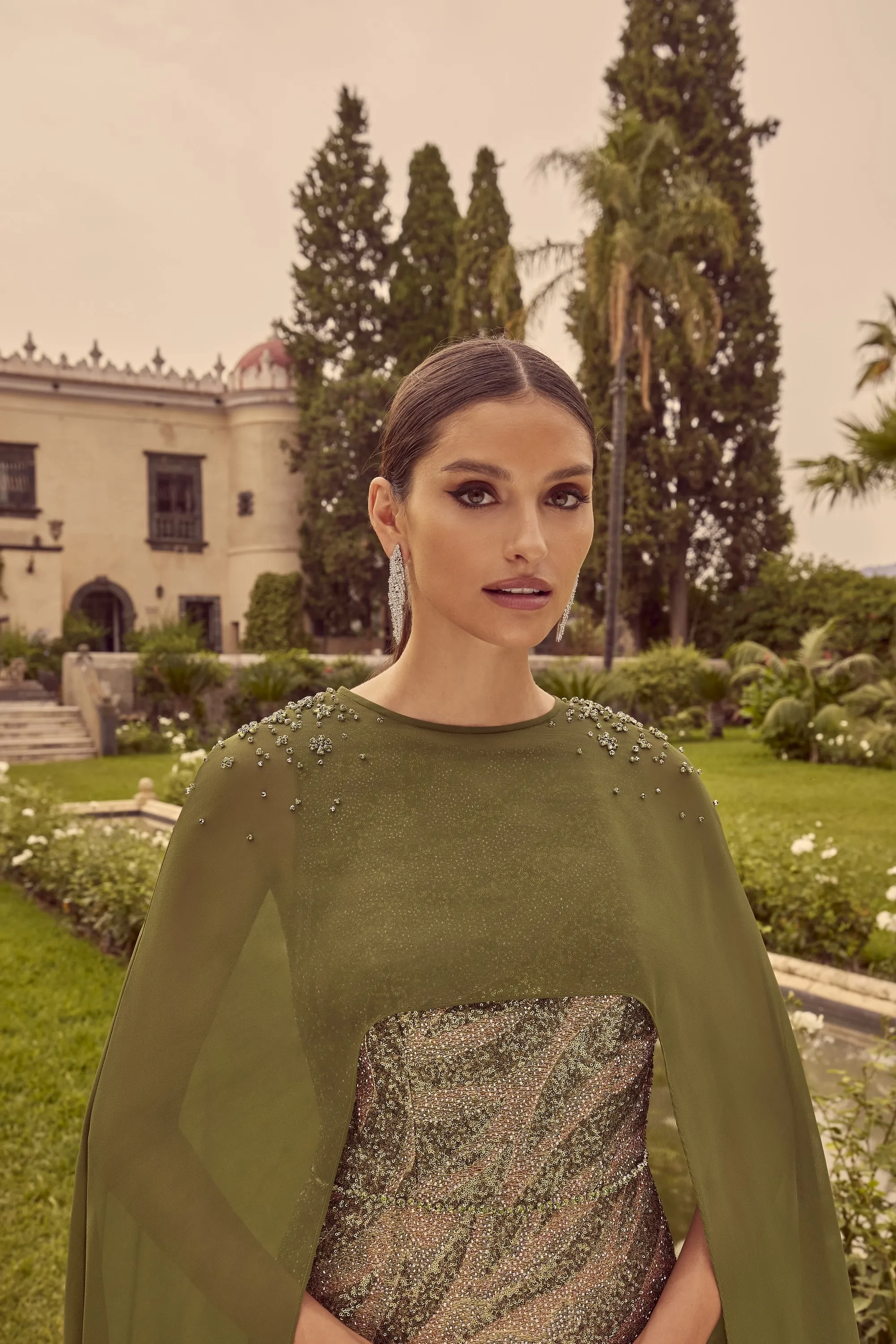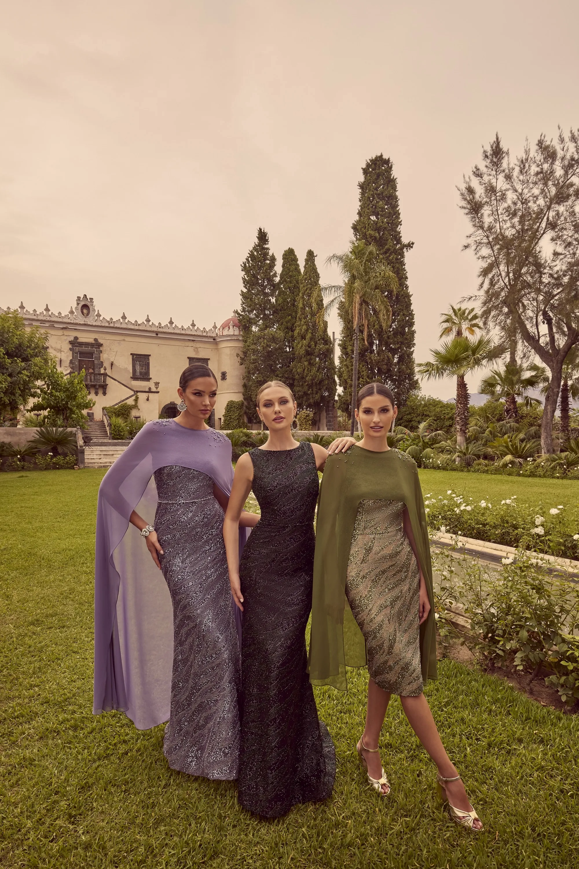 An elegant bateau neckline beaded sequin dress, with a beaded chiffon cape and beaded waist. This fitted dress is perfect for an occasion. 992468AS is mid-length. 992468AL is full-length
