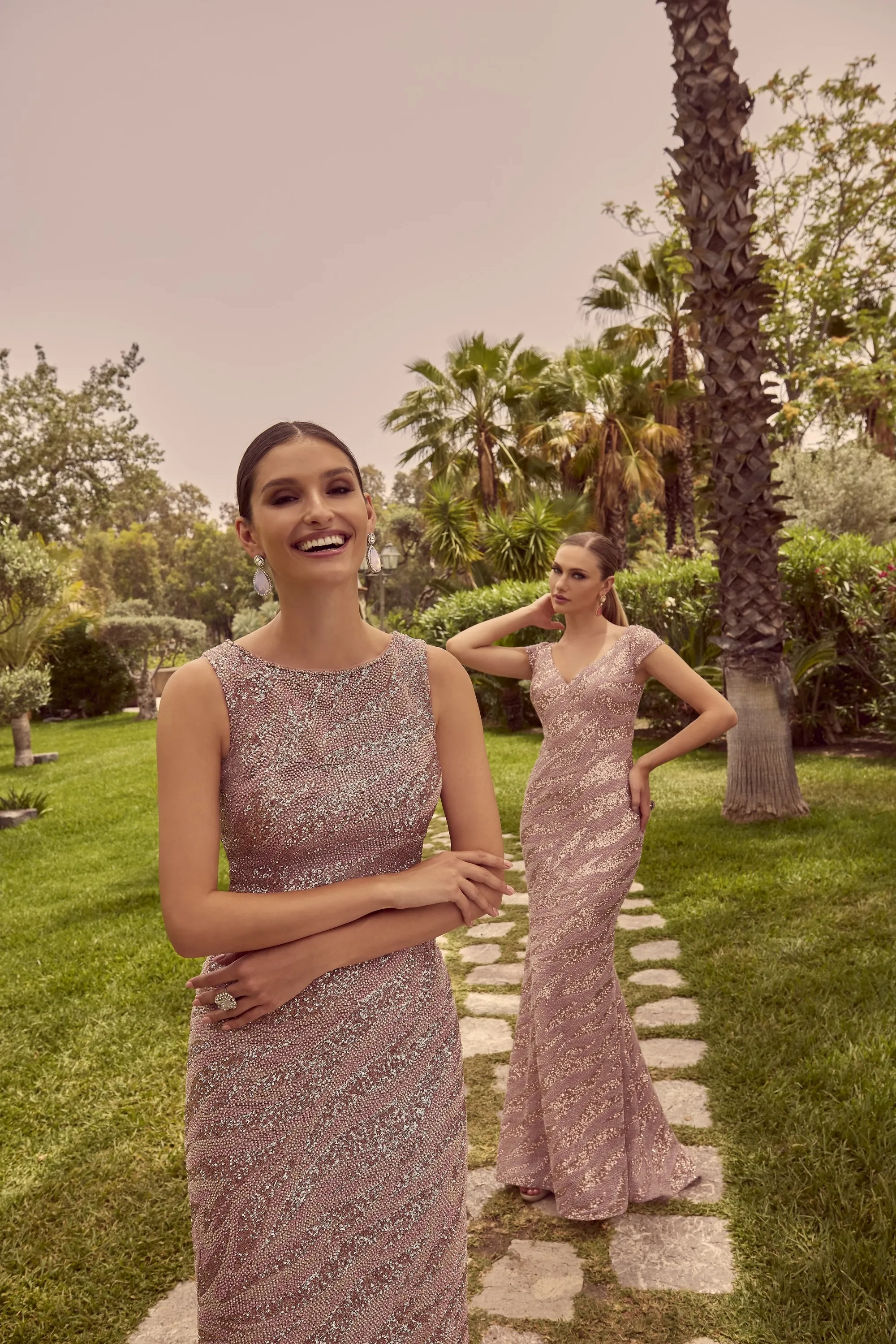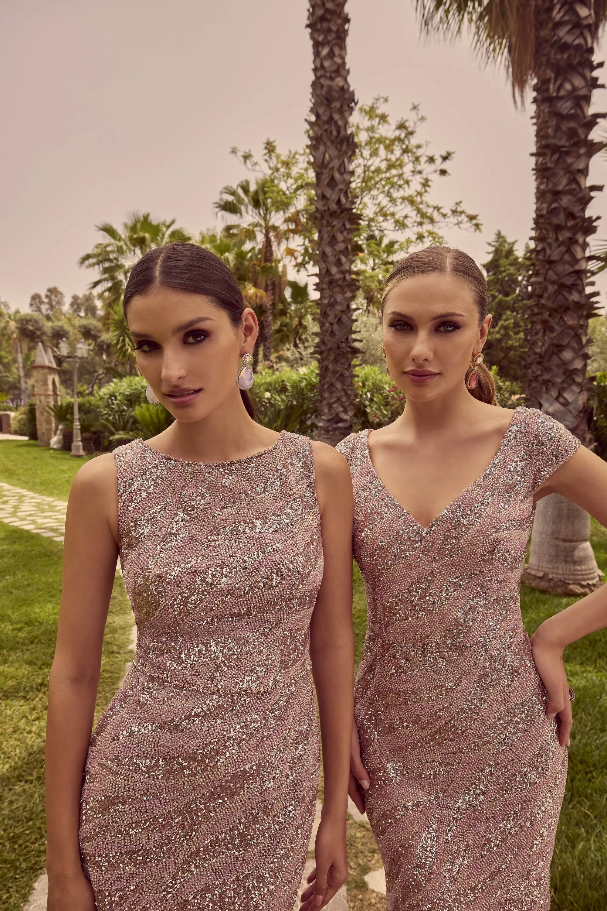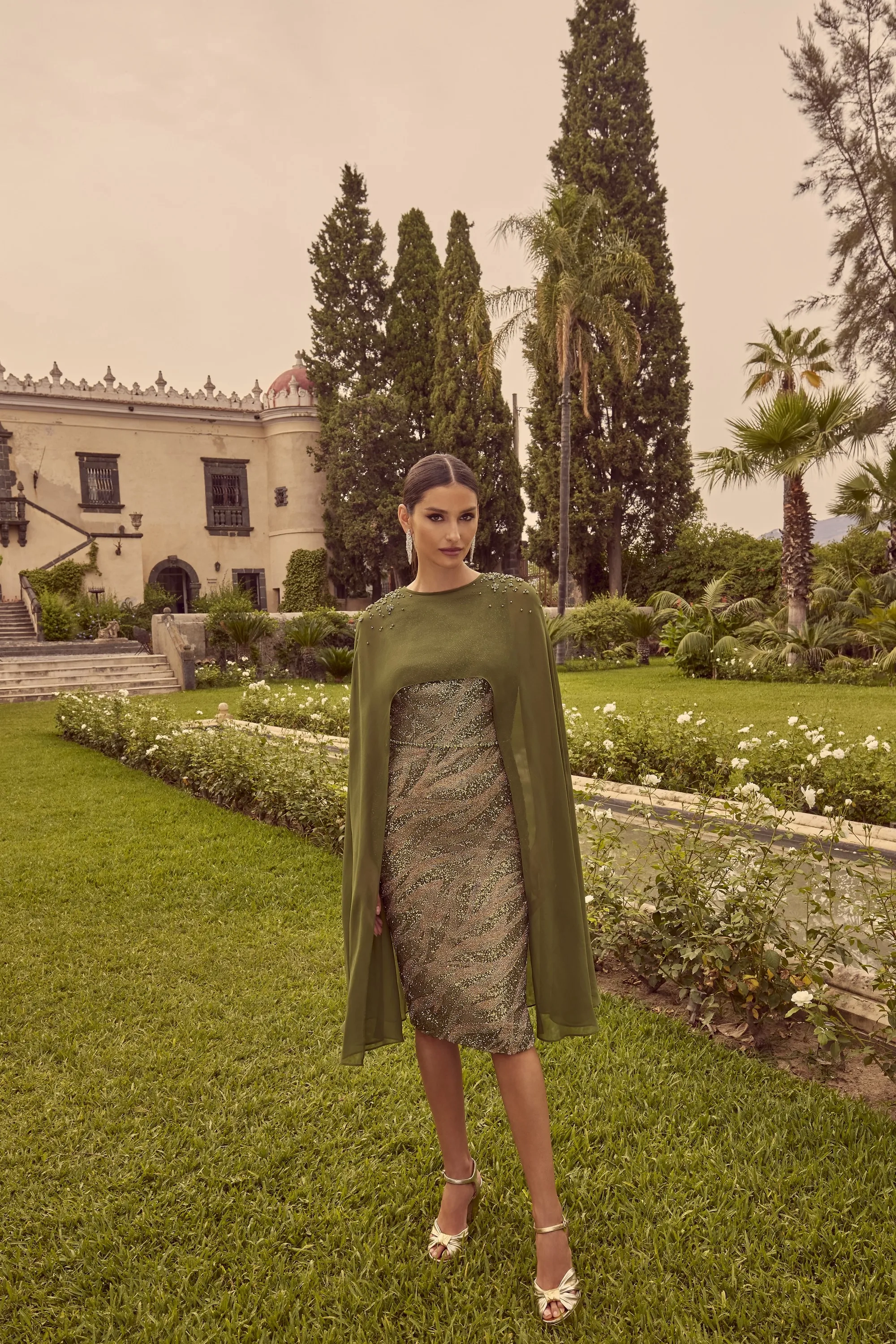 An elegant bateau neckline beaded sequin dress, with a beaded chiffon cape and beaded waist. This fitted dress is perfect for an occasion. 992468AS is mid-length. 992468AL is full-length